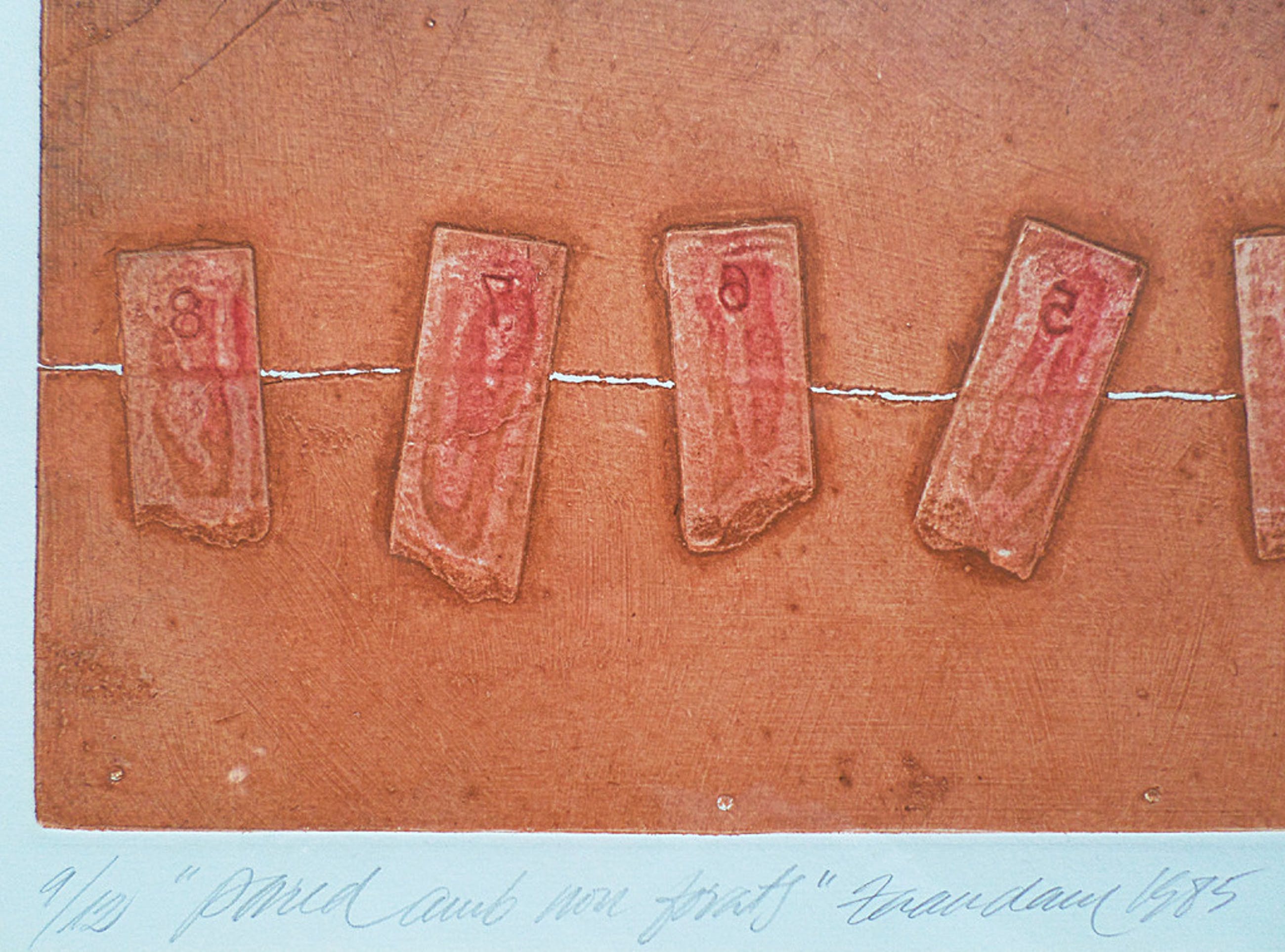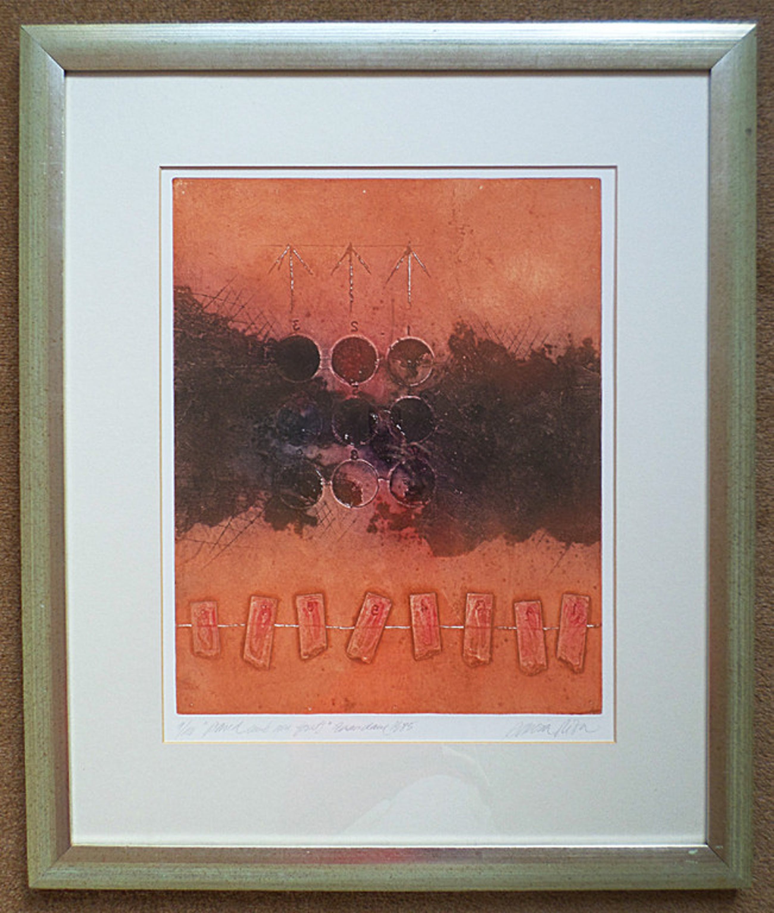 Leuke ets van Adsera Riba uit 1985. De titel staat onder de ets maar kan ik niet met zekerheid ontcijferen. Prachtig ingelijst, achter glas en passe-partout. Handgesigneerd, gedateerd en genummerd. Dit is nummer 9 uit een oplage van slechts 12. Achterop zit nog een stikker met een prijs van 1000 hollandse guldens.