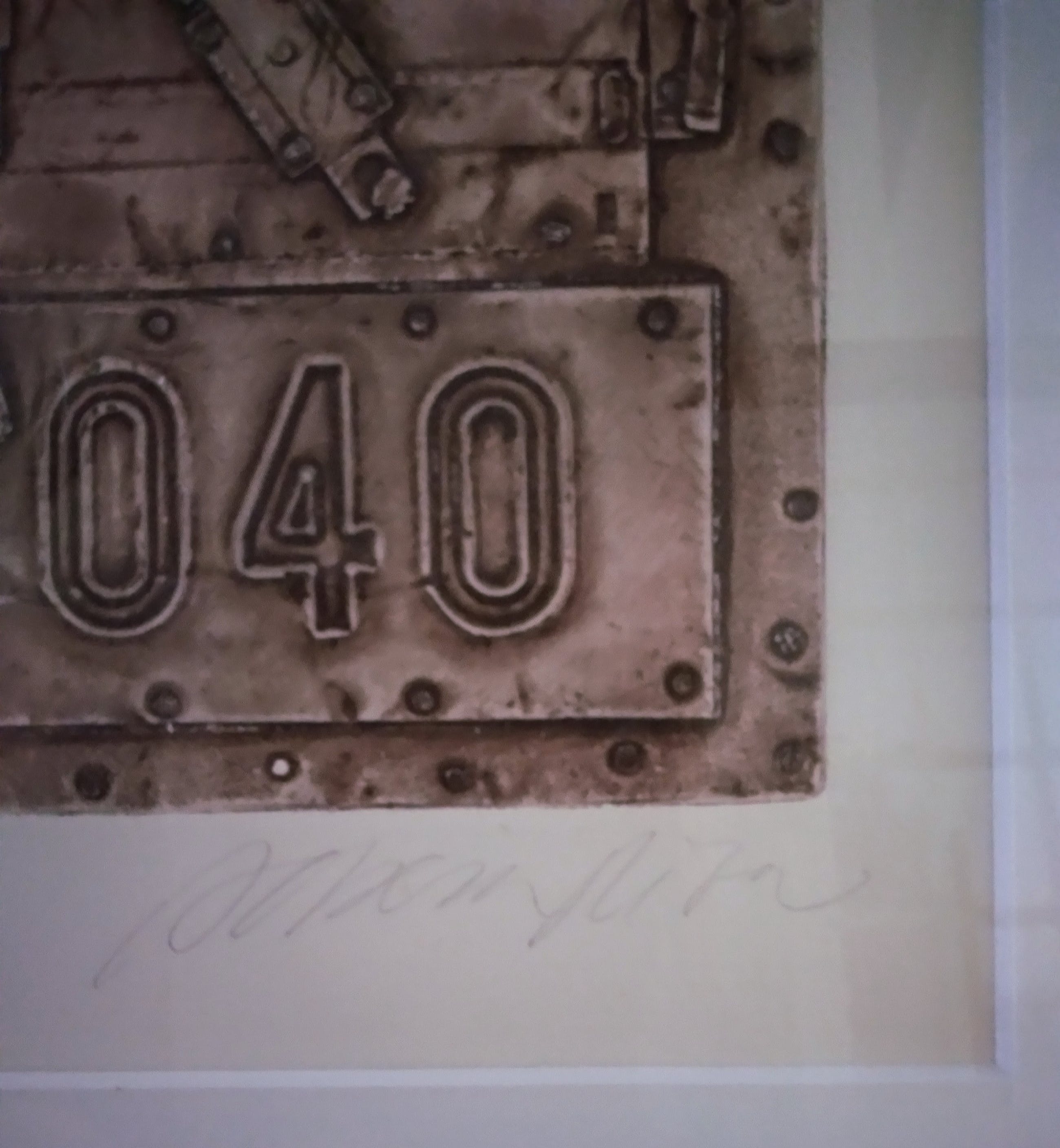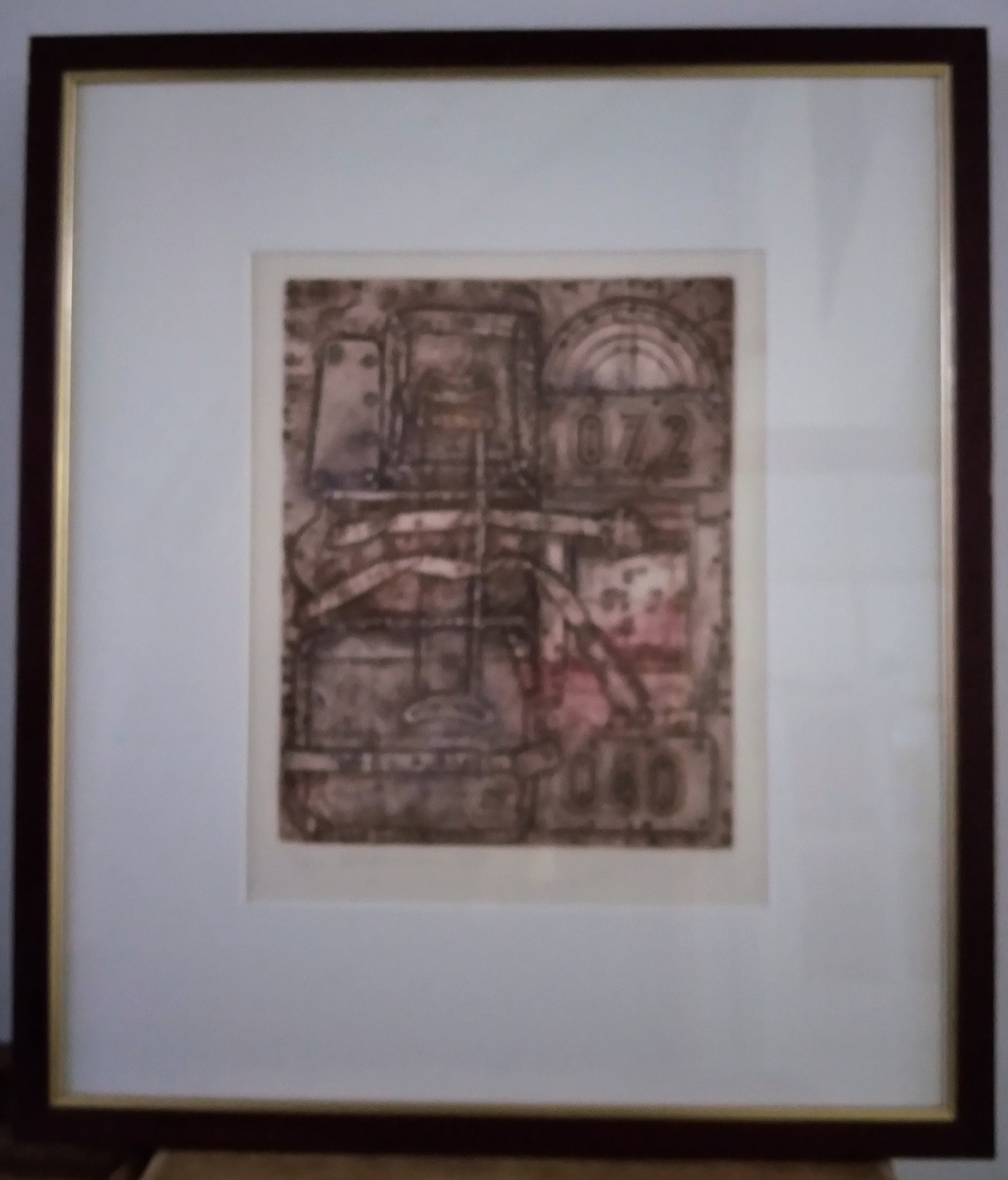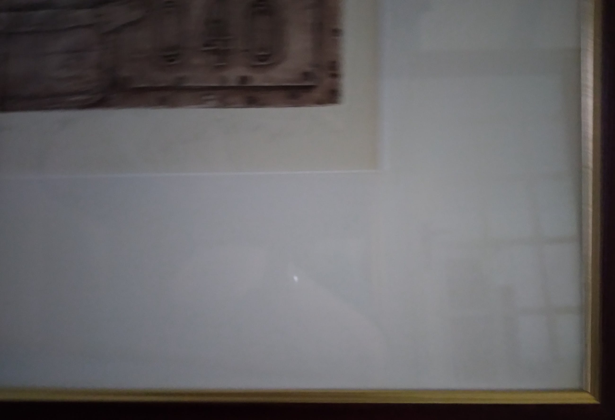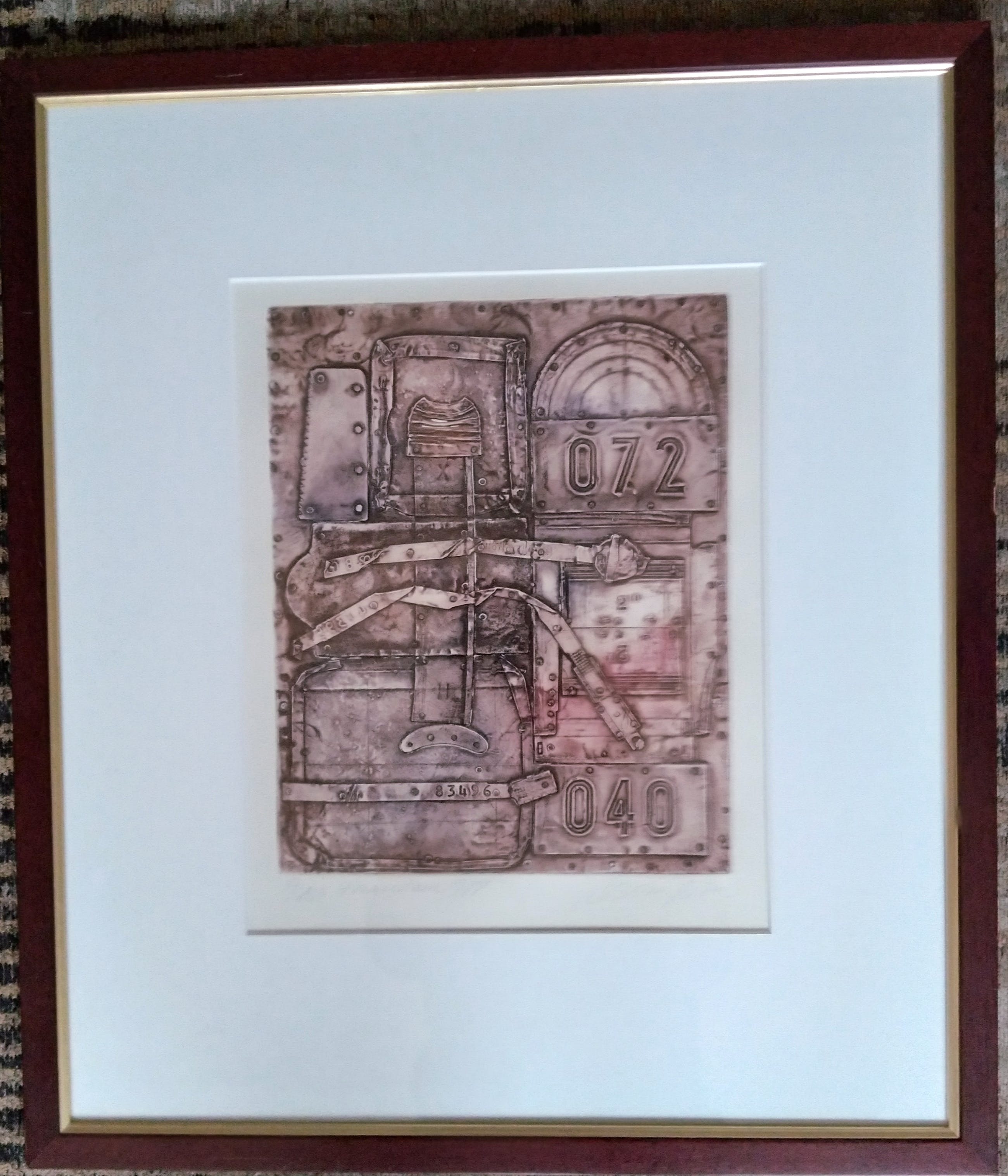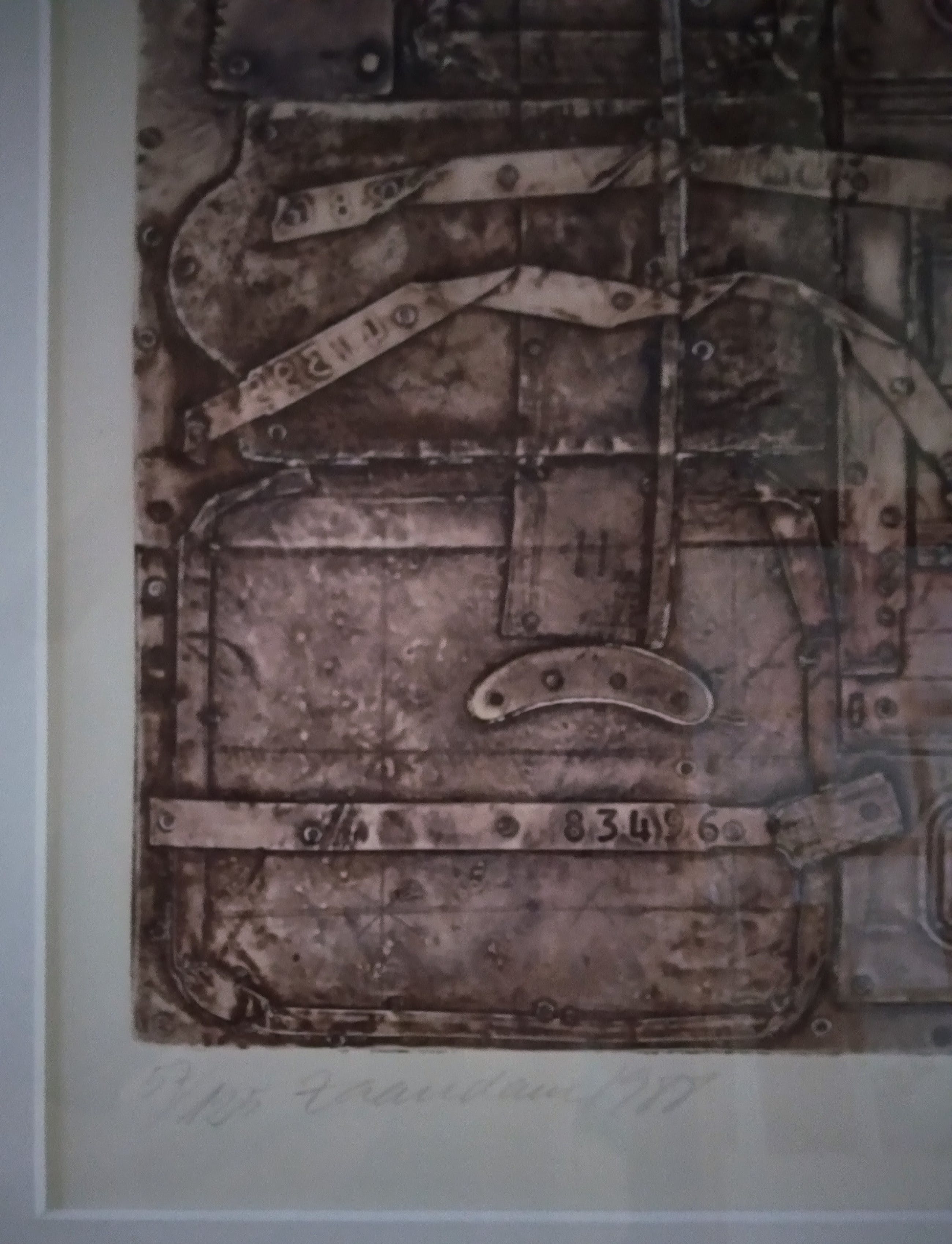 De ets is ingelijst in een bijpassende rood/bruine lijst. Deze heeft wat gebruikerssporen maar kan zo aan de wand. Professioneel ingelijst. Afmetingen ca: 34 h x 28 b cm, incl. lijst: 60 h x 52 b cm De ets is in uitstekende conditie.
