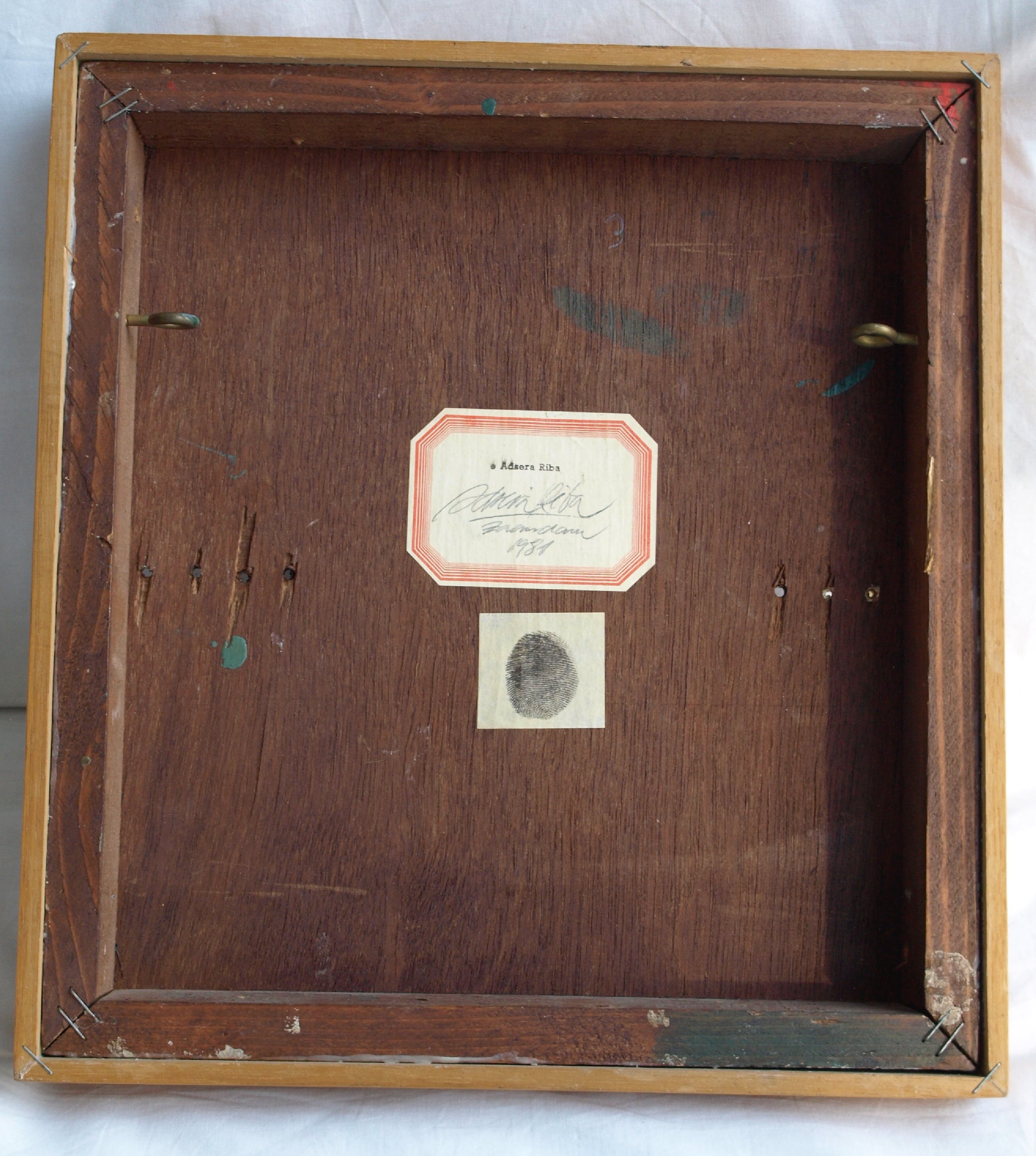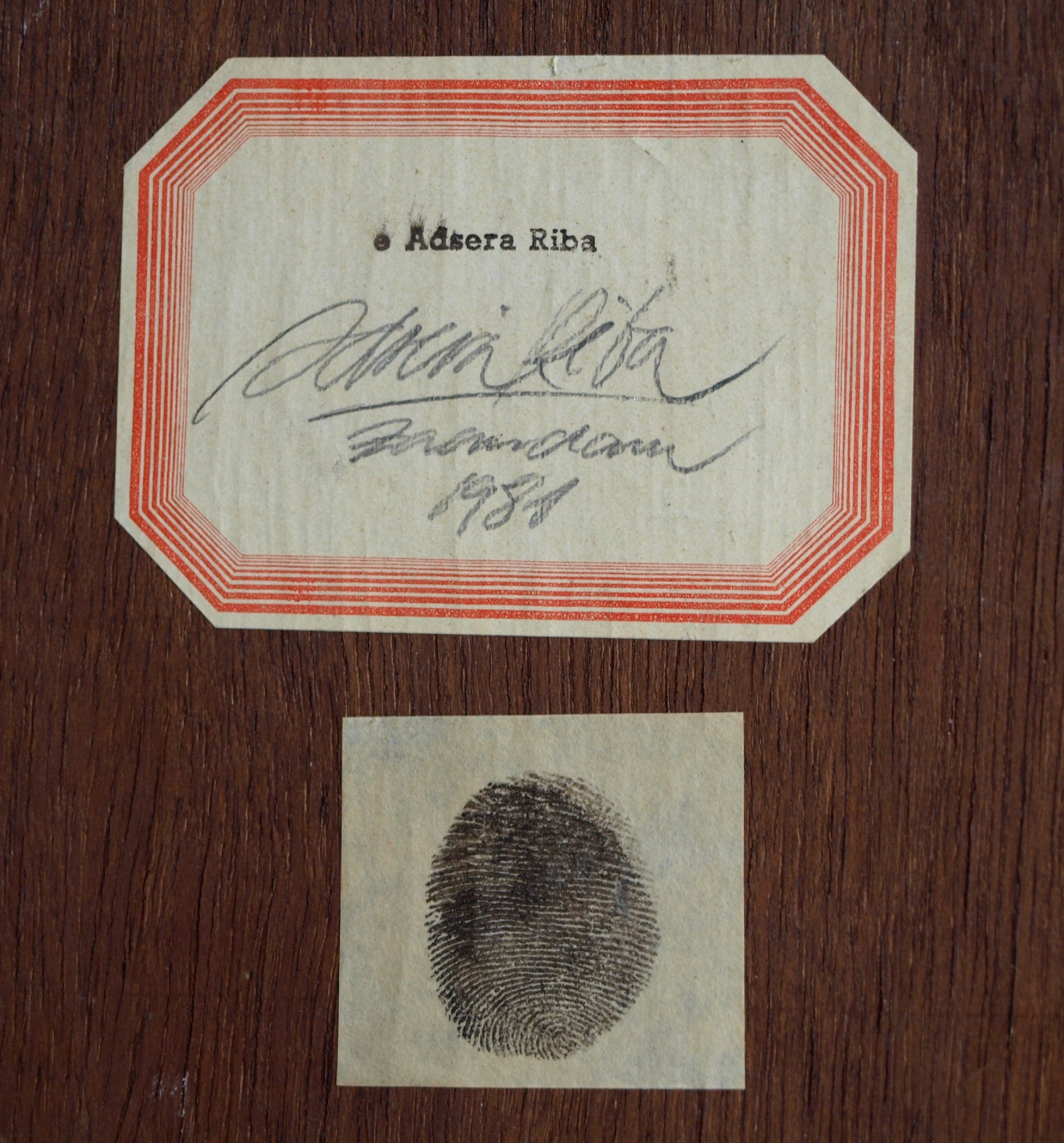 -Gesigneerd en gedateerd rechtsonder met potlood en drukinkt en ook gesigneerd, gedateerd en voorzien van de vingerafdruk van de kunstenaar op de achterkant van het paneel.