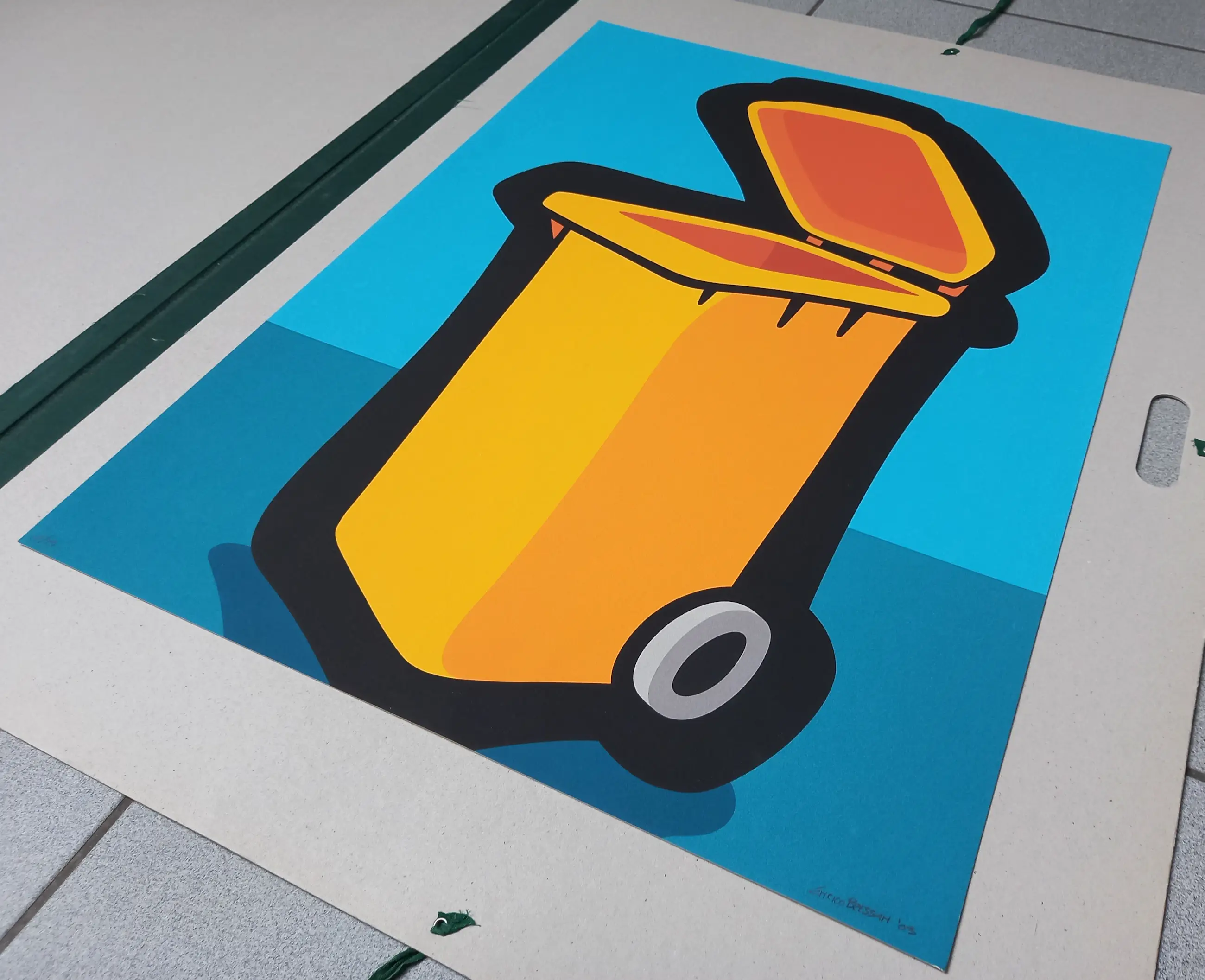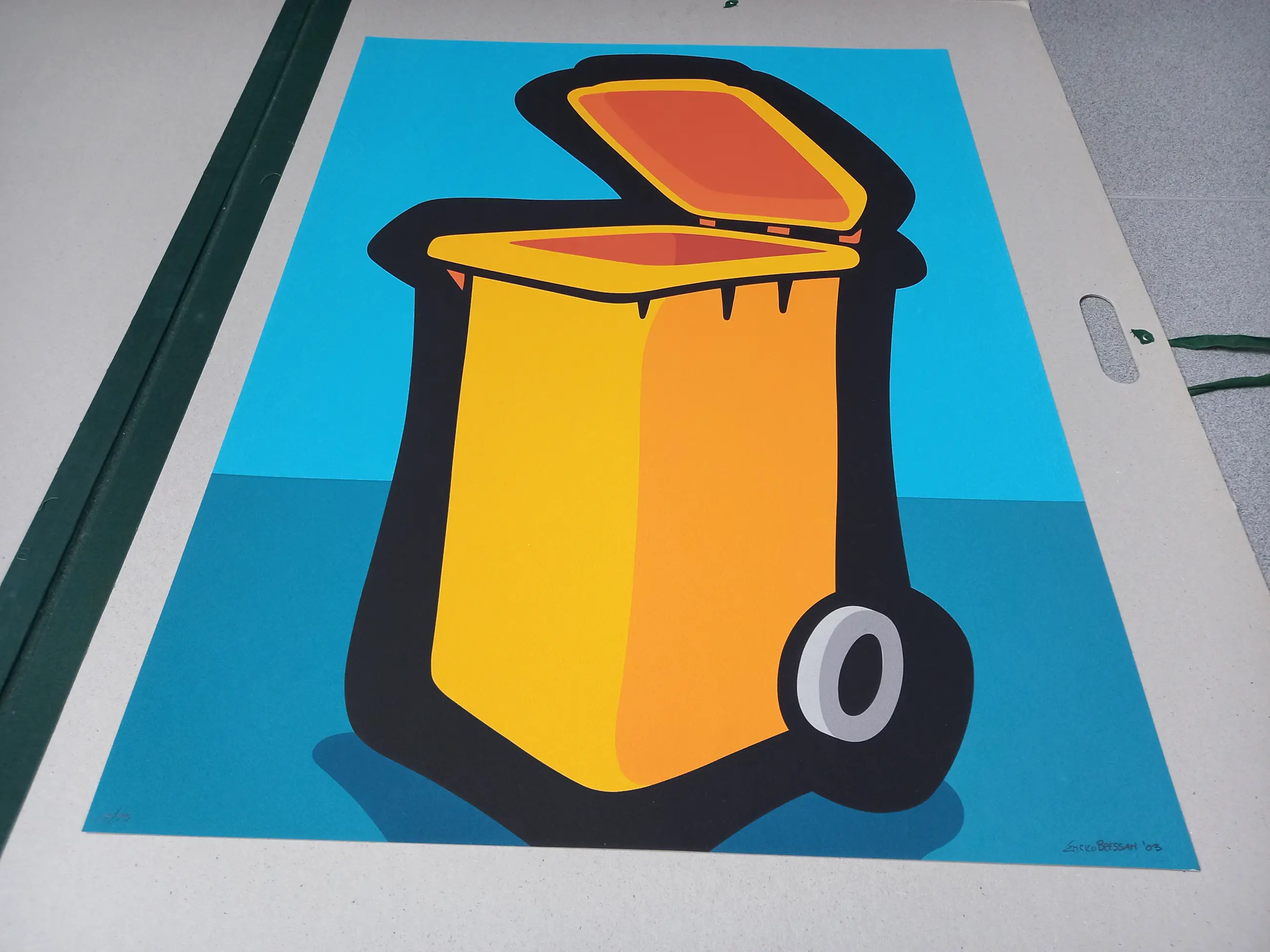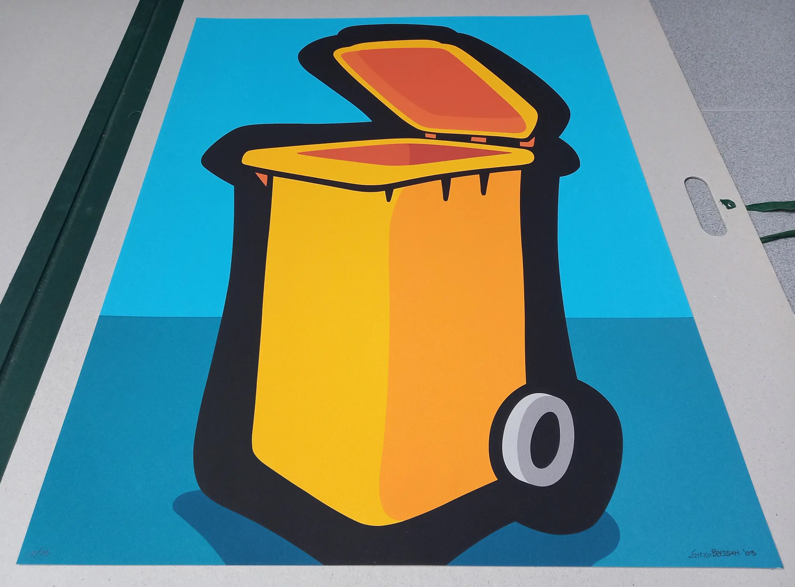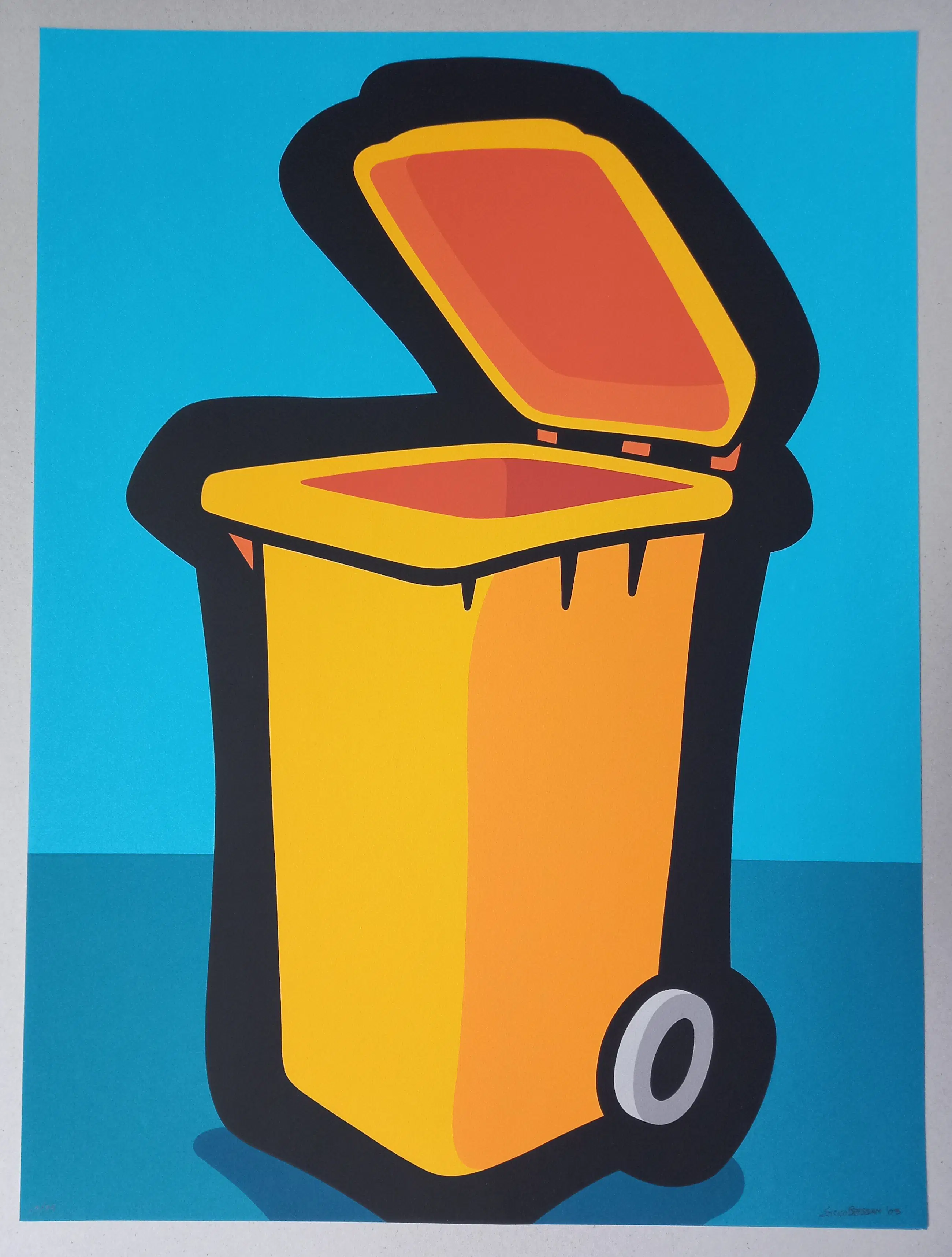 Kleurrijke "Italian Pop Art" graphic getiteld "Cubo de Basura" van de Italiaanse kunstenaar Enrico Bressan.