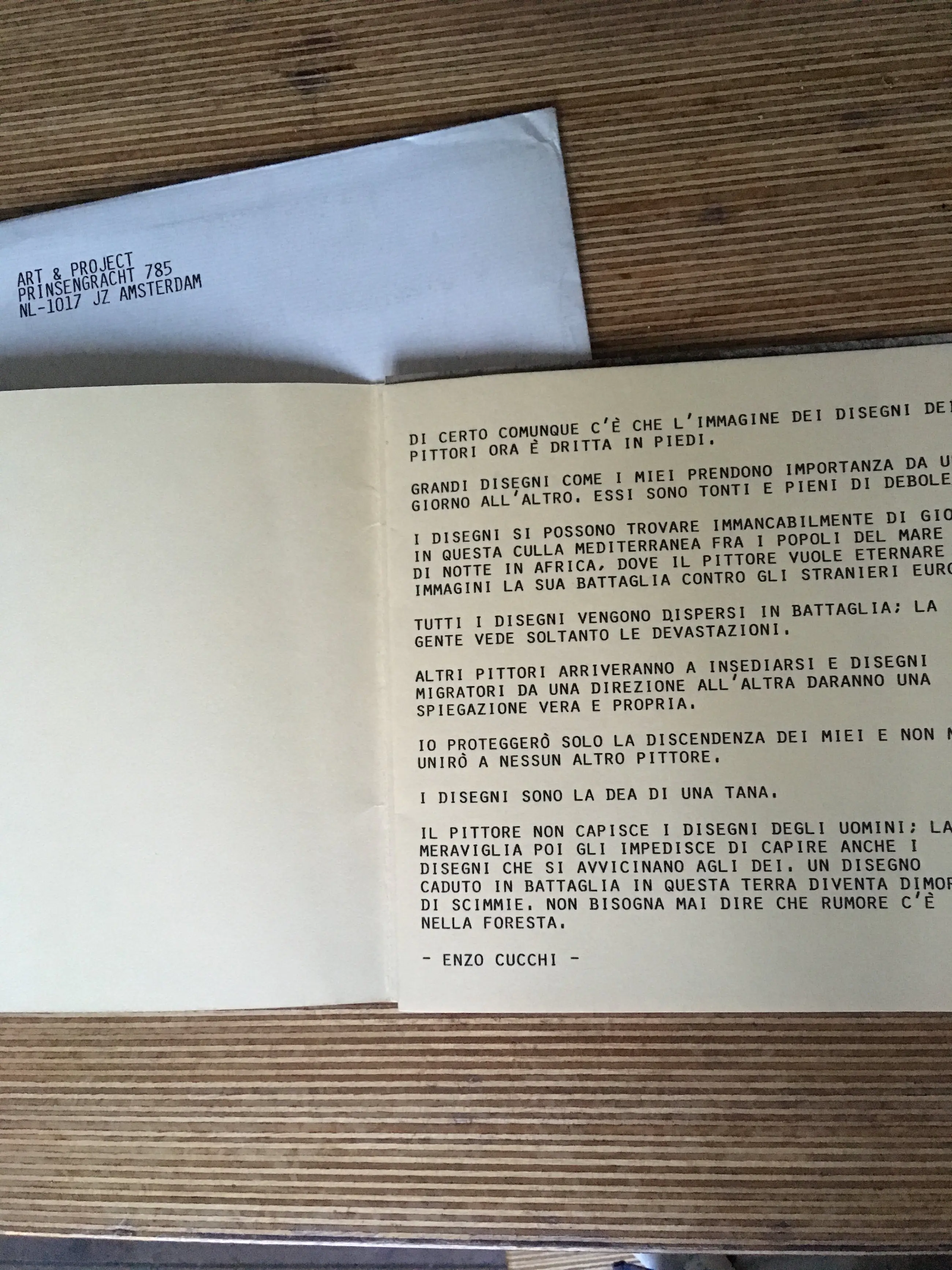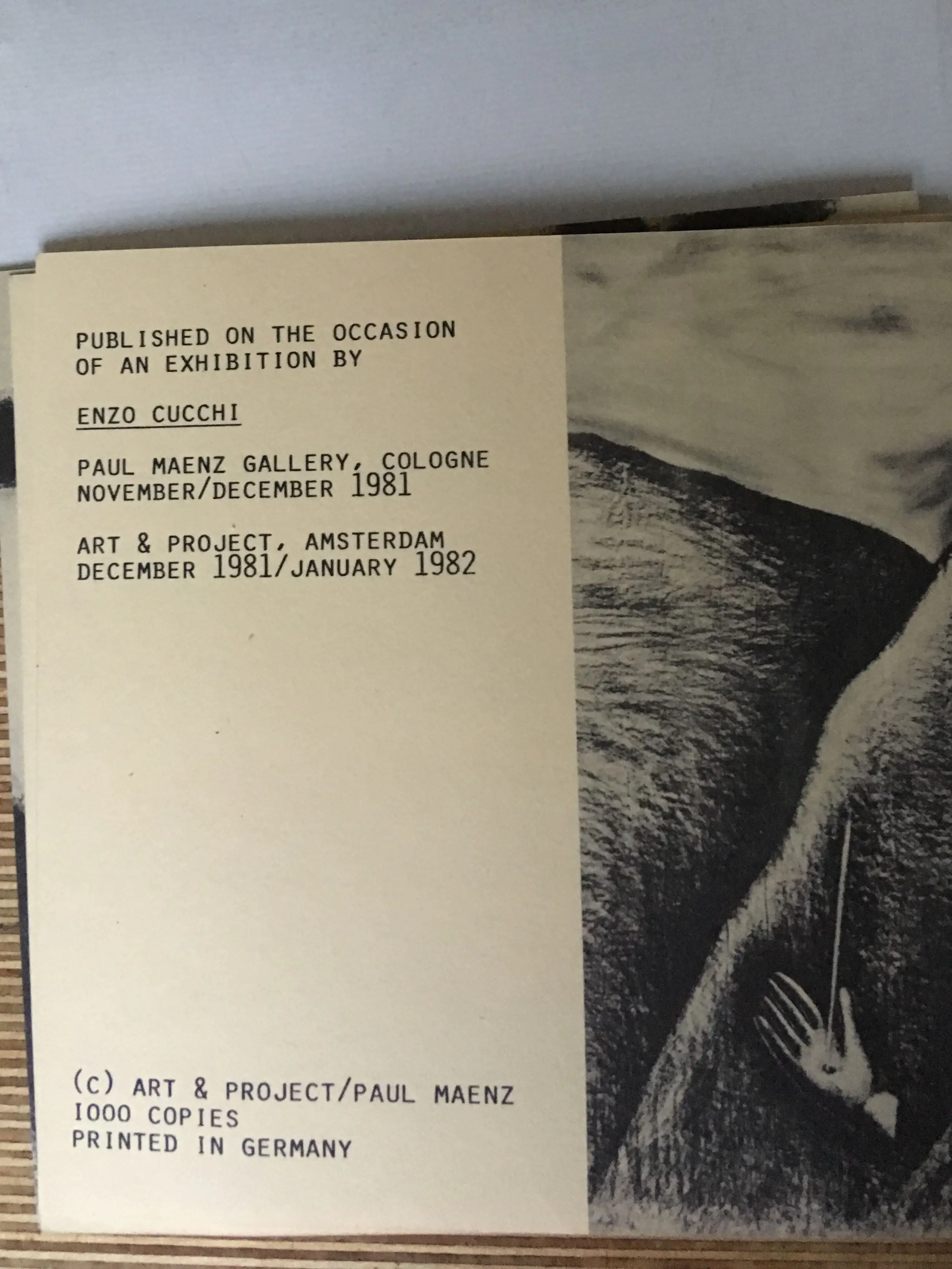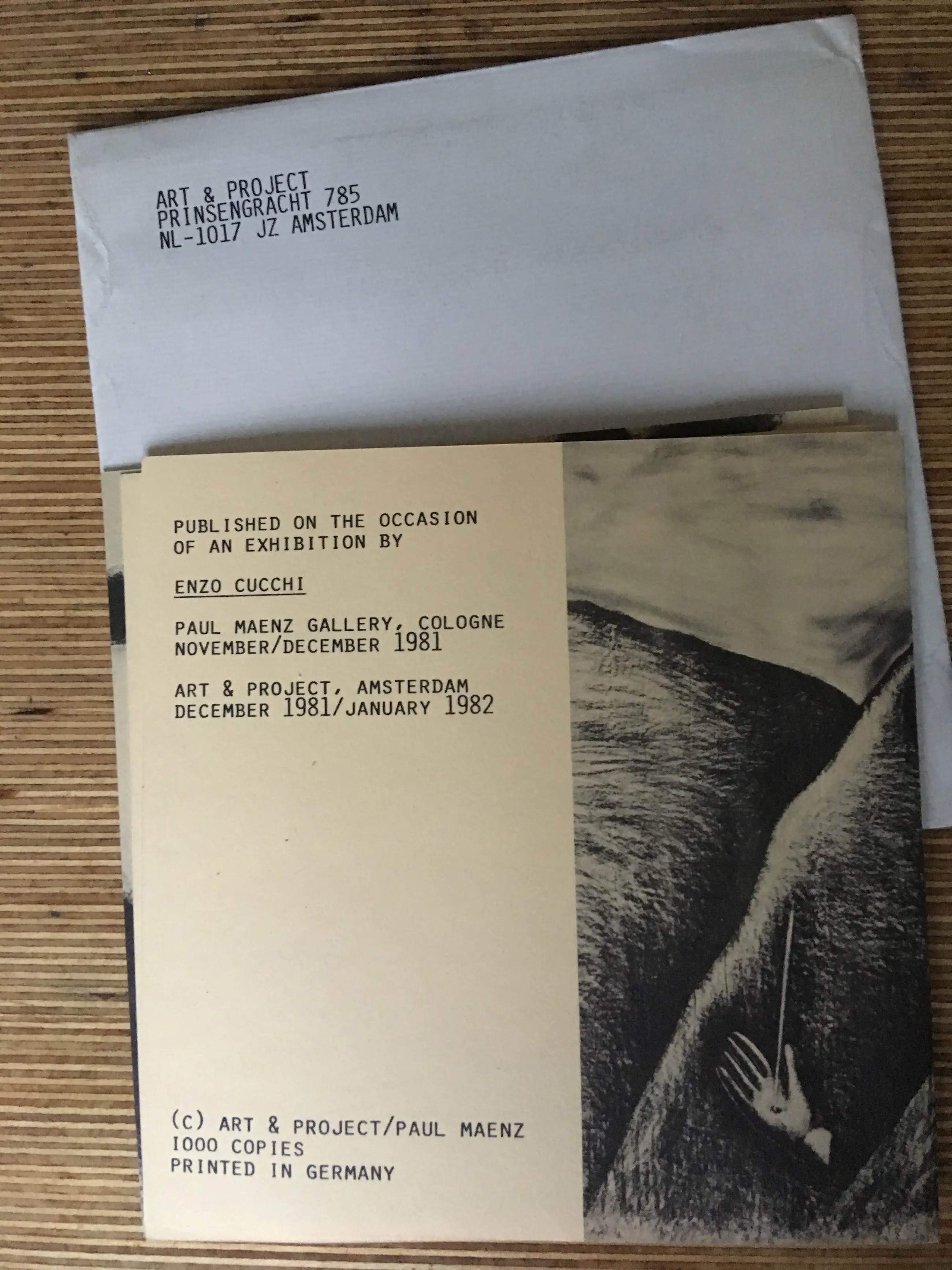 Losbladige uitnodiging van 3 gevouwen pagina's (12 p) met tekst van Enzo Cucchi en vier van zijn in zwart wit gedrukte werken. Op de achterzijde: "Published on the occasion of an exhibition by Enzo Cucchi" bij Paul Maenz in Keule (1981), en bij Art & Project in 1982.