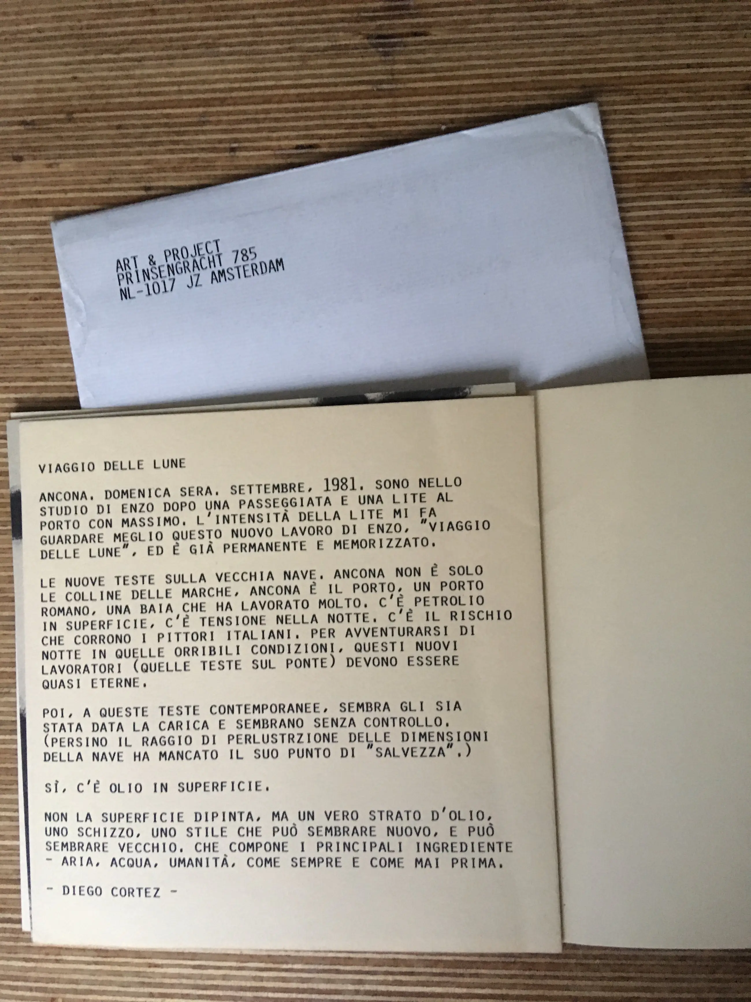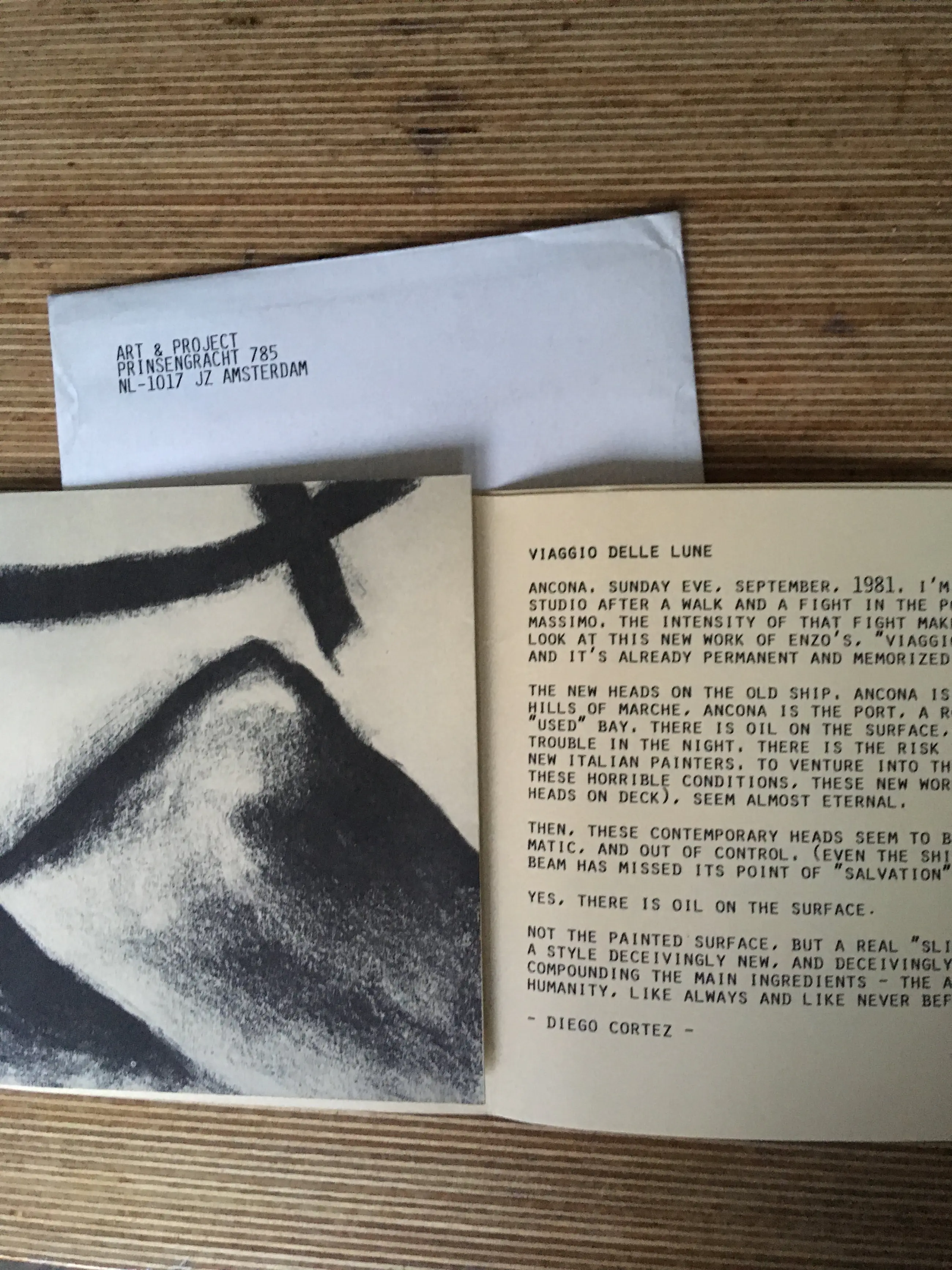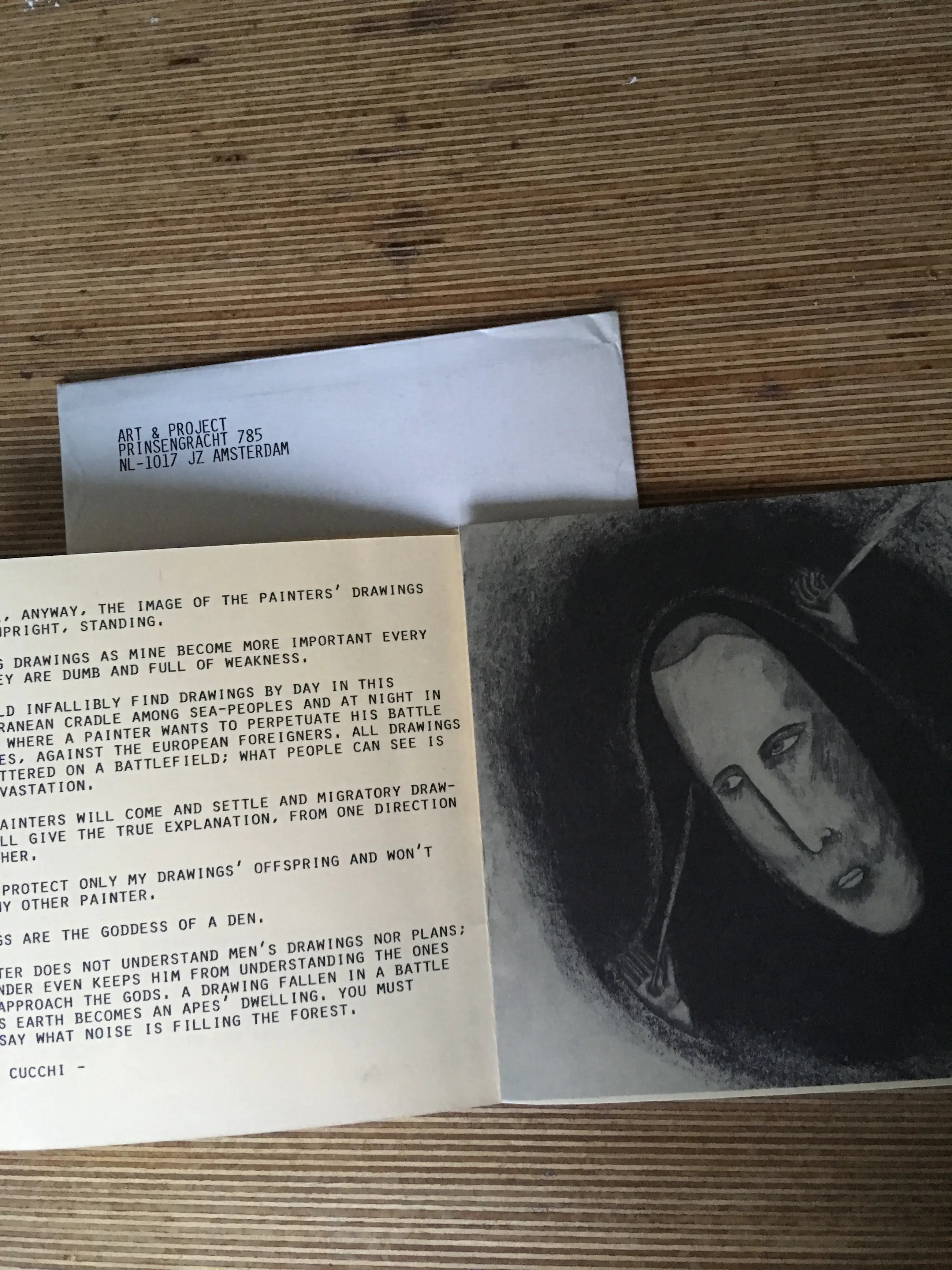 Losbladige uitnodiging van 3 gevouwen pagina's (12 p) met tekst van Enzo Cucchi en vier van zijn in zwart wit gedrukte werken. Op de achterzijde: "Published on the occasion of an exhibition by Enzo Cucchi" bij Paul Maenz in Keule (1981), en bij Art & Project in 1982.