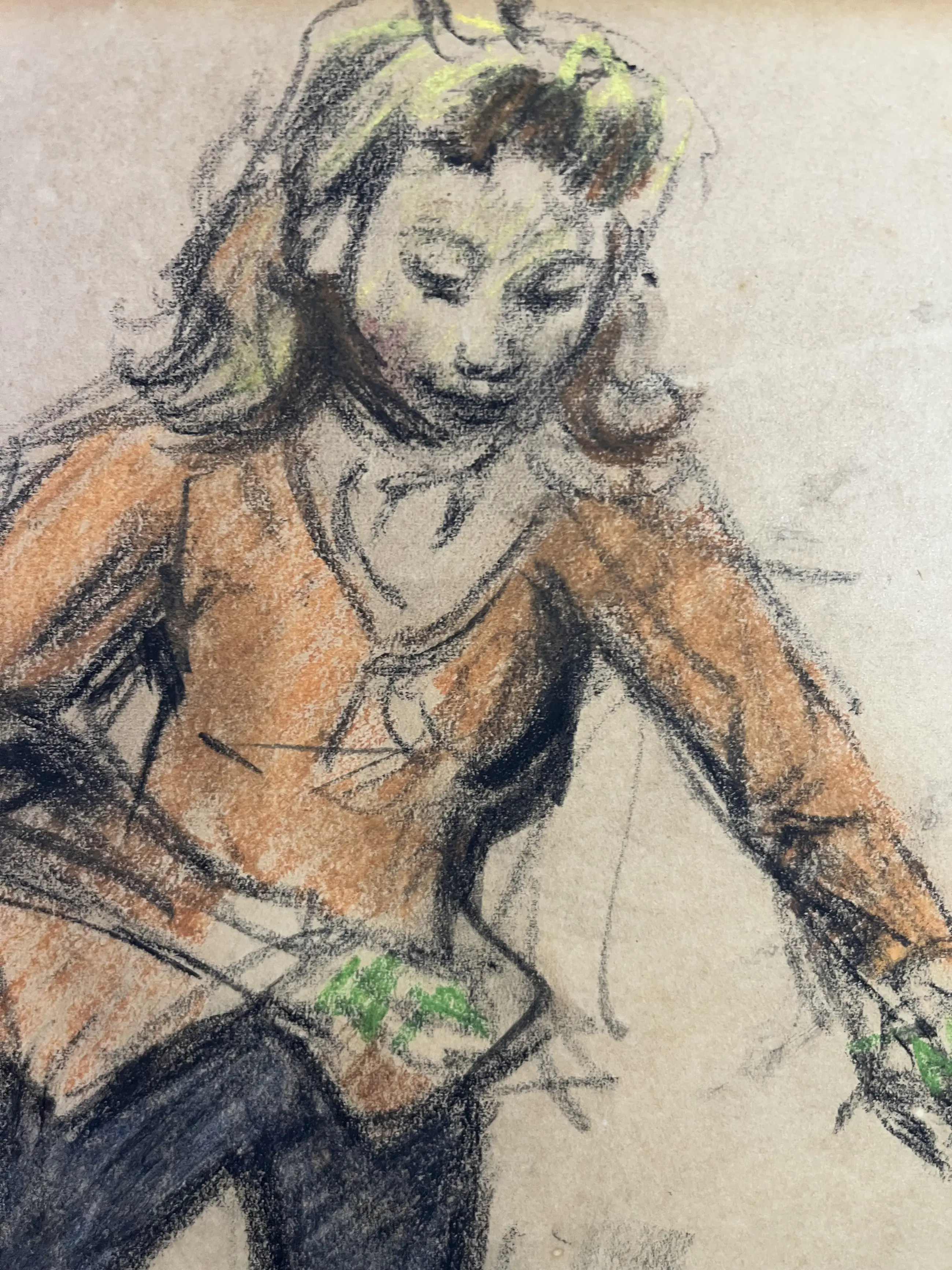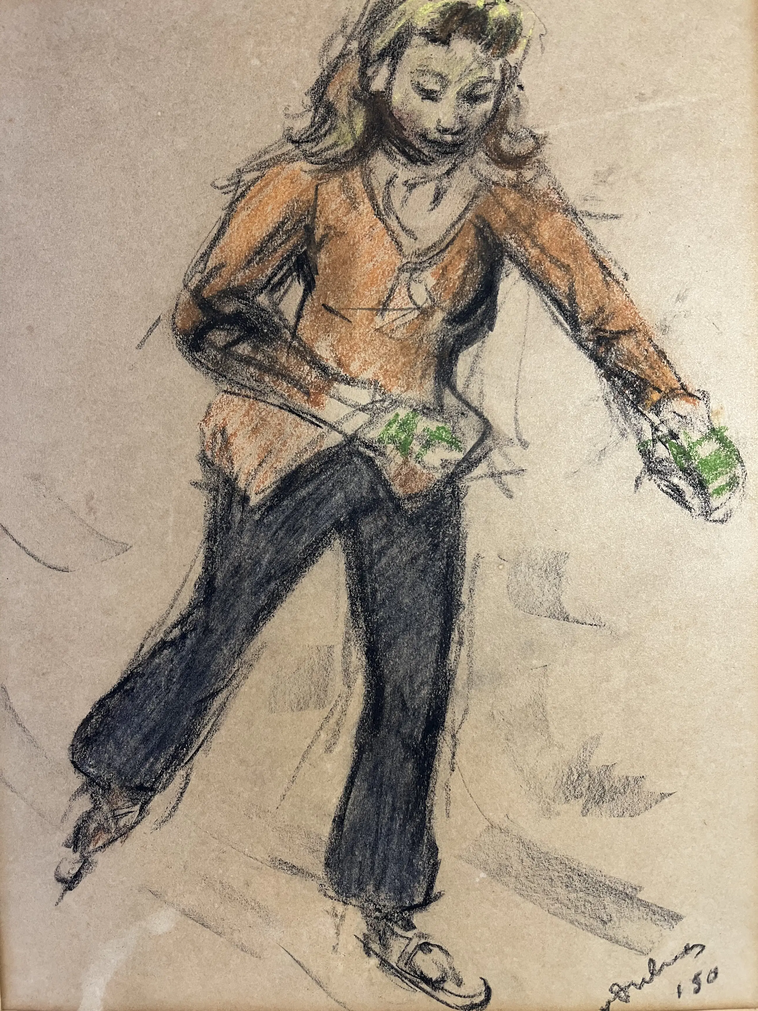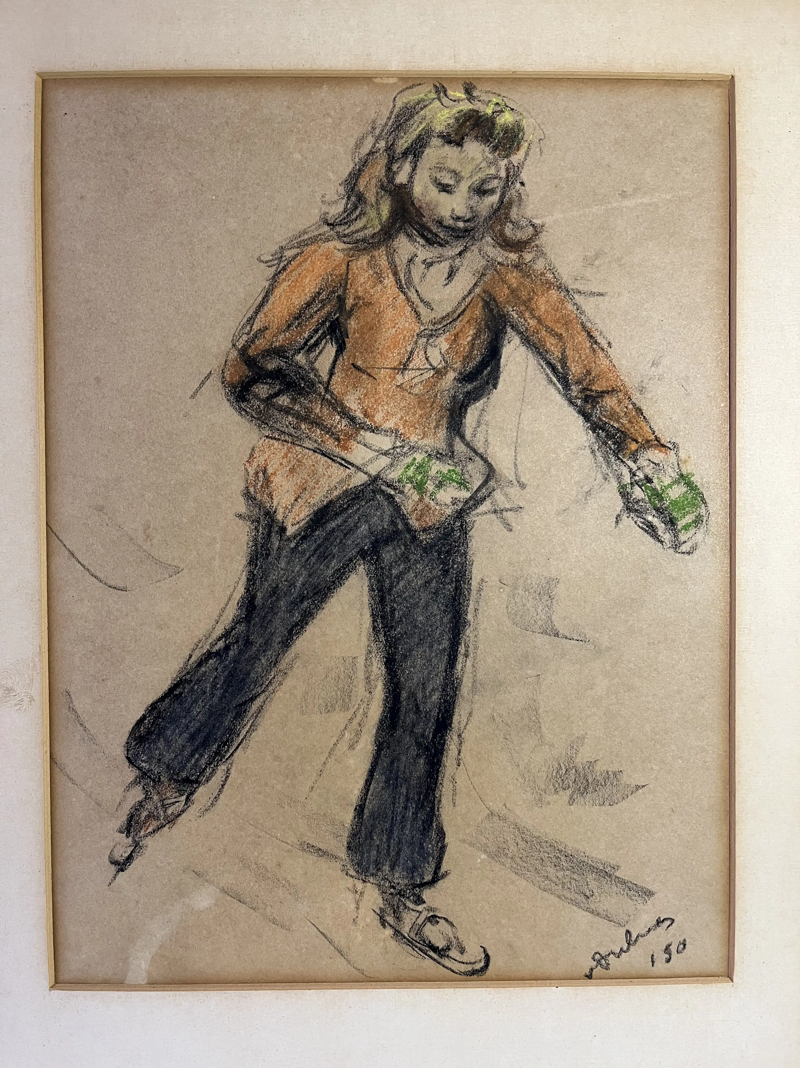 Aandoenlijk werk van een meisje op de schaats In Groningen. gesigneerd r.o en '50 krijttekening/papier, h 29 x b 22 cm In originele lijst