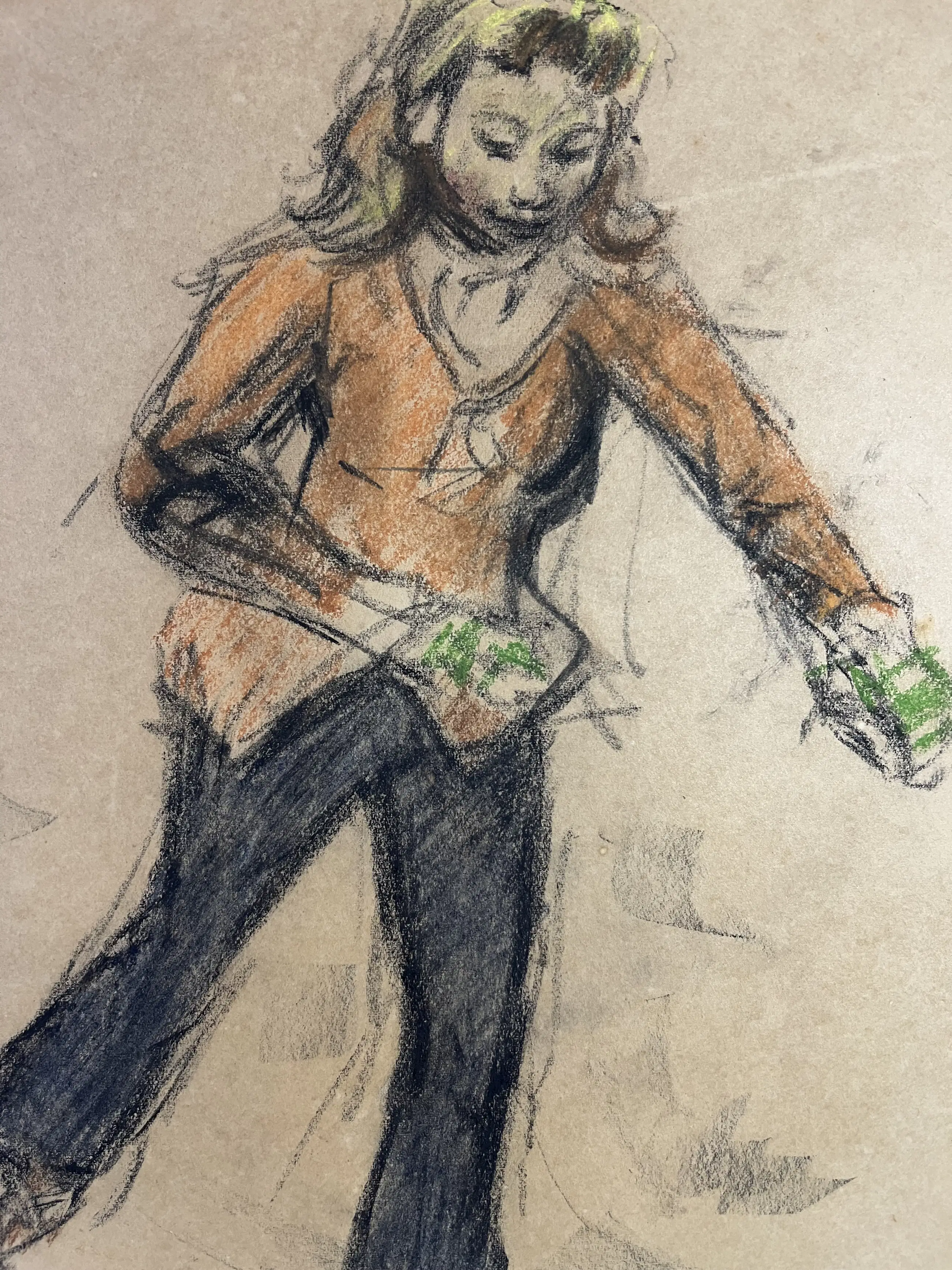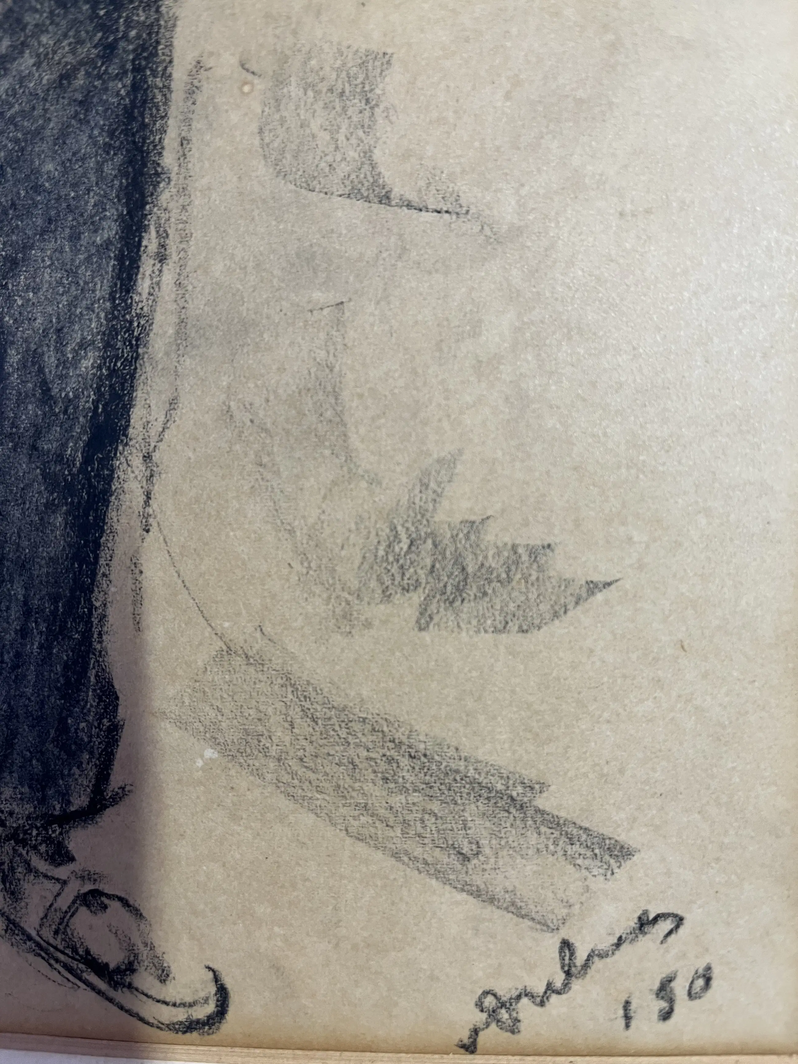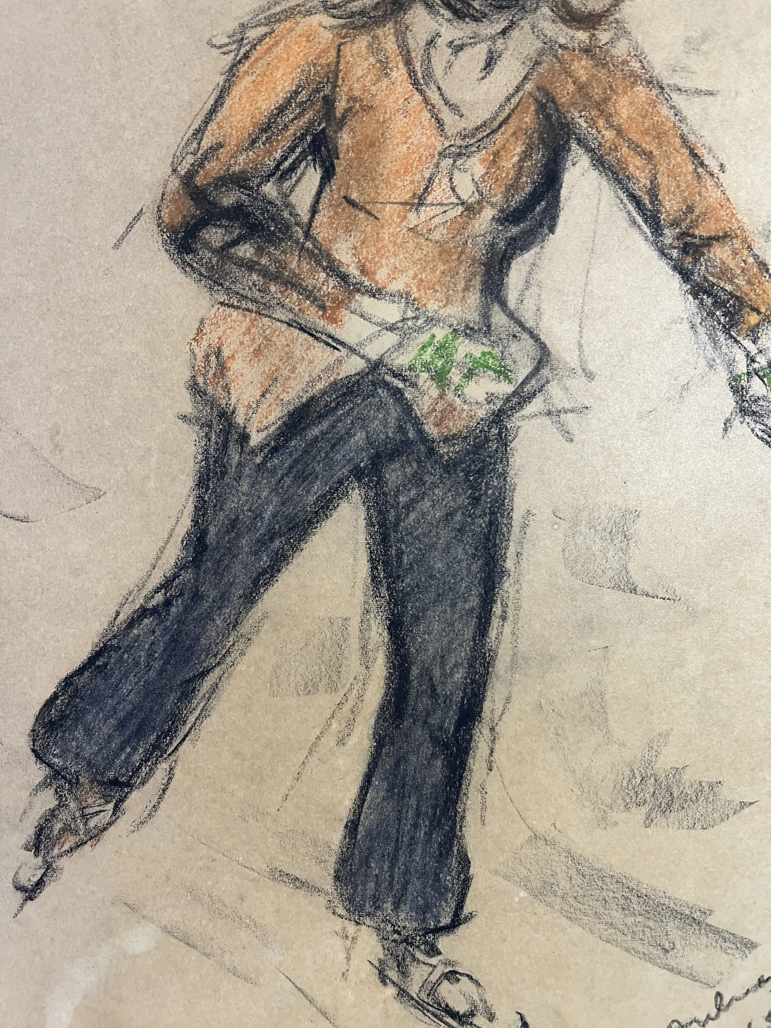 Aandoenlijk werk van een meisje op de schaats In Groningen. gesigneerd r.o en '50 krijttekening/papier, h 29 x b 22 cm In originele lijst