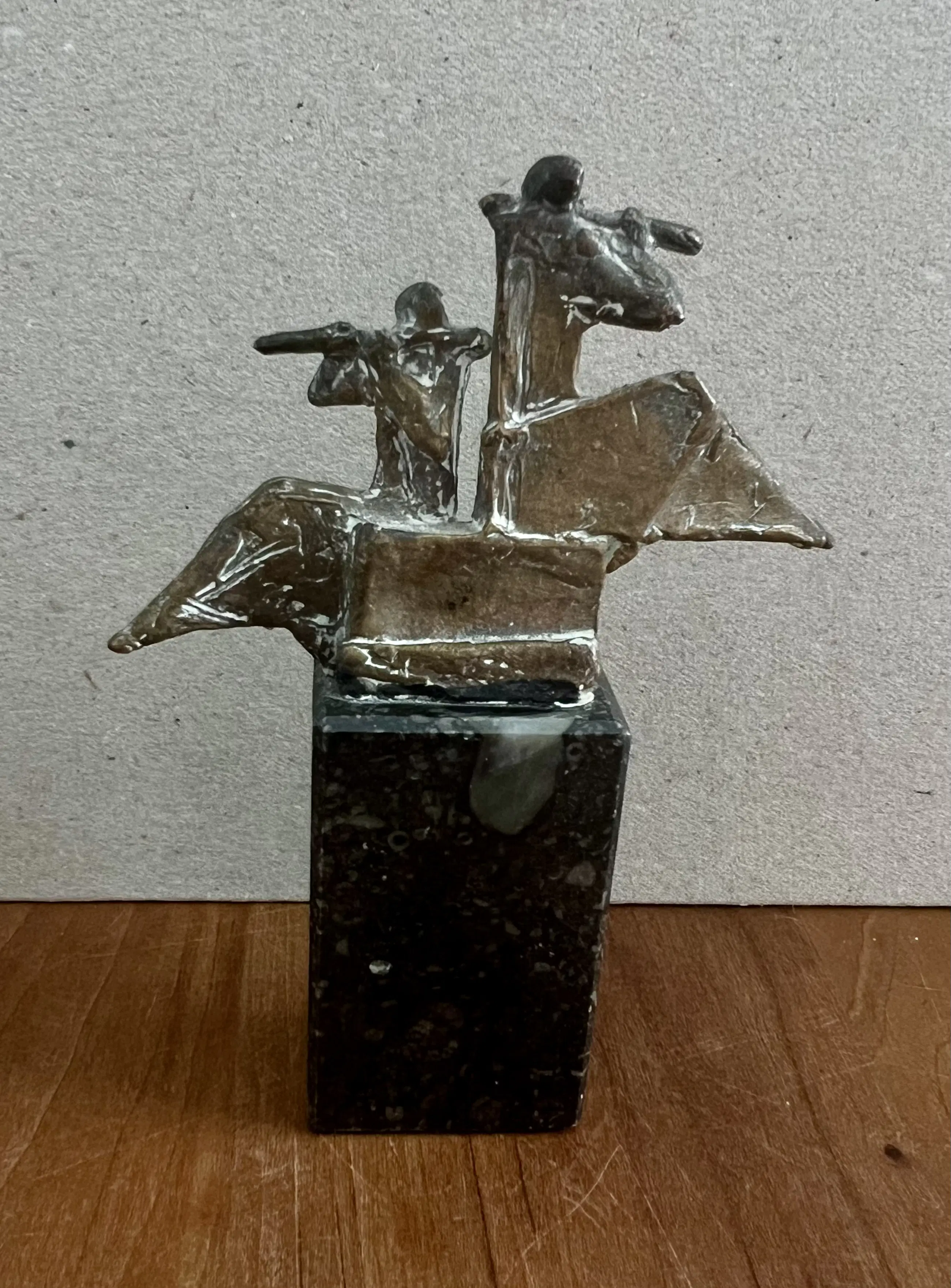 Eric Claus 1936 Haarlem Twee Bronze fluitspelers op marmeren sommelier Abstract twee figuren op sokkel Afmetingen 5,5 hoog Breedte 8.8 cm Diepte 1 cm Hoogte inclusief sokkel 11,5 cm Niet gesigneerd Ontwerp voor Buma Stemra in de jaren 80 Bij Eric Claus