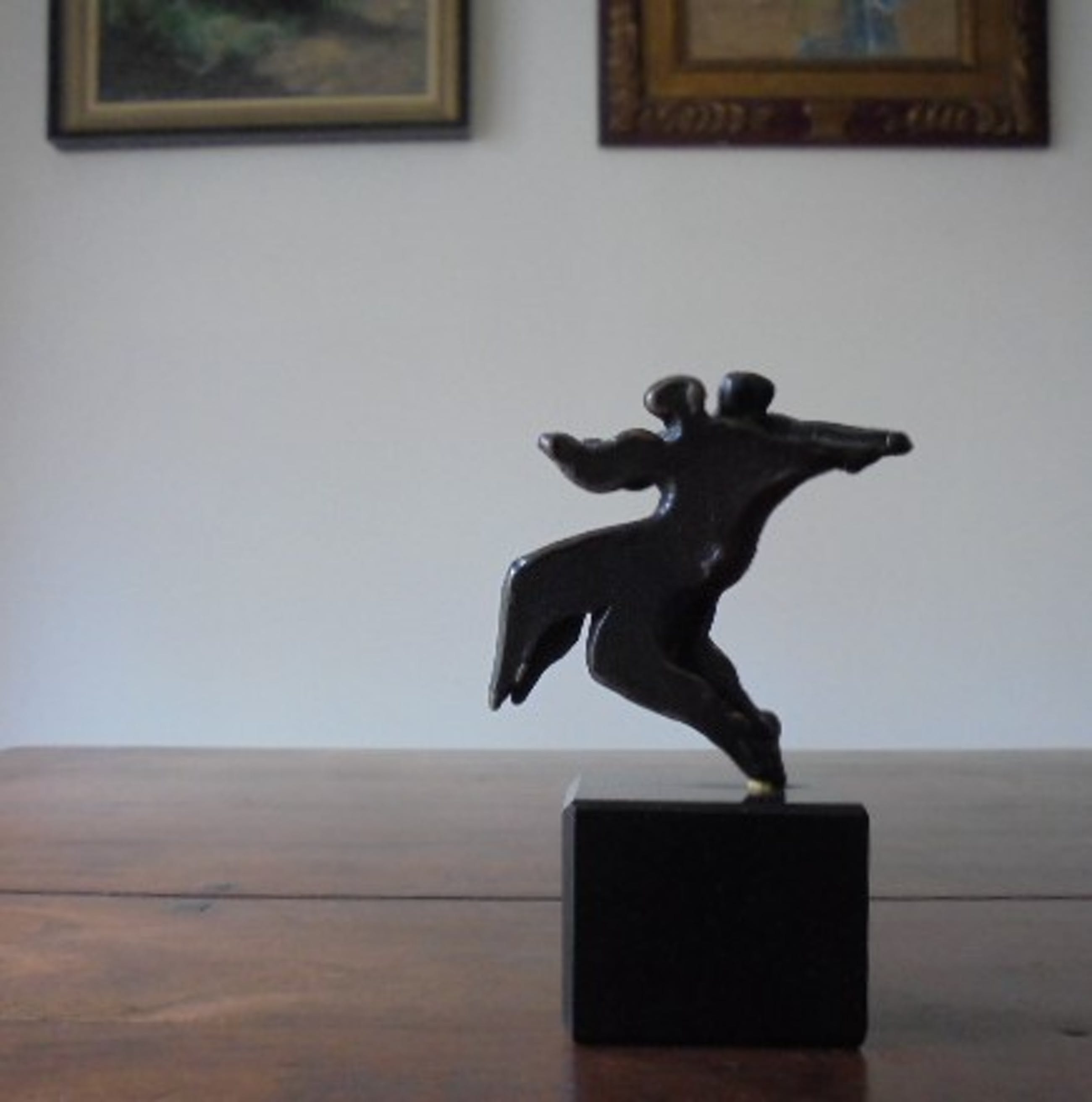 Prachtig bronzen beeld van de bekende kunstenaar Eric Claus.Eric Claus mag gezien worden als een belangrijk vertegenwoordiger van de hedendaagse klassieke beeldhouwkunst.Door een breed scala aan onderwerpen weet Eric Claus de kijker steeds weer te boeien.Of het nu de figuren uit de populaire Italiaanse Commedia dell arte zijn of de grote filosofen uit de vorige eeuw en niet te vergeten de klassieke mythologie, het zijn, zijn artistieke visie en zijn vakmanschap die de toeschouwer verrassen.