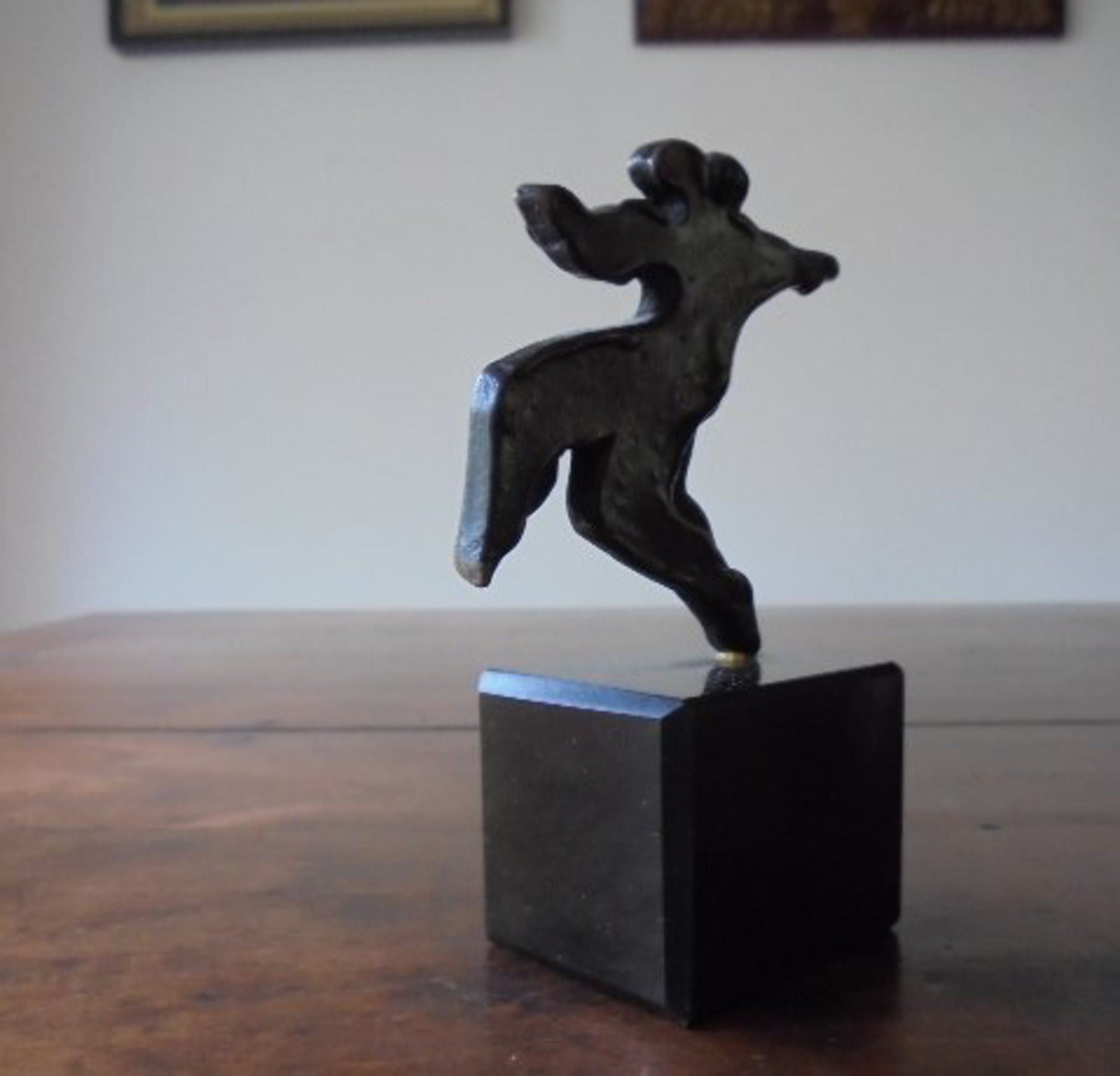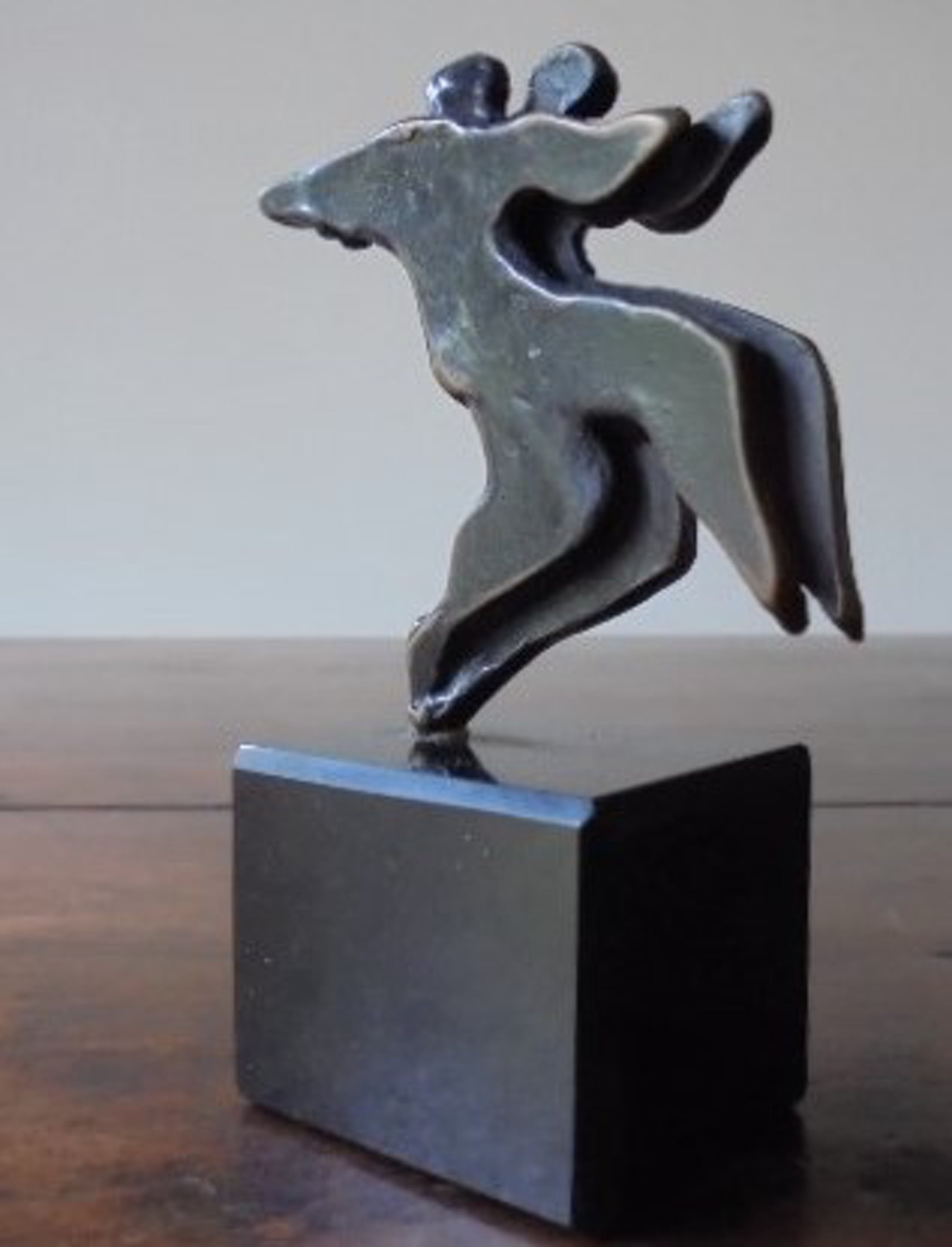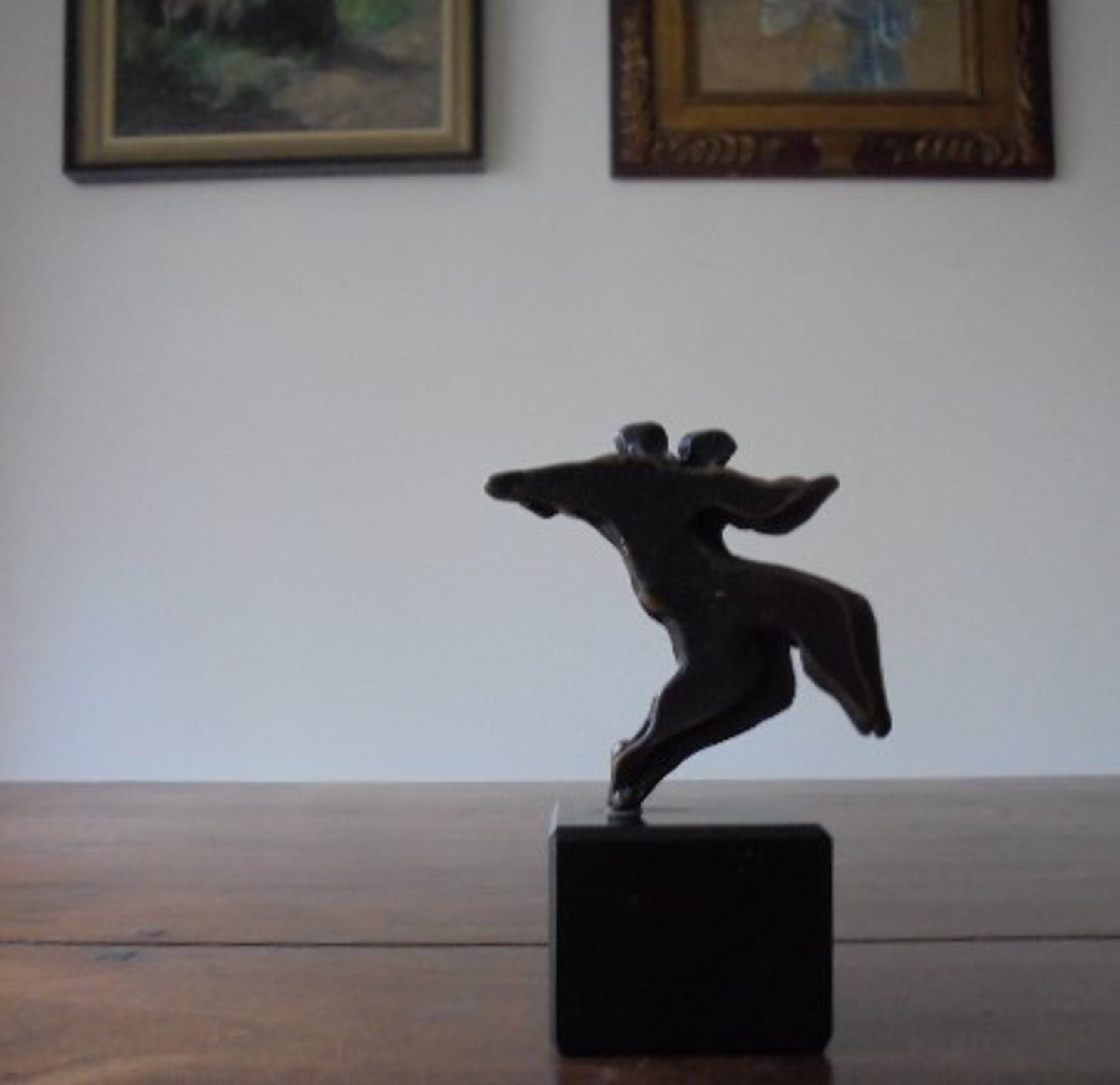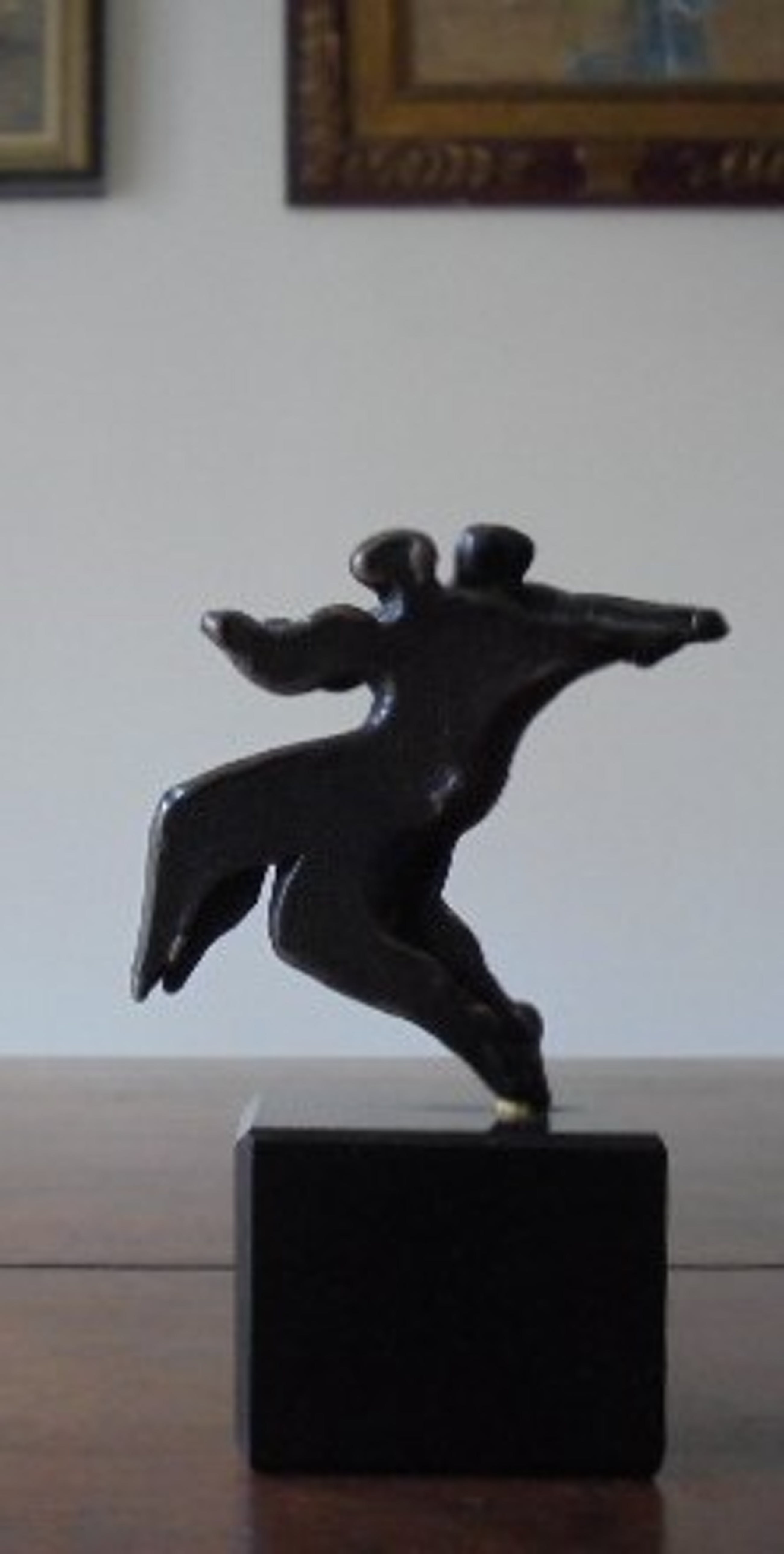 Prachtig bronzen beeld van de bekende kunstenaar Eric Claus.Eric Claus mag gezien worden als een belangrijk vertegenwoordiger van de hedendaagse klassieke beeldhouwkunst.Door een breed scala aan onderwerpen weet Eric Claus de kijker steeds weer te boeien.Of het nu de figuren uit de populaire Italiaanse Commedia dell arte zijn of de grote filosofen uit de vorige eeuw en niet te vergeten de klassieke mythologie, het zijn, zijn artistieke visie en zijn vakmanschap die de toeschouwer verrassen.