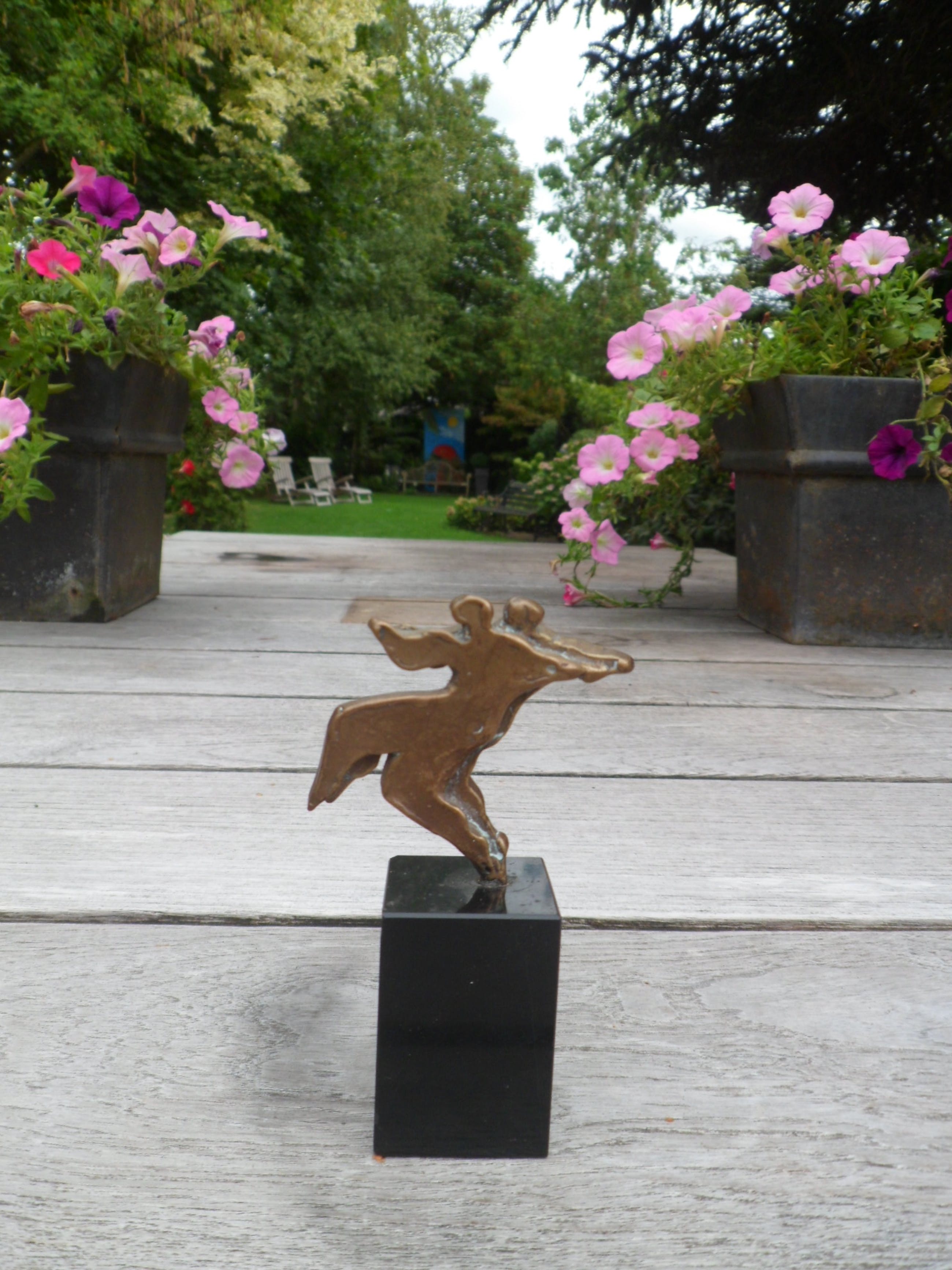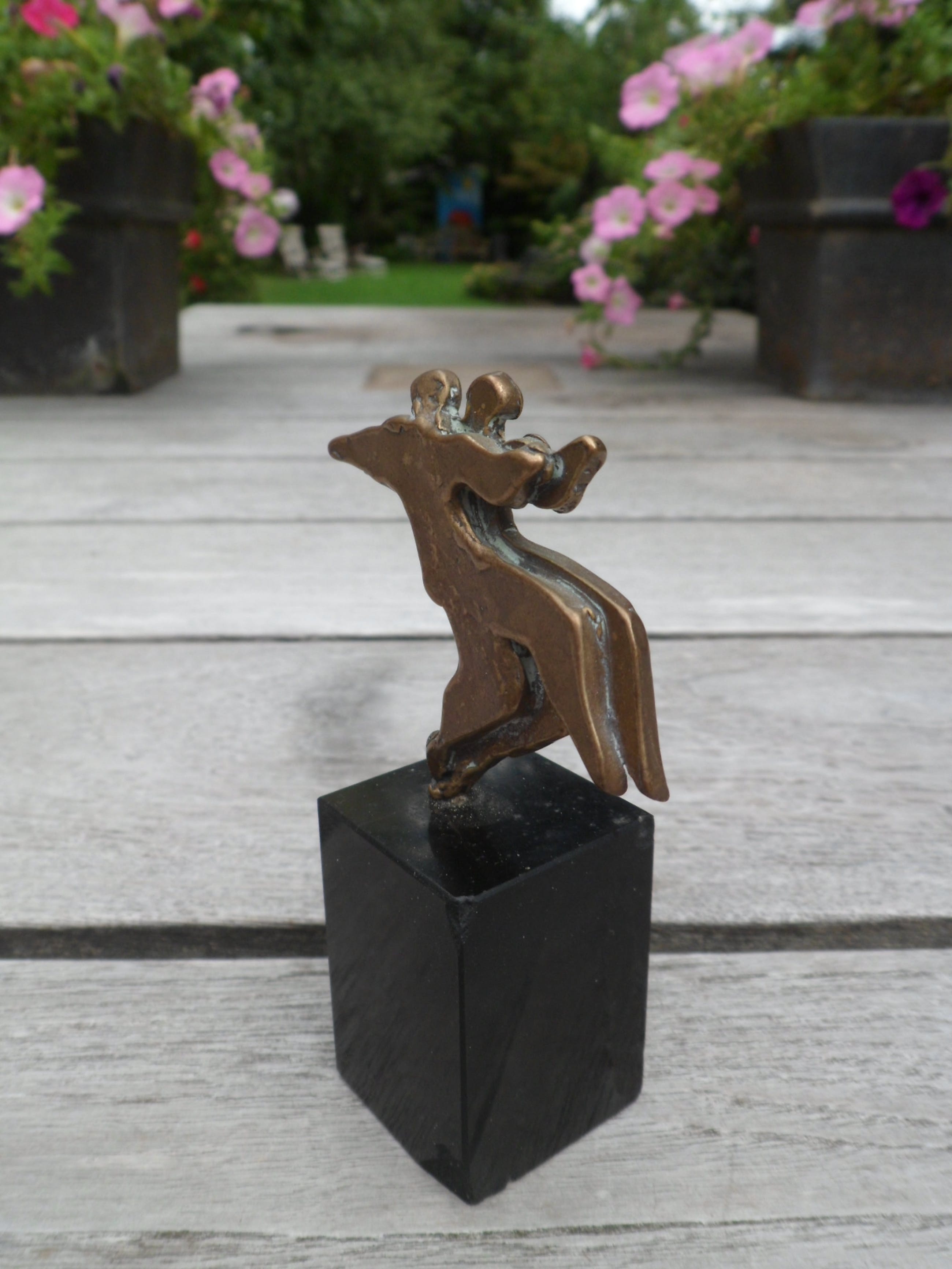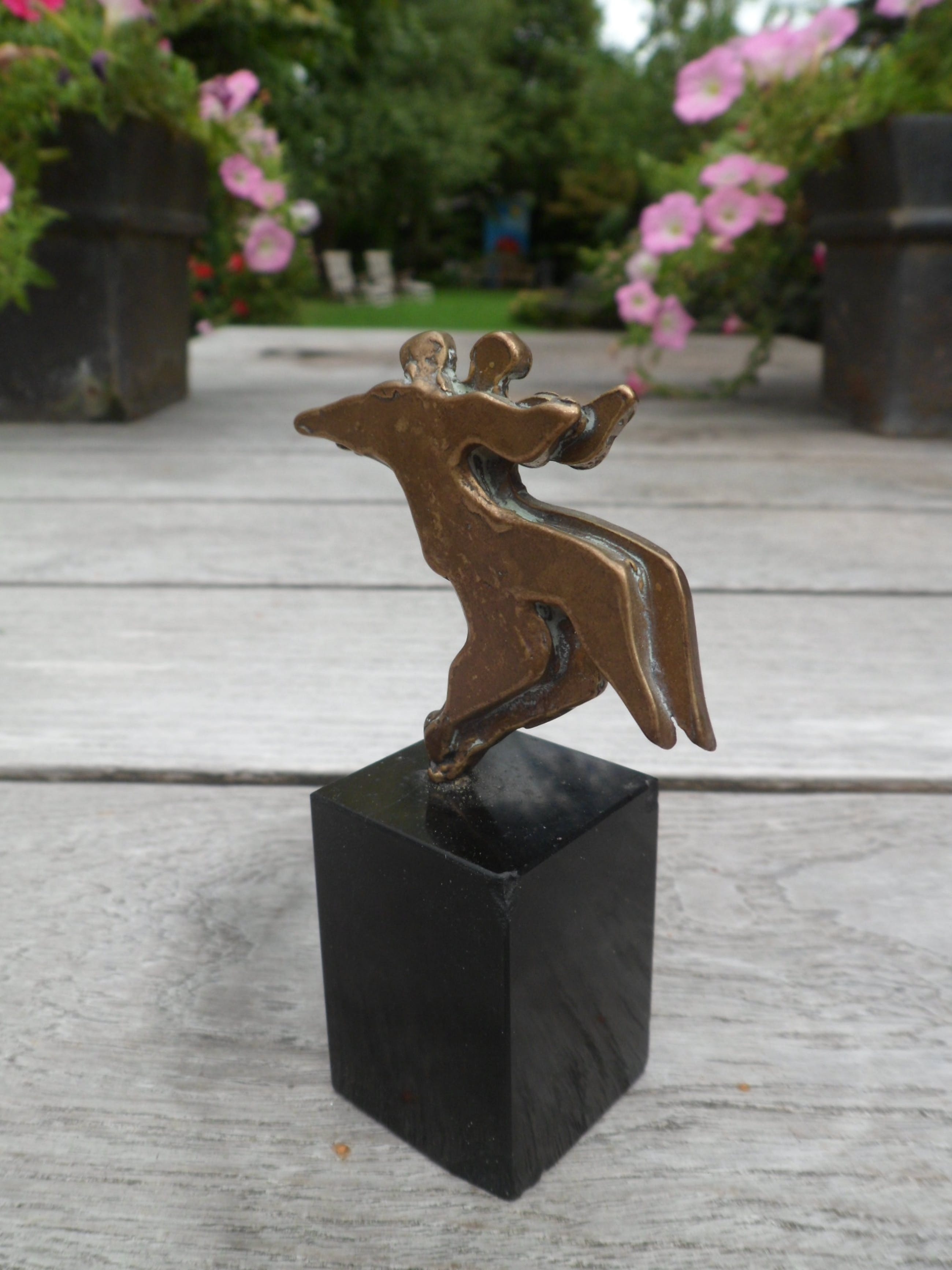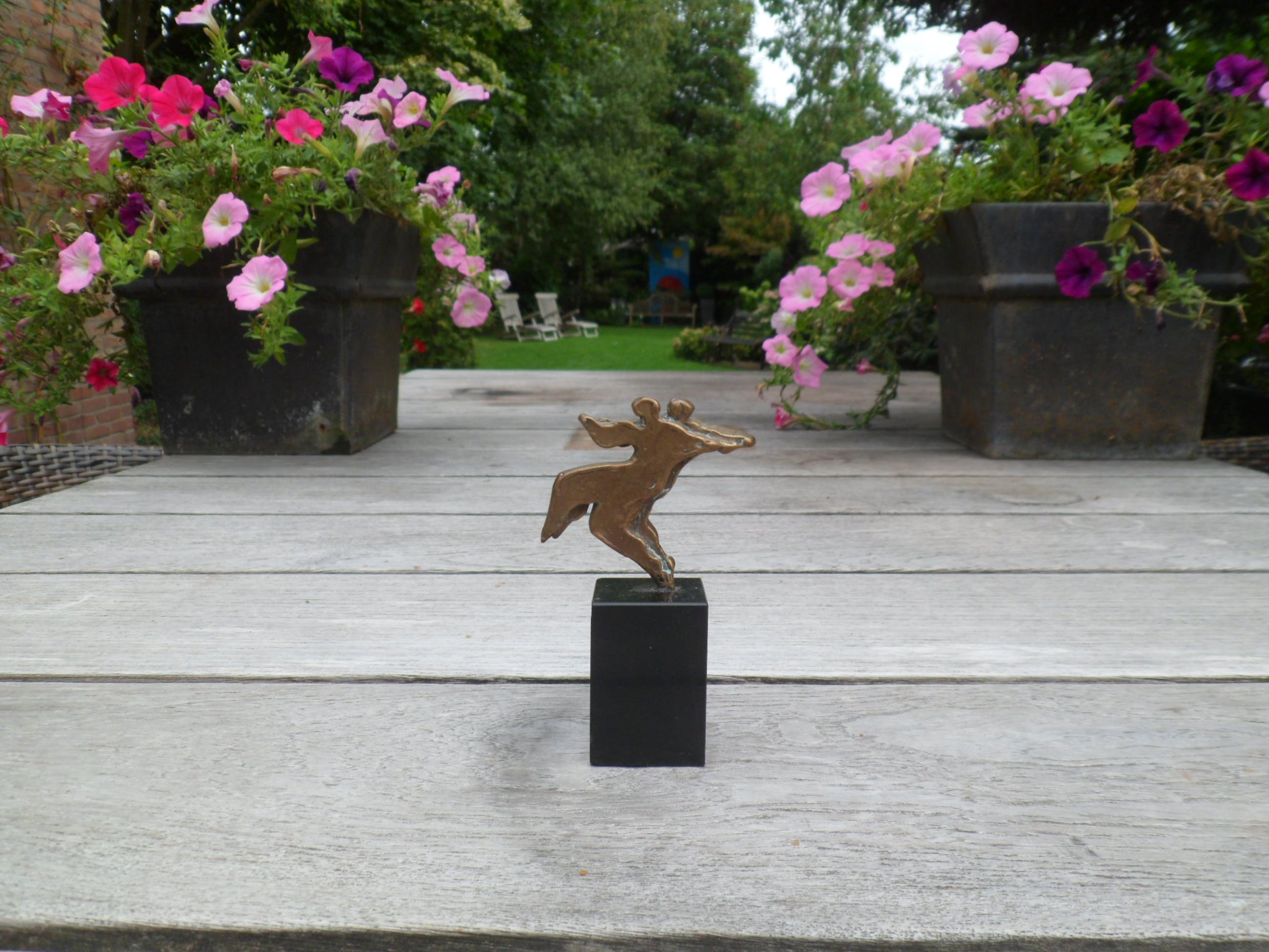 Prachtig bronzen beeld van de bekende kunstenaar Eric Claus.Eric Claus mag gezien worden als een belangrijk vertegenwoordiger van de hedendaagse klassieke beeldhouwkunst.Door een breed scala aan onderwerpen weet Eric Claus de kijker steeds weer te boeien.Of het nu de figuren uit de populaire Italiaanse Commedia dell arte zijn of de grote filosofen uit de vorige eeuw en niet te vergeten de klassieke mythologie, het zijn, zijn artistieke visie en zijn vakmanschap die de toeschouwer verrassen.