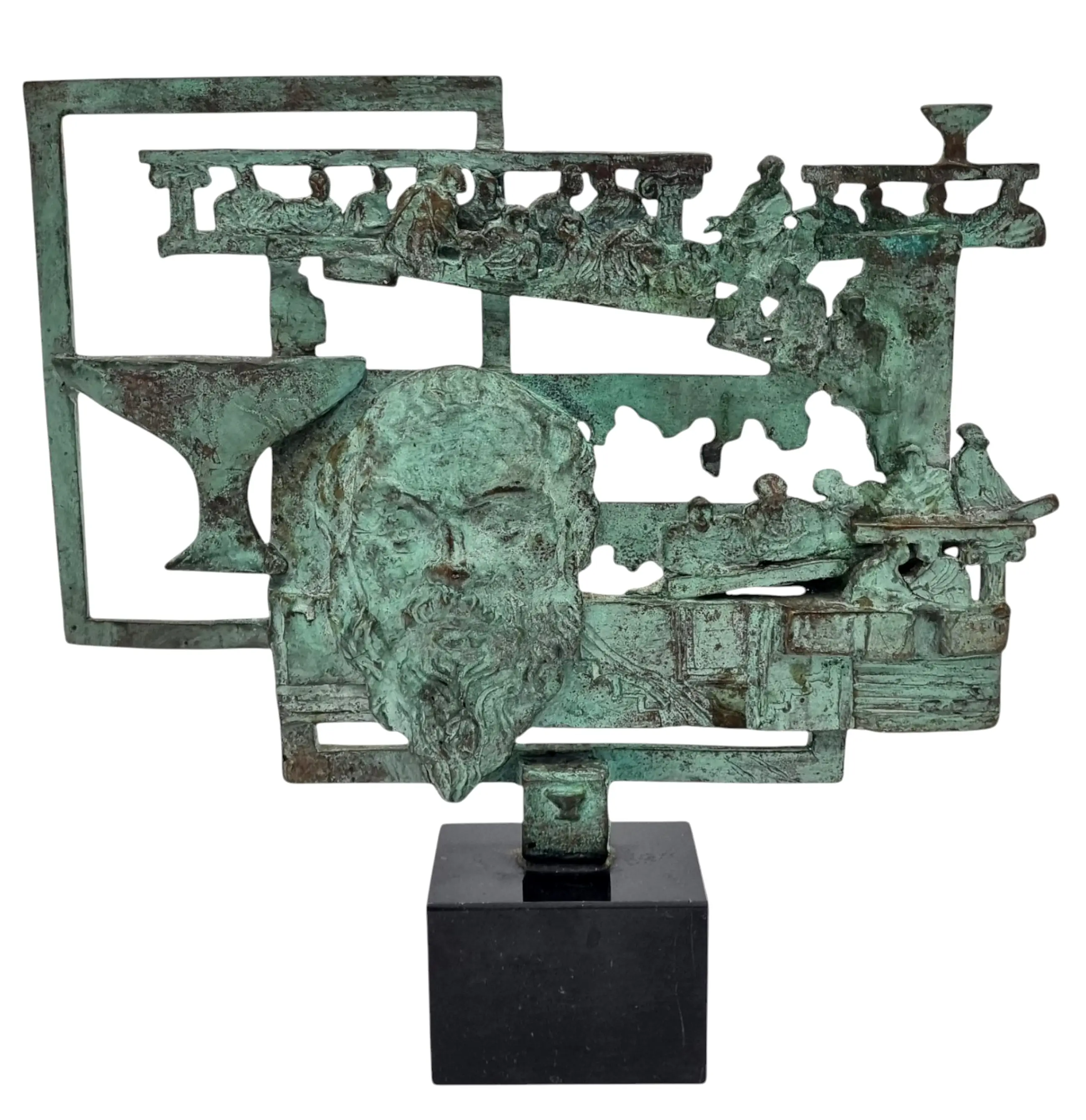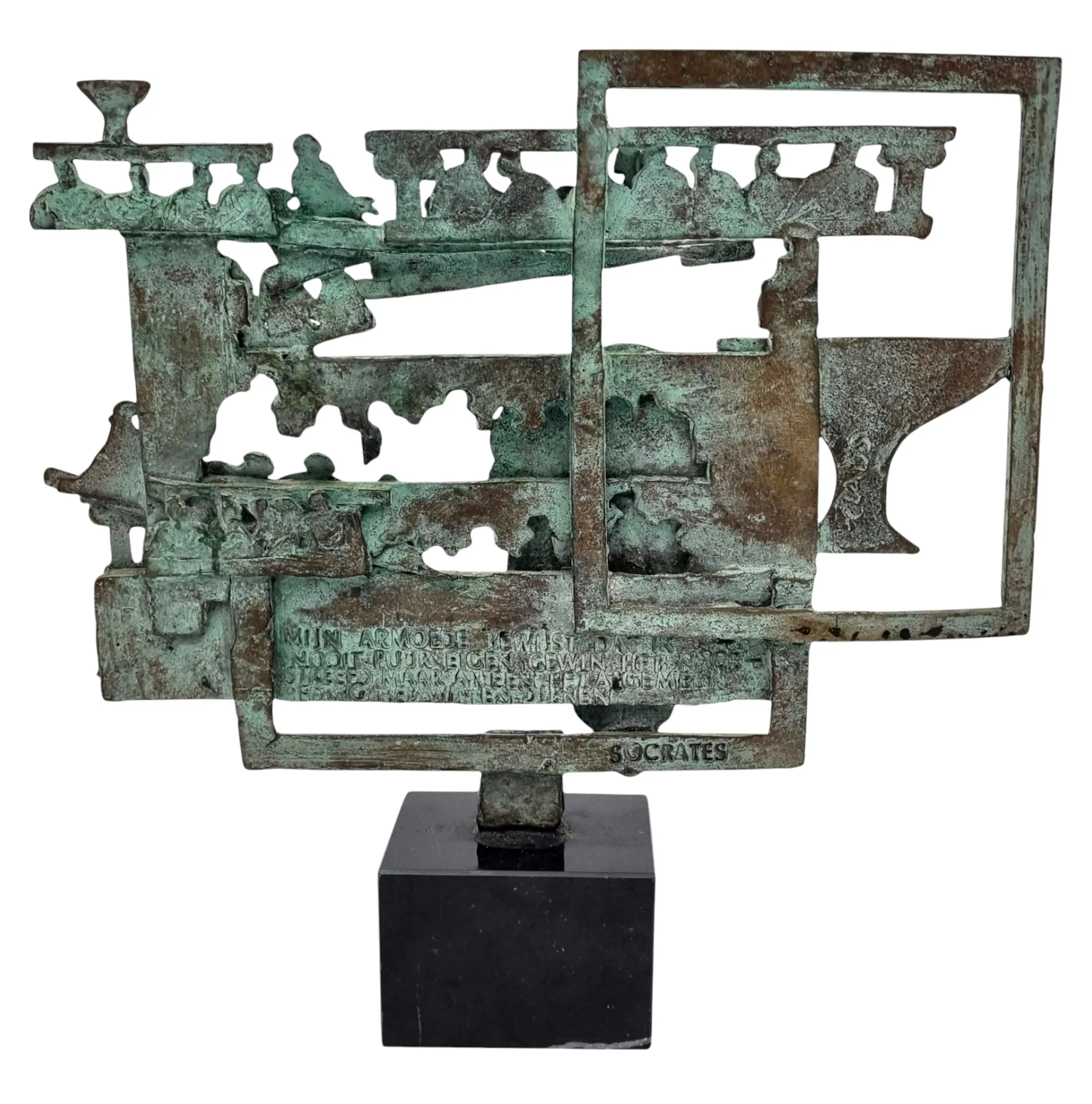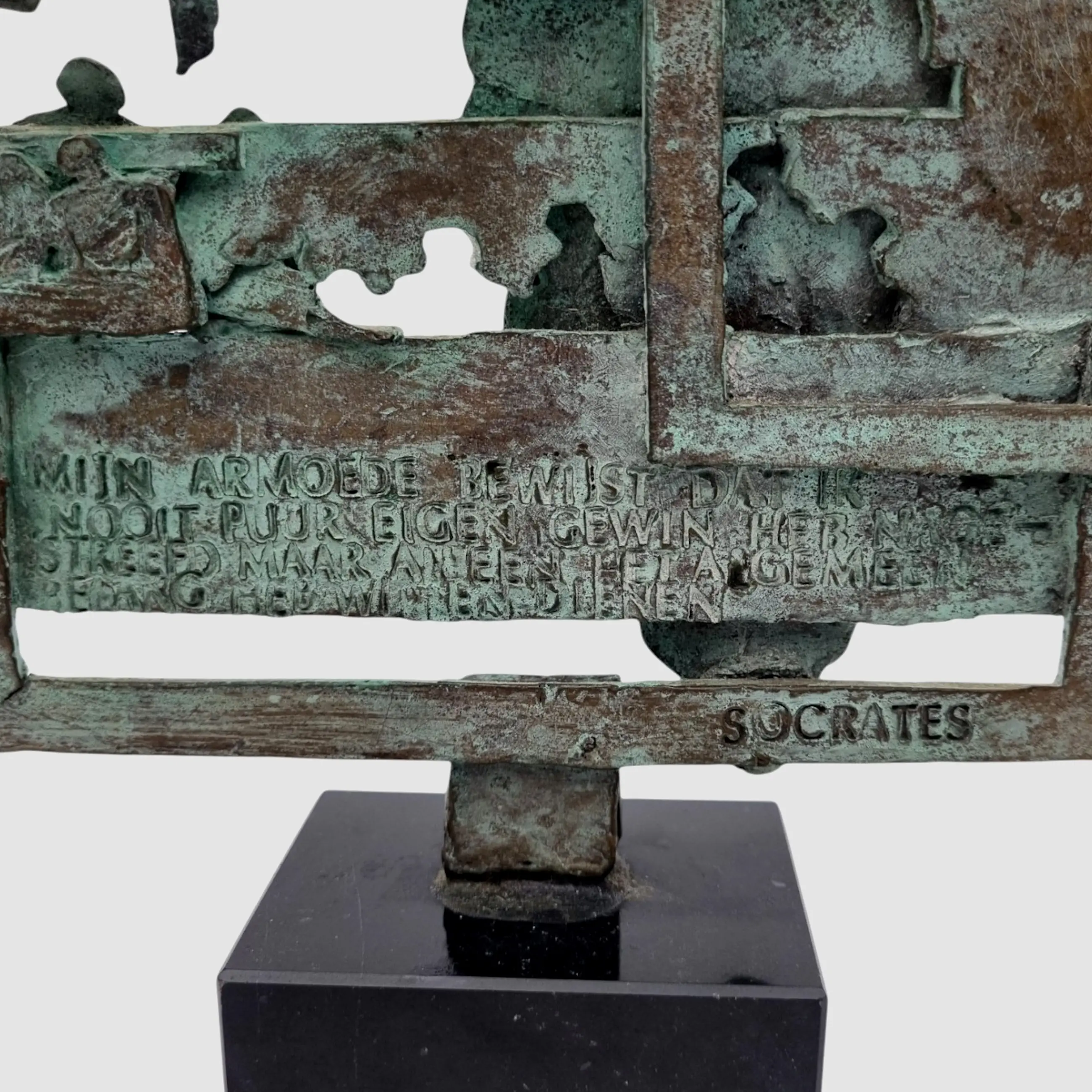Bronzen sculptuur van Eric Claus. Jaar: ca 2000. Titel: "Socrates". Afmetingen beeld op marmeren voet: H25 x b25cm. Het beeld is, op de achterzijde, gesigneerd door de kunstenaar. Met op achterzijde de tekst: Mijn armoede bewijst dat ik nooit puur eigen gewin heb nagestreeft maar alleen het algemeen belang heb willen dienen.