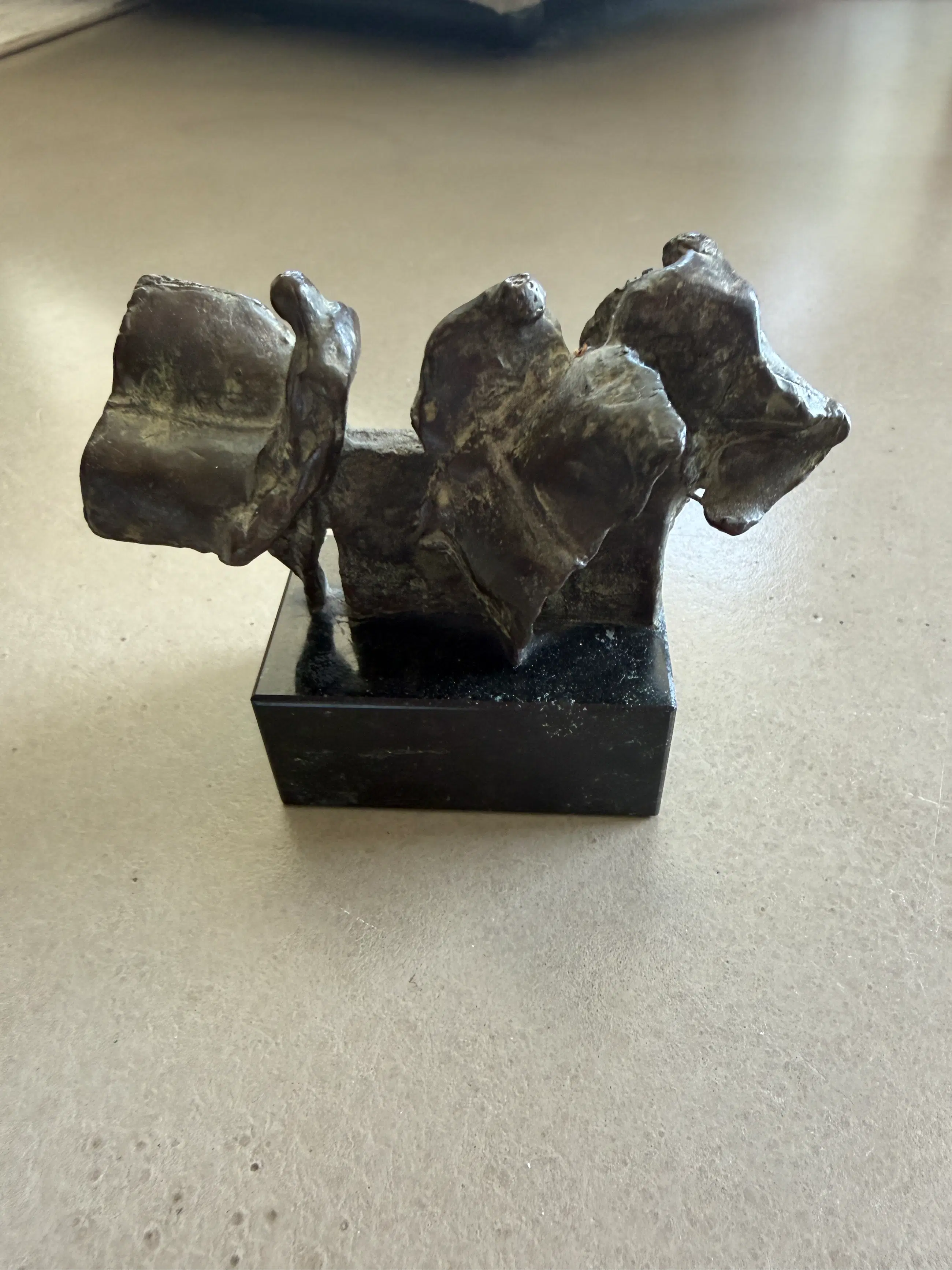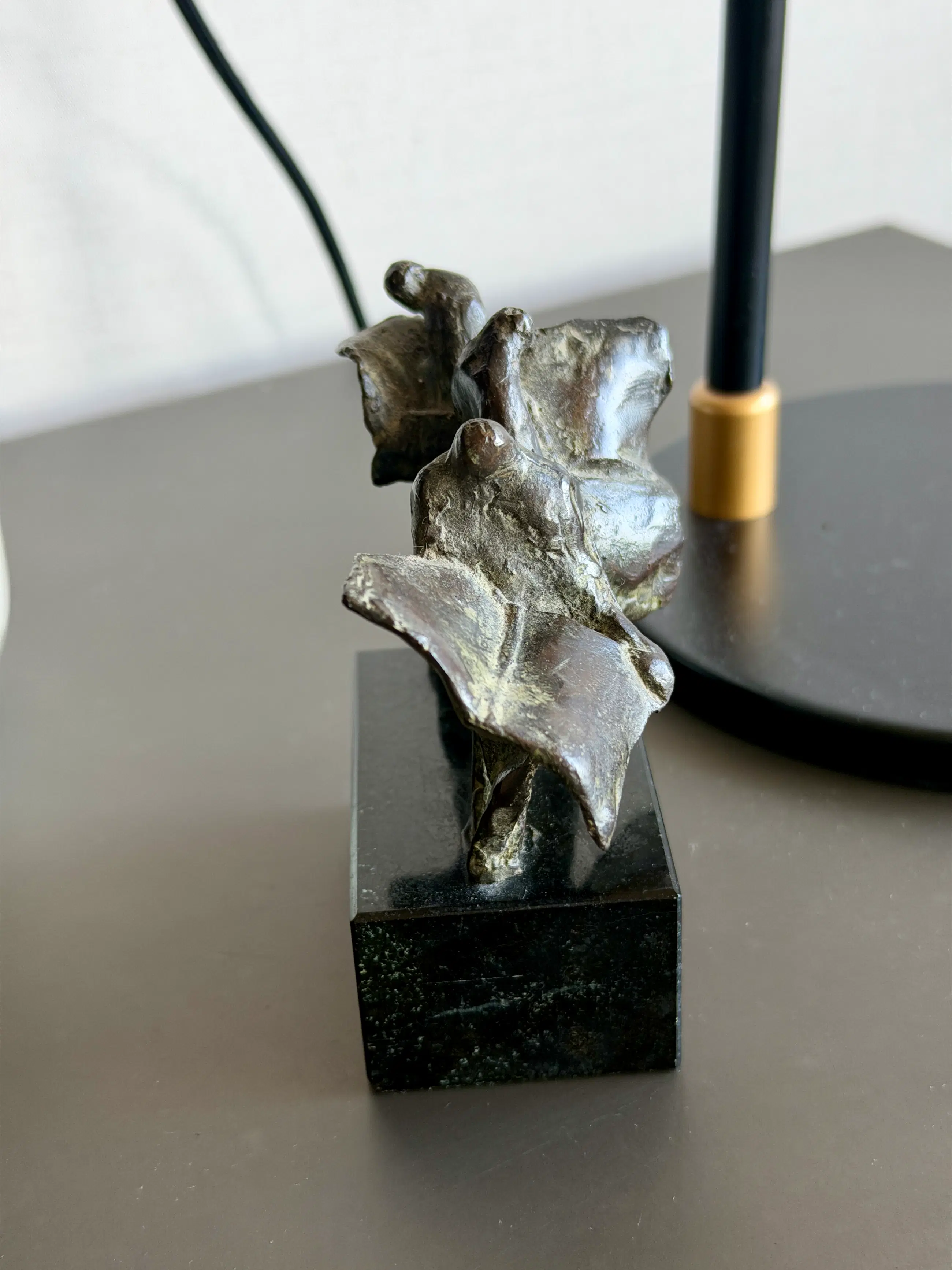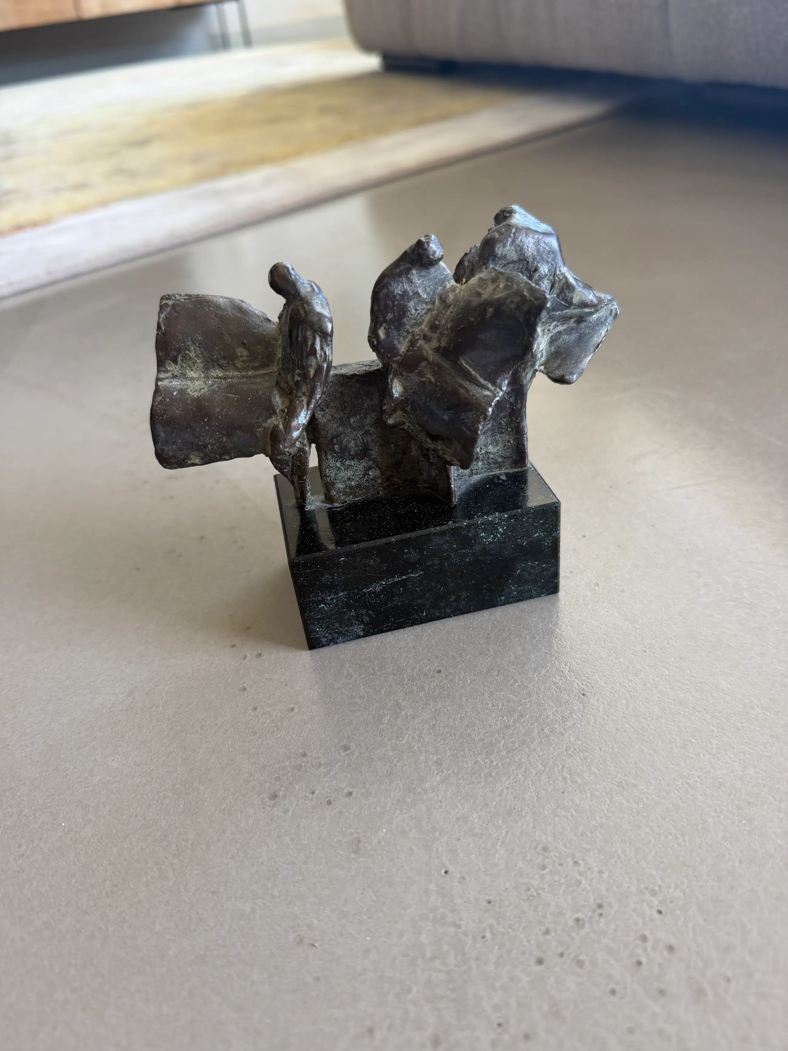 Het beeld is uitgevoerd in brons en geplaatst op een stevige, donkere sokkel, wat het geheel een elegante en moderne uitstraling geeft.