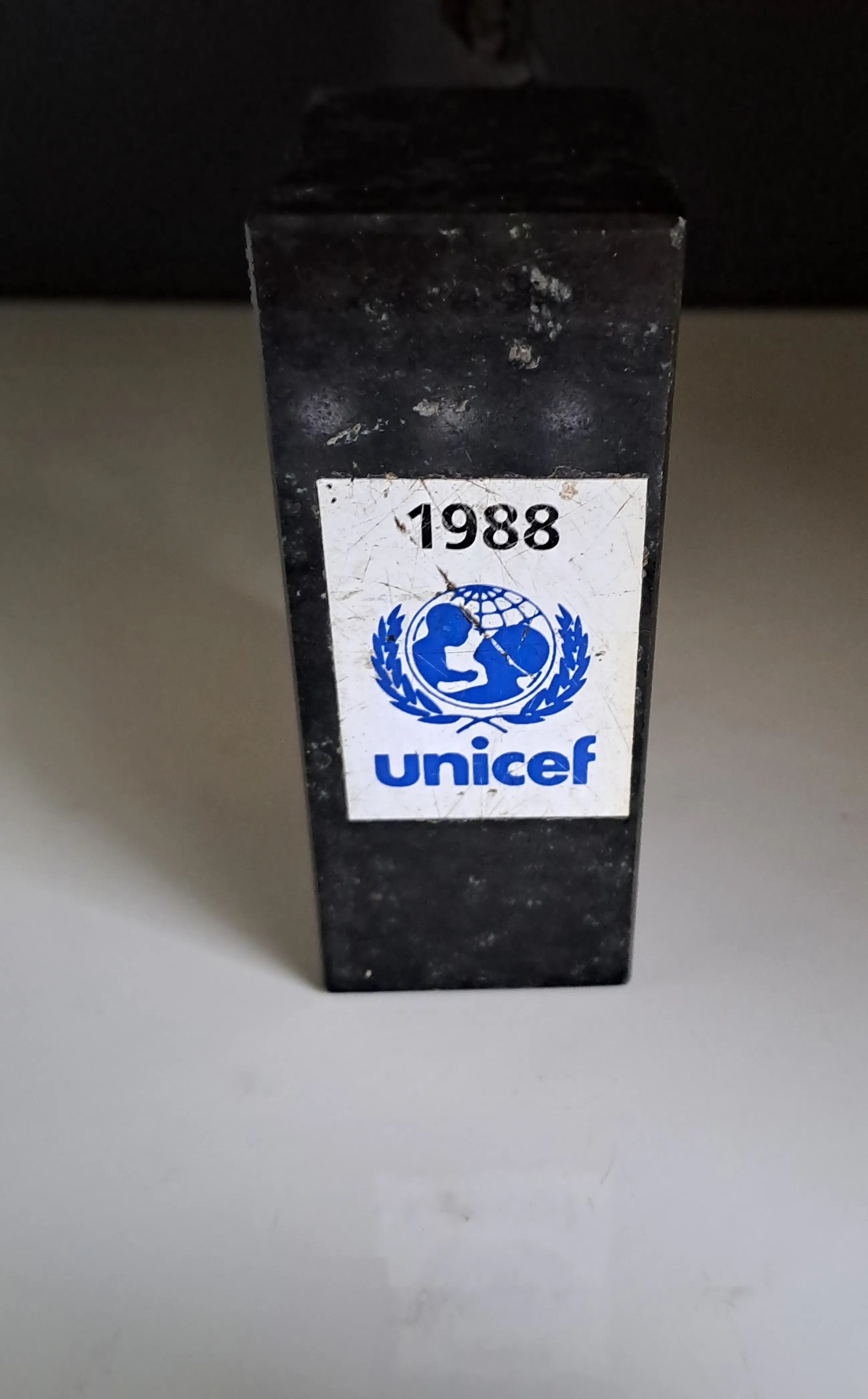 In opdracht van Unicef is deze sculptuur van de hand van Eric Claus uit 1988.