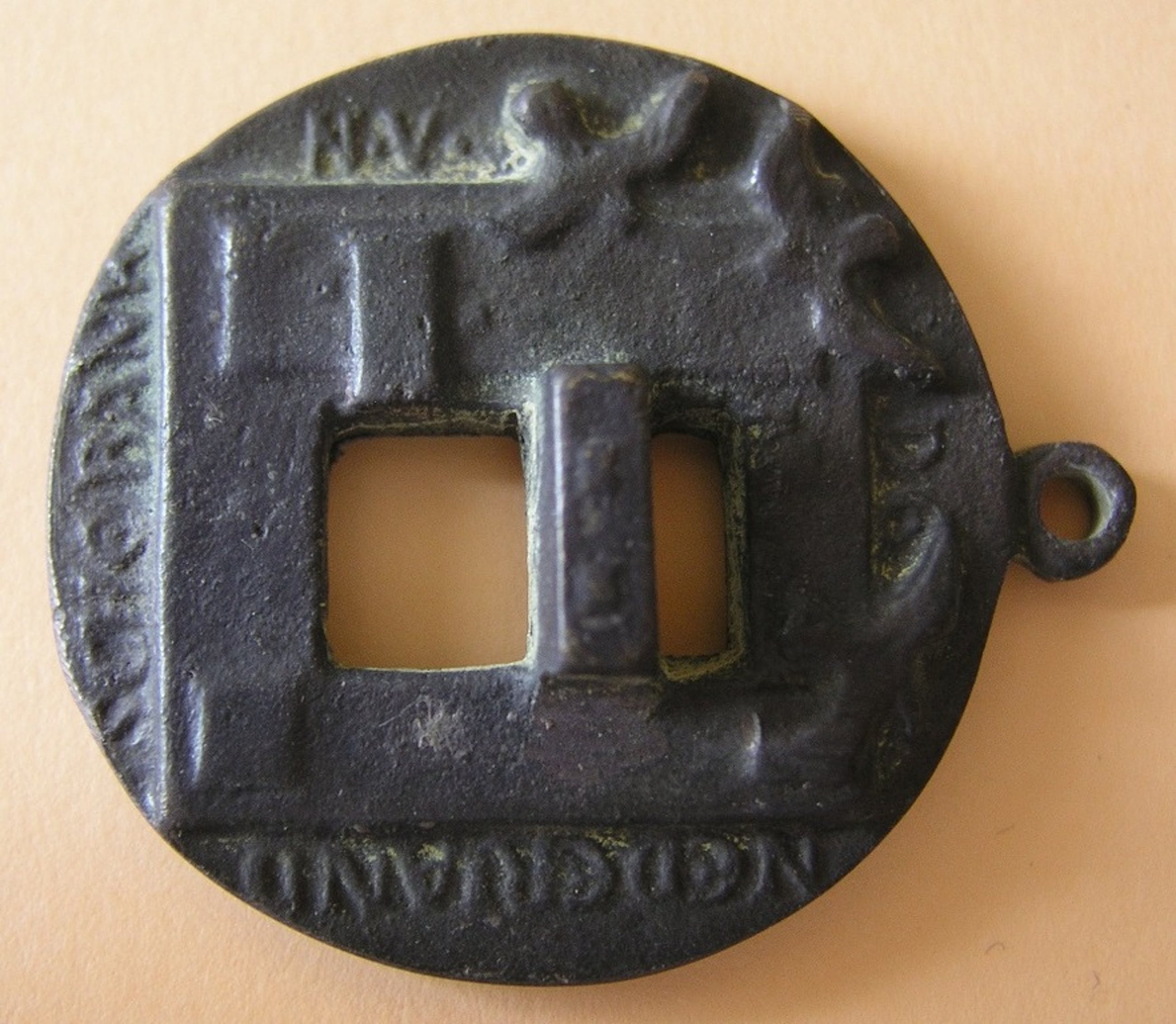 De hoofdbank in vogelvlucht, de uitsparingen (oost- en westplein) vormen aan de keerzijde het cijfer 10. Verder het bekende sleutelvignet van de bank, dienstbaar gemaakt als bevestigingsoog voor de sleutelring.