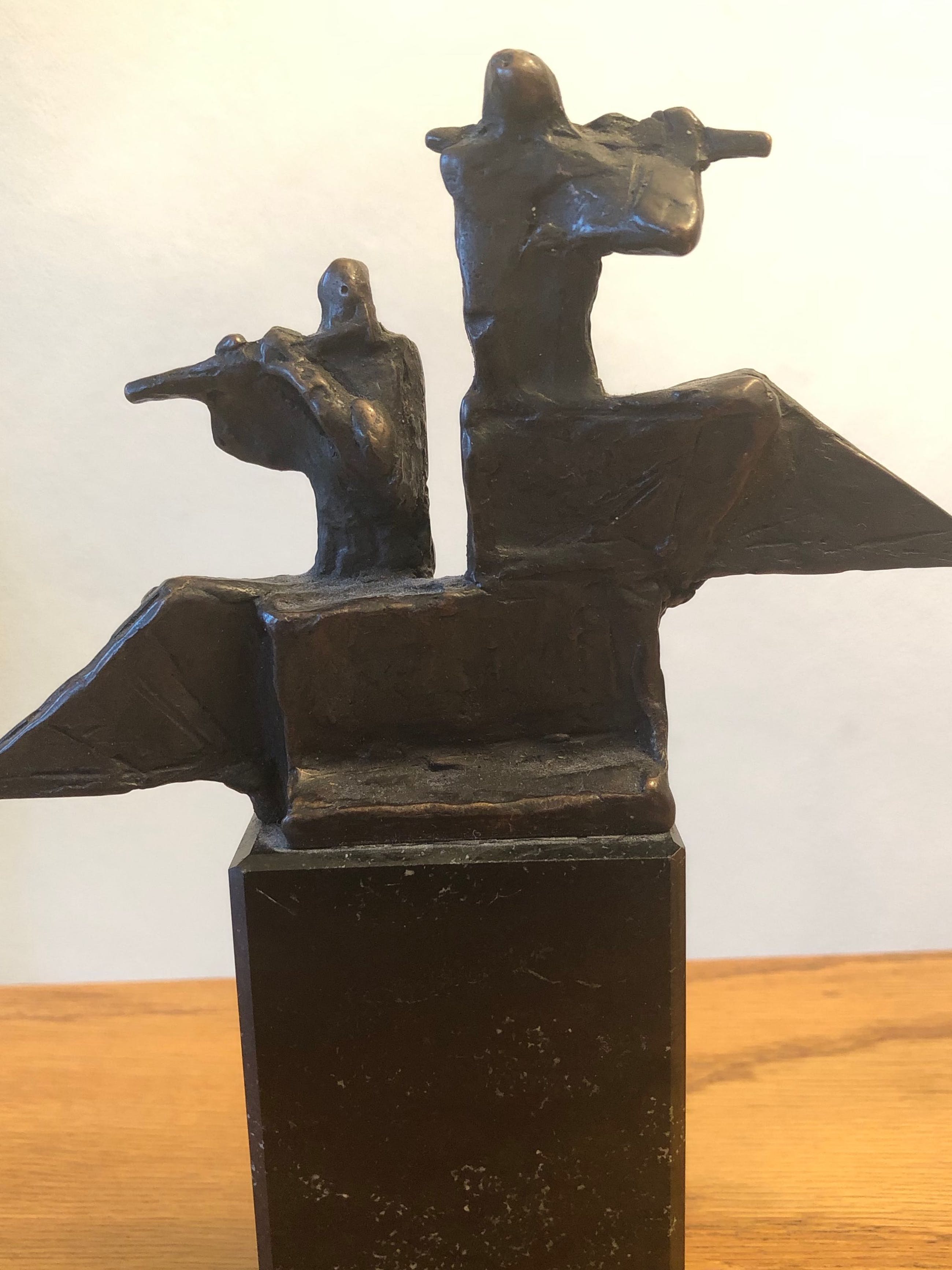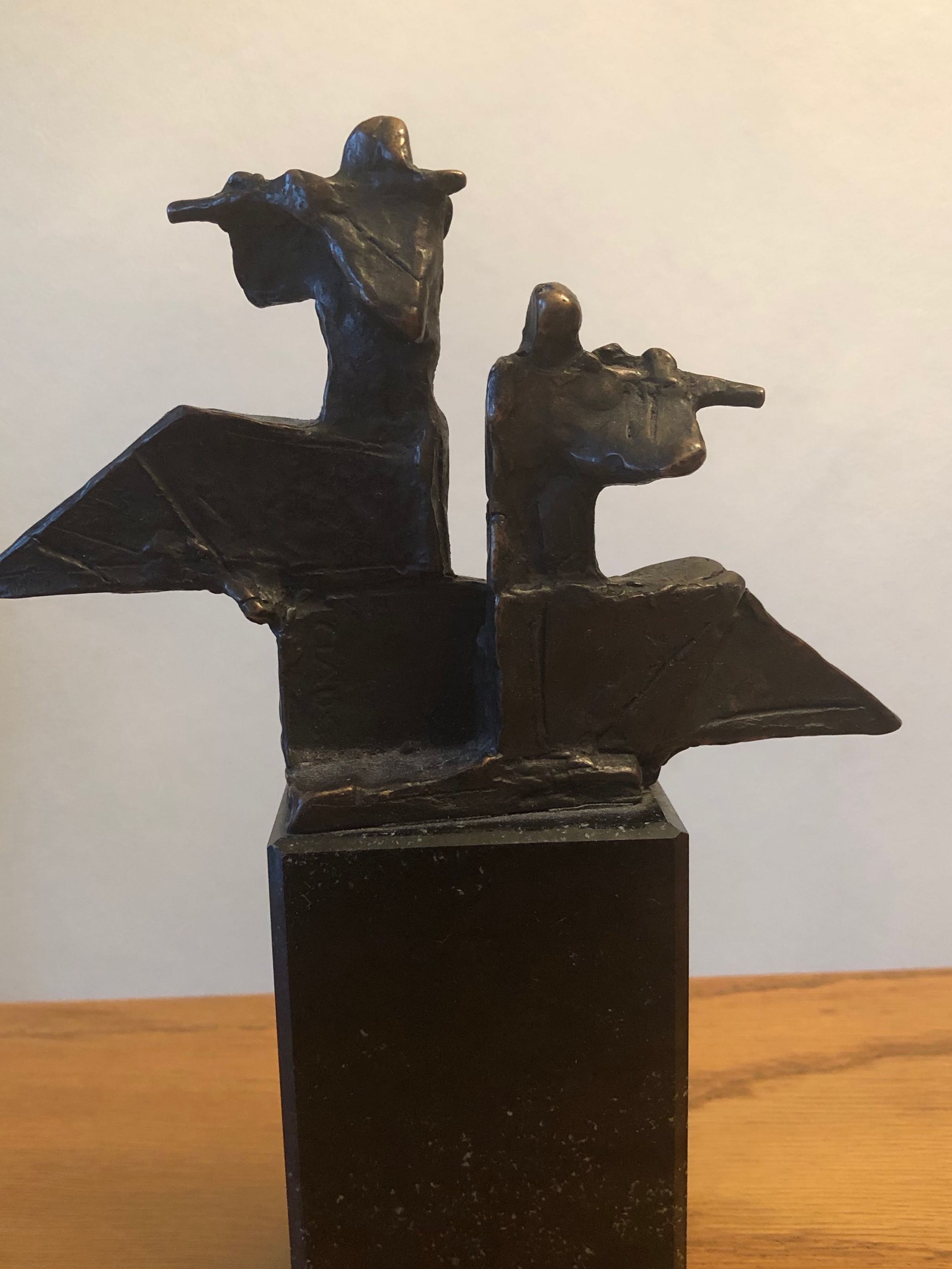 Mooi klein bronswerk van Eric Claus Nederlandse beeldhouwer, grafisch vormgever en medailleur. Twee zittende dwarsfluitisten. Werk aan beide zijden gesigneerd