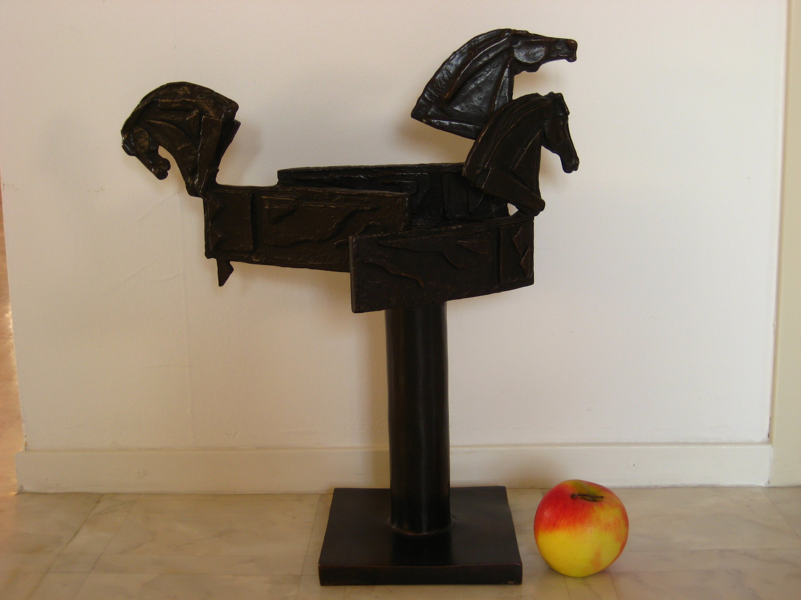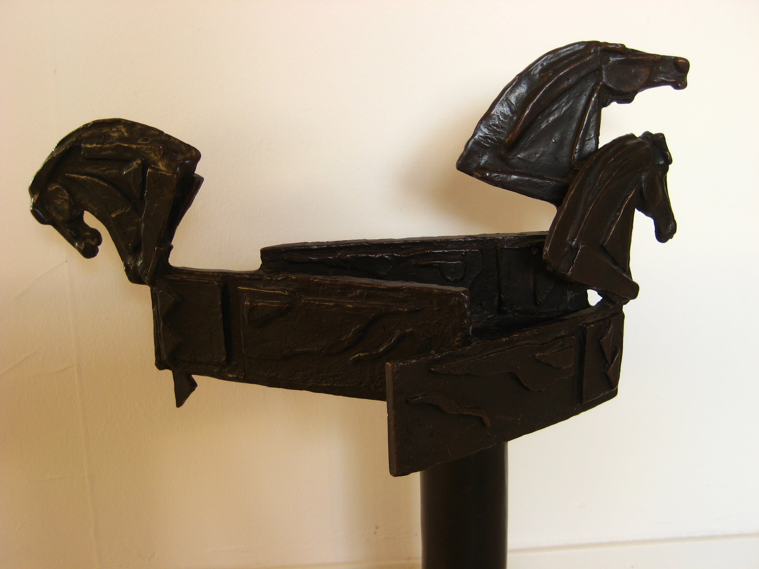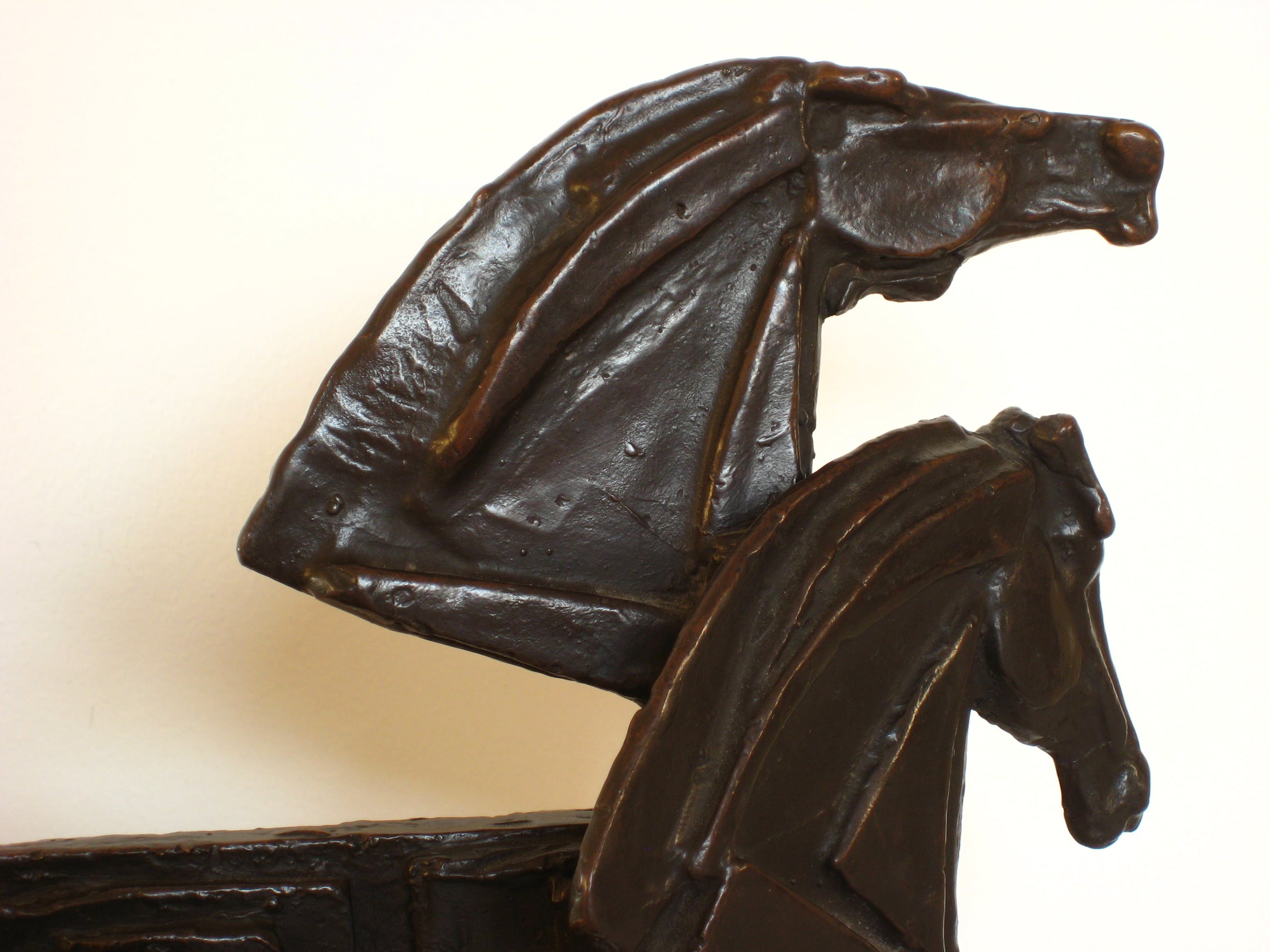 Bewust ongesigneerd. Groot brons beeld van drie met elkaar verbonden, gestileerde paardenhoofden. Afhalen of aangetekende, verzekerde verzending. =IN PRIJS VERLAAGD=