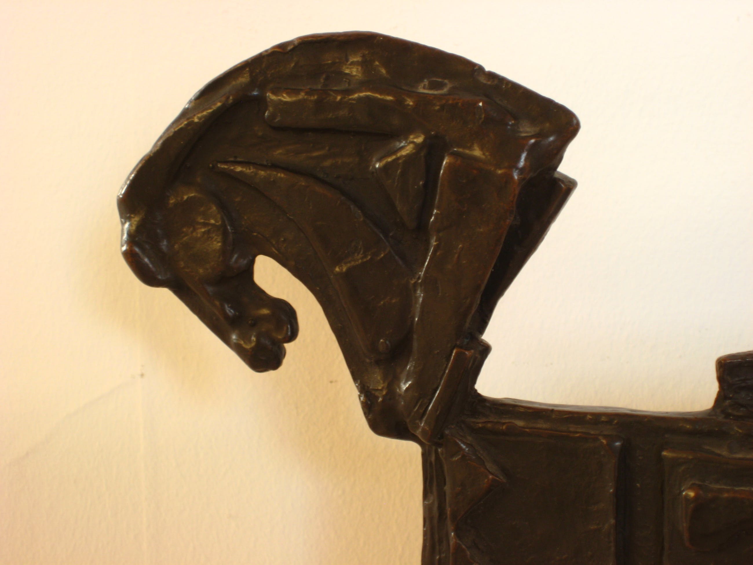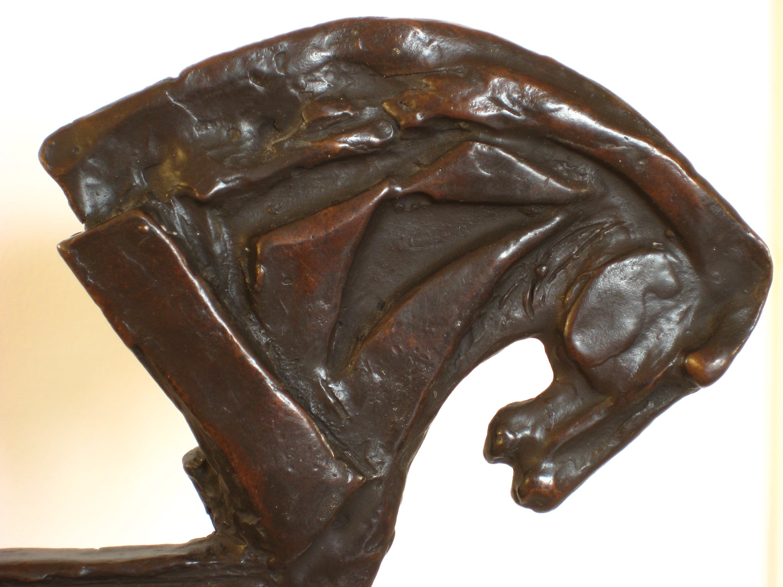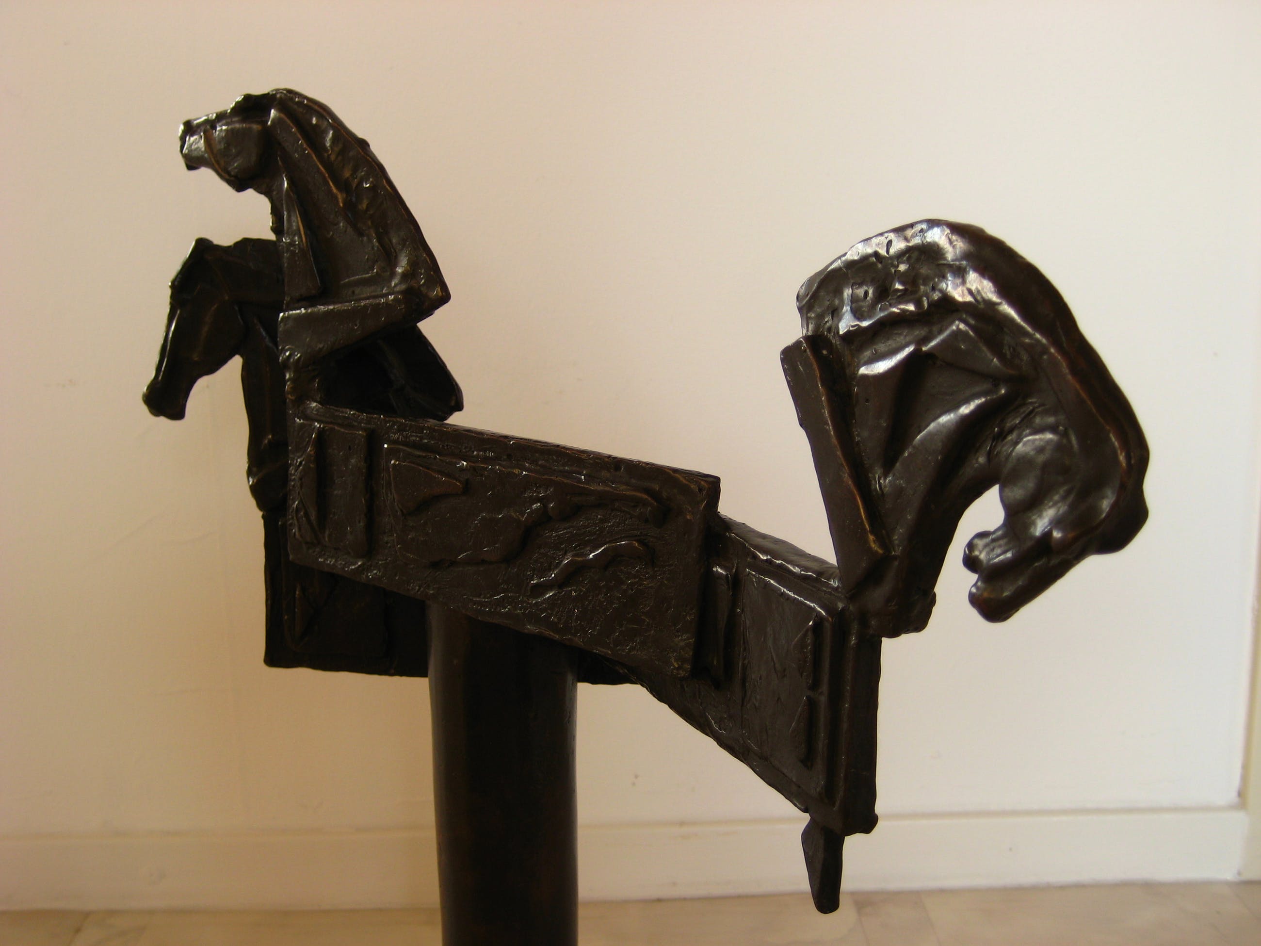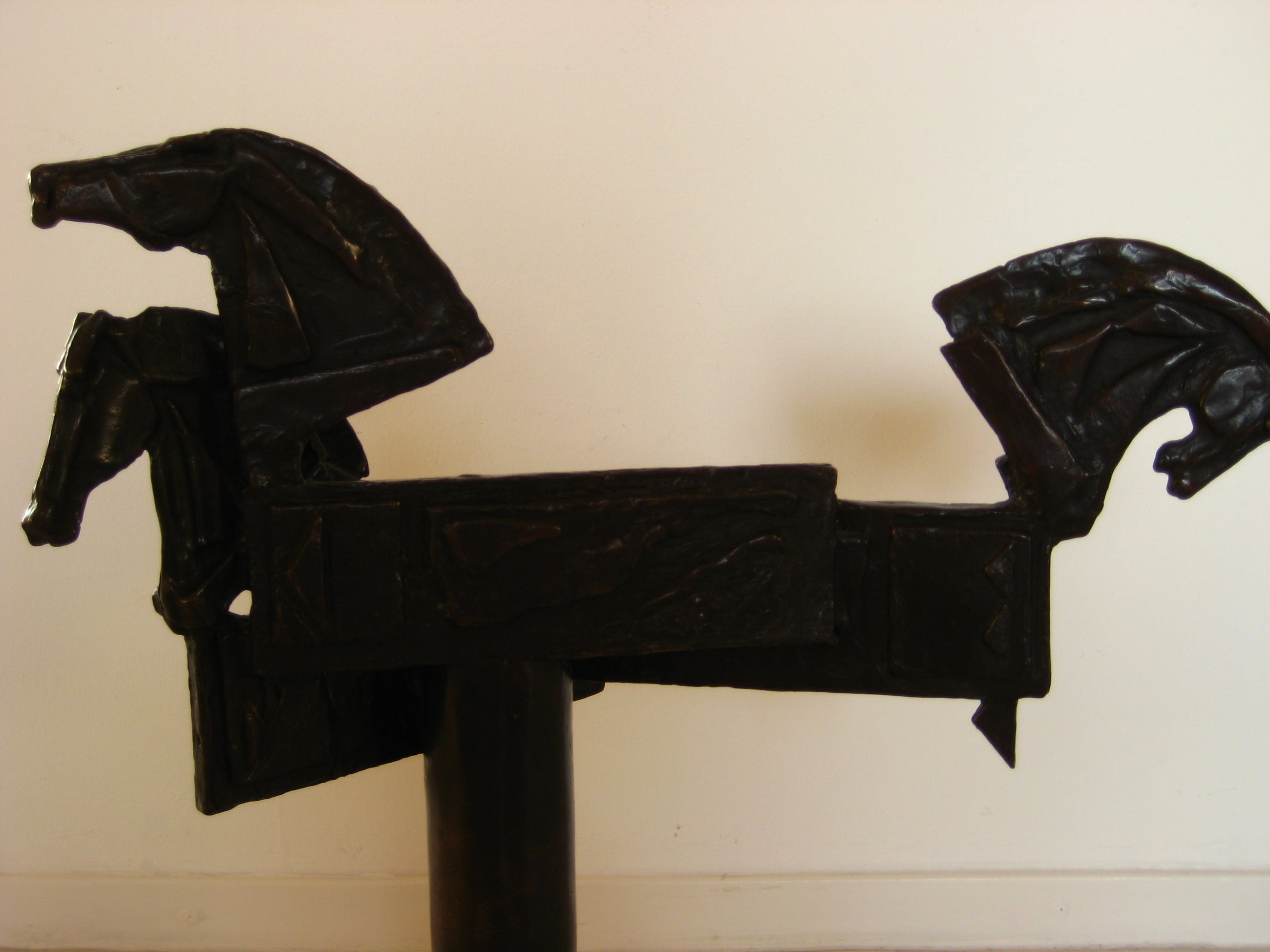 Bewust ongesigneerd. Groot brons beeld van drie met elkaar verbonden, gestileerde paardenhoofden. Afhalen of aangetekende, verzekerde verzending. =IN PRIJS VERLAAGD=