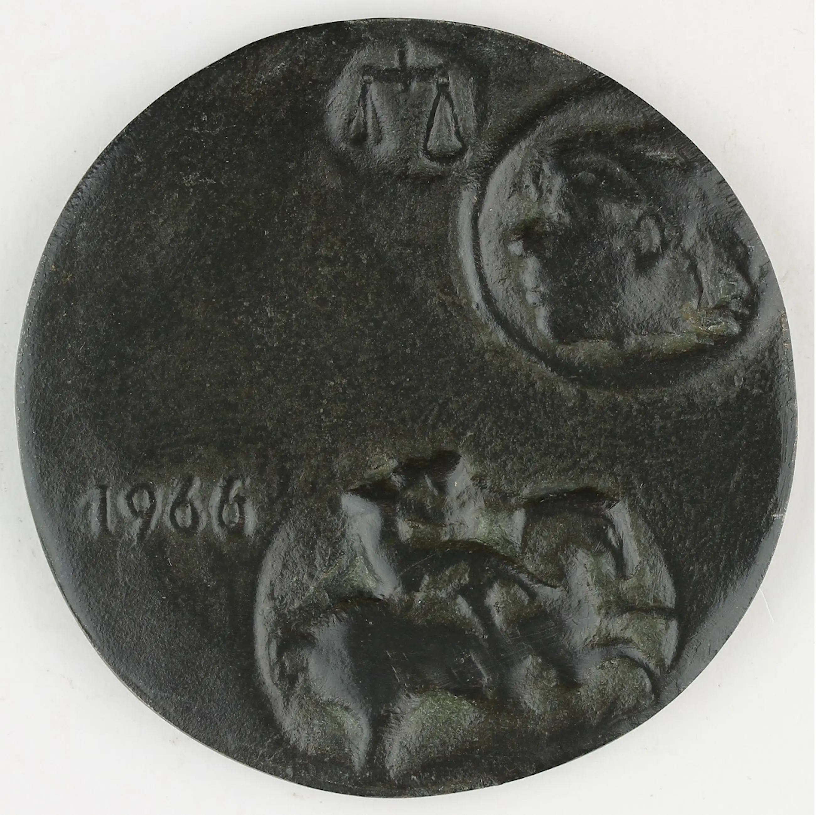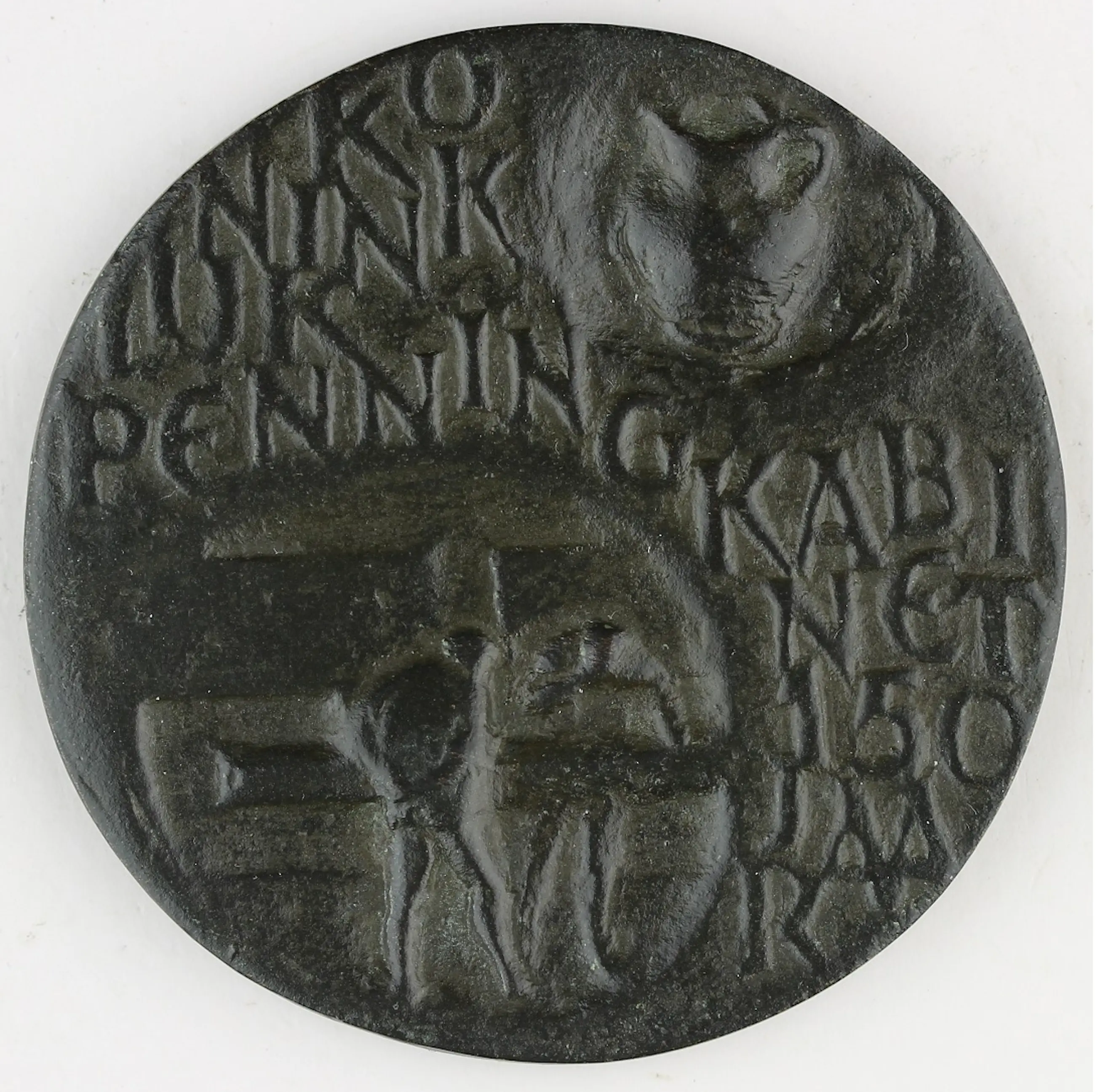 Claus heeft de lastige opgave 150 jaar Koninklijk Munt-en Penningkabinet te herdenken op een knappe wijze opgelost door de cirkelvorm verschillende malen te laten terugkomen - bij munten en penningen denken wij tenslotte aan een cirkelvorm. Een losse belettering, geschikt rond een voorstelling van twee bezoekers van de tentoonstelling, aandachtig gebogen over een vitrine. Daarboven een kannetje dat een muntschat geherbergd heeft, die door de staf van het Penningkabinet schoon gemaakt, onderzocht en gepubliceerd is. Op de andere zijde (ook zo aardig: er is eigenlijk geen hiërarchie) worden een munt en een penning gesuggereerd: de munt door een kopje, de penning door een paard en ruiter, een tijd lang een favoriet thema van Claus. Een muntweegschaaltje verwijst naar de wetenschappelijke bewerking van het materiaal. Het was een overname door de Vereniging van een opdracht aan Claus die het Ministerie van CRM voor deze gelegenheid had gegeven. #Louk Tilanus, Handzame Sculptuur