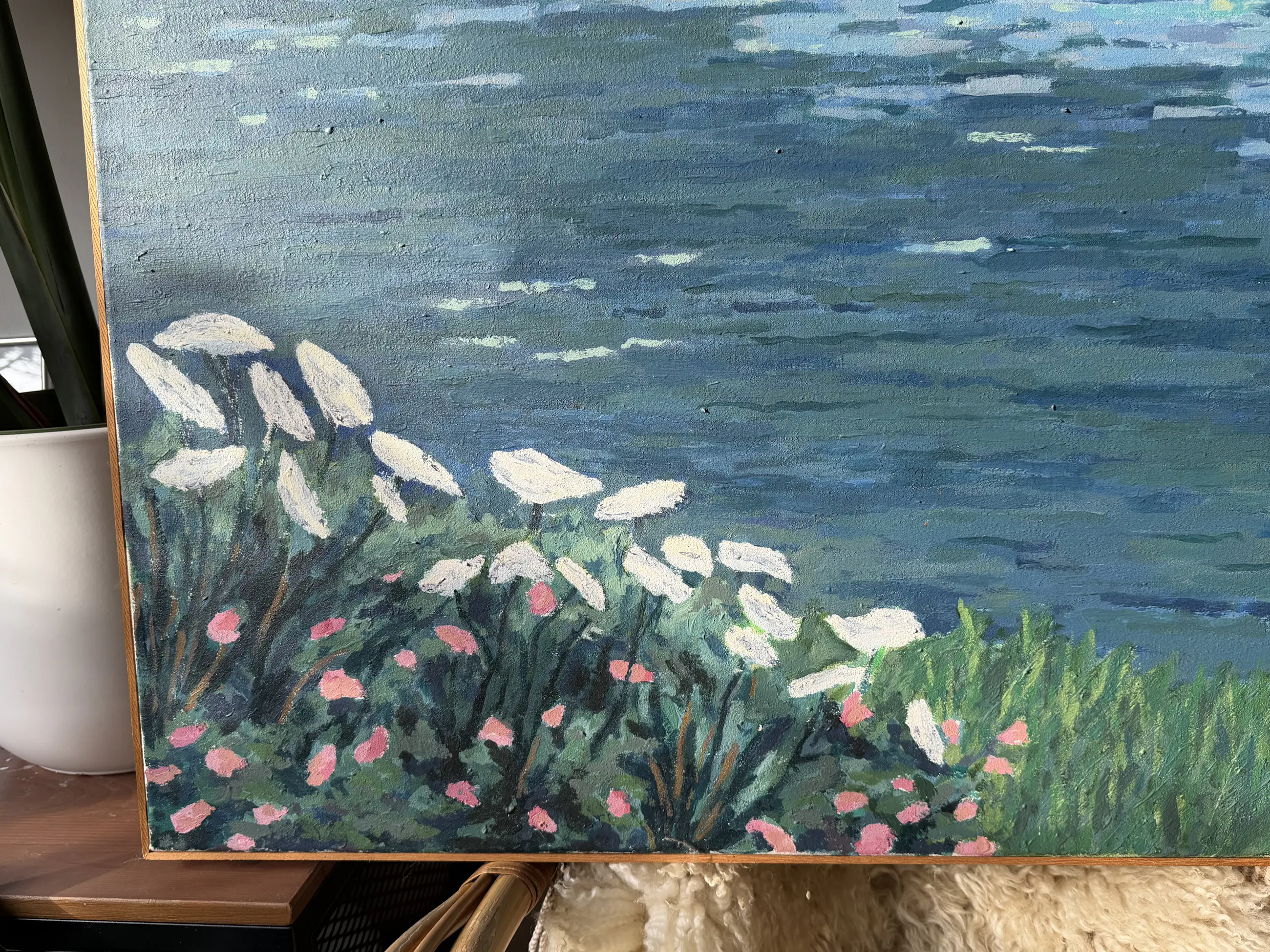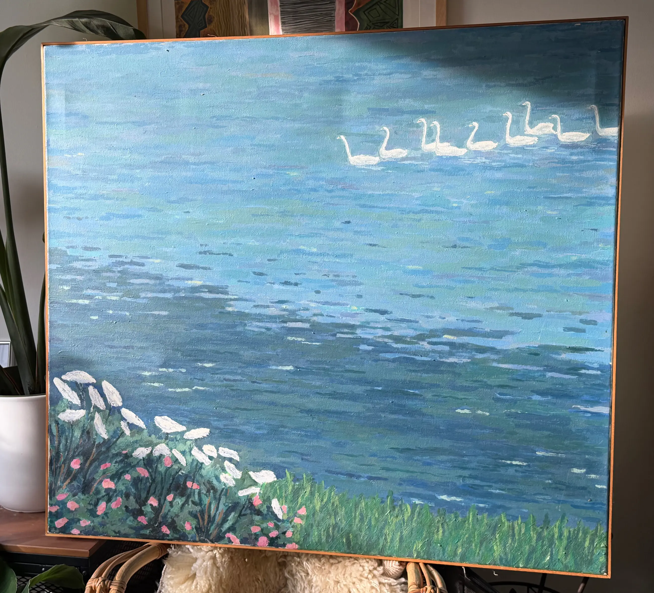 Het werk toont een serene waterpartij met zachte blauwtinten, witte zwanen in de verte en een bloemrijke oever op de voorgrond, een rustgevend en tijdloos beeld dat in vrijwel elk interieur tot zijn recht komt.