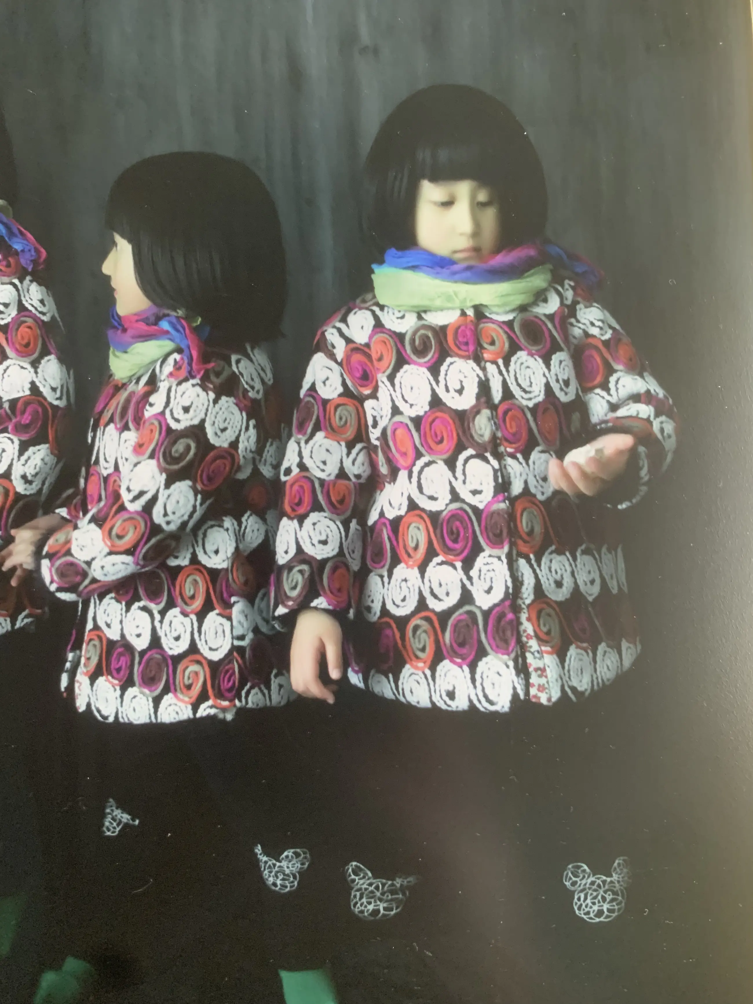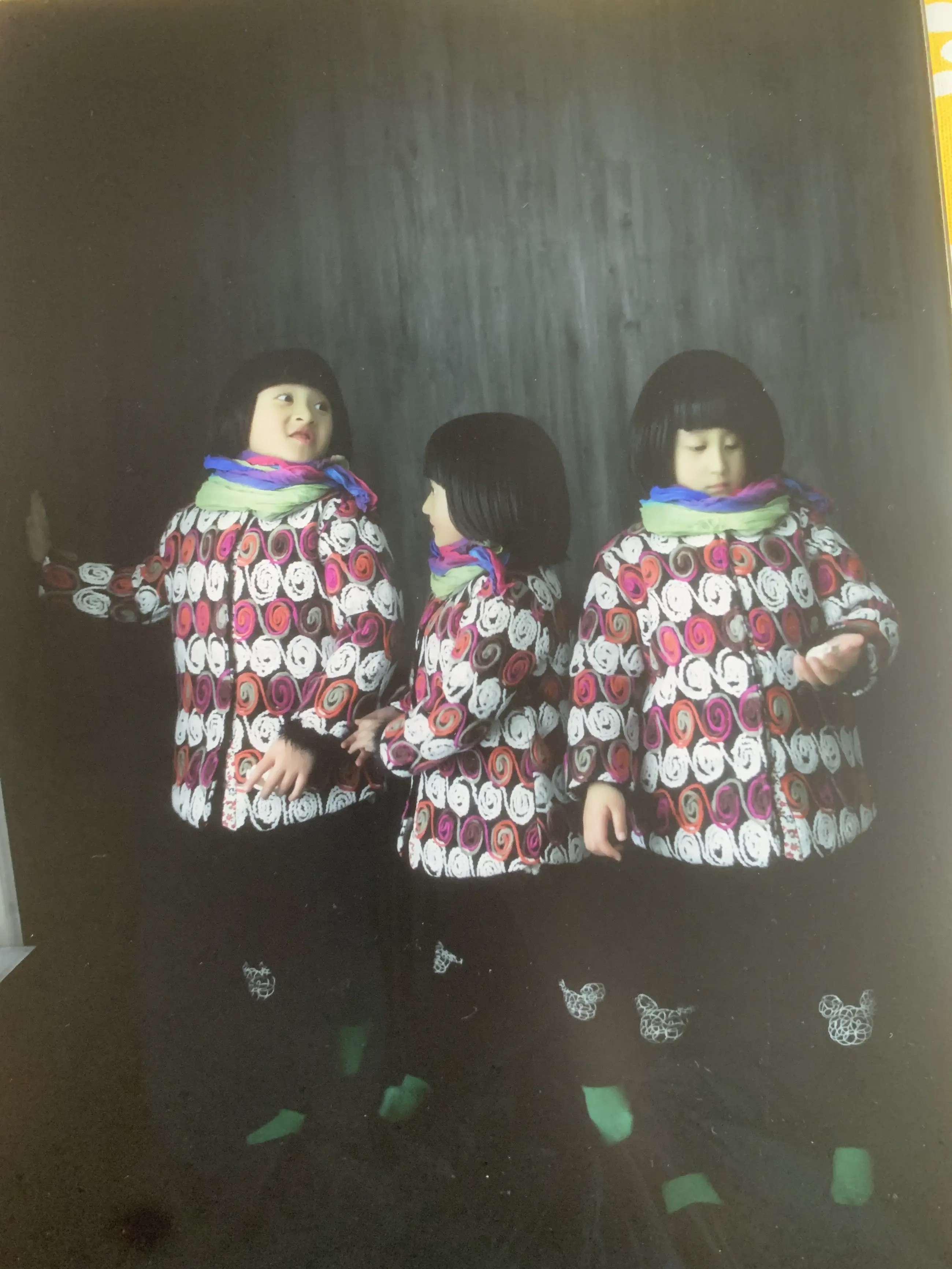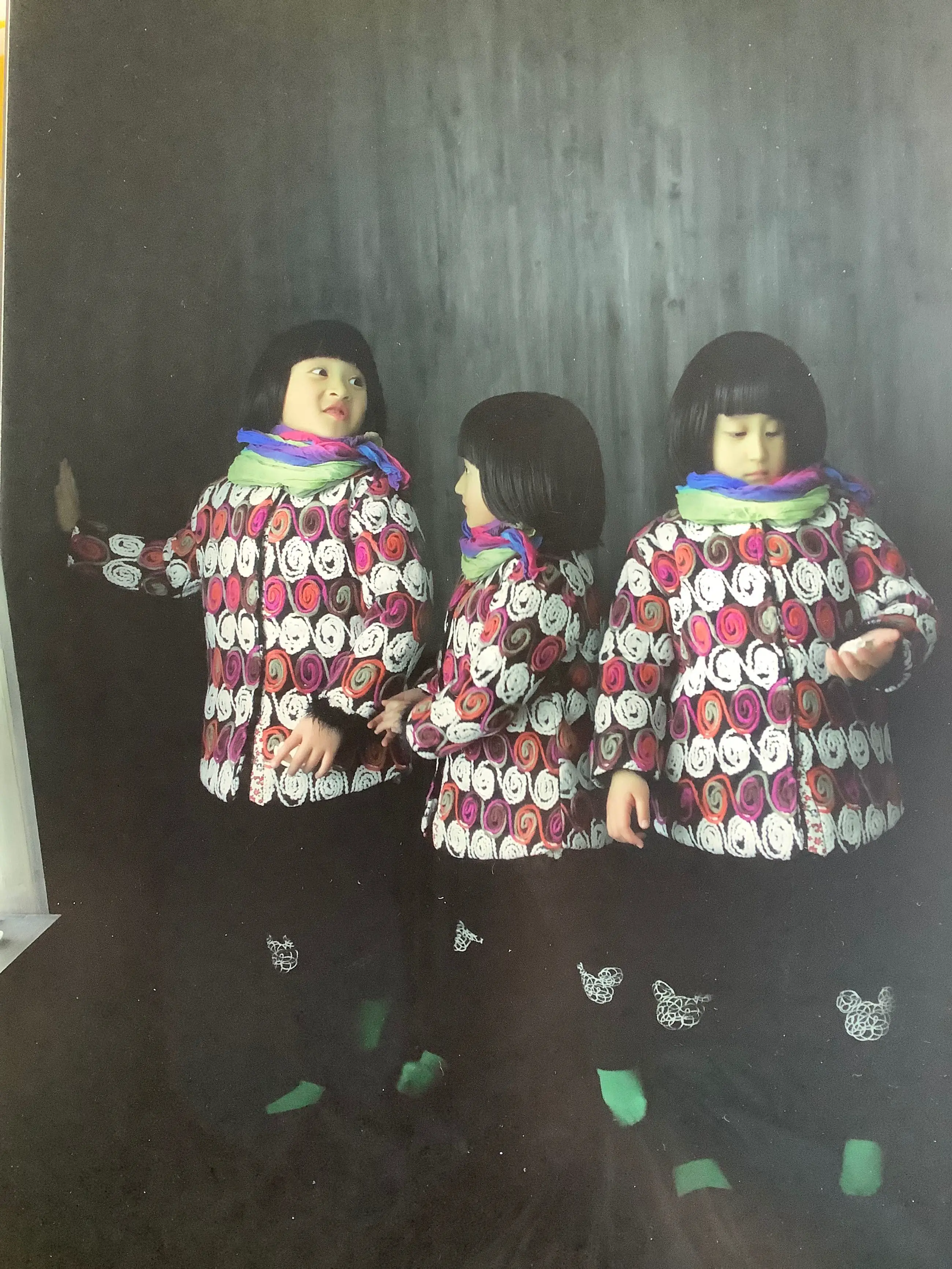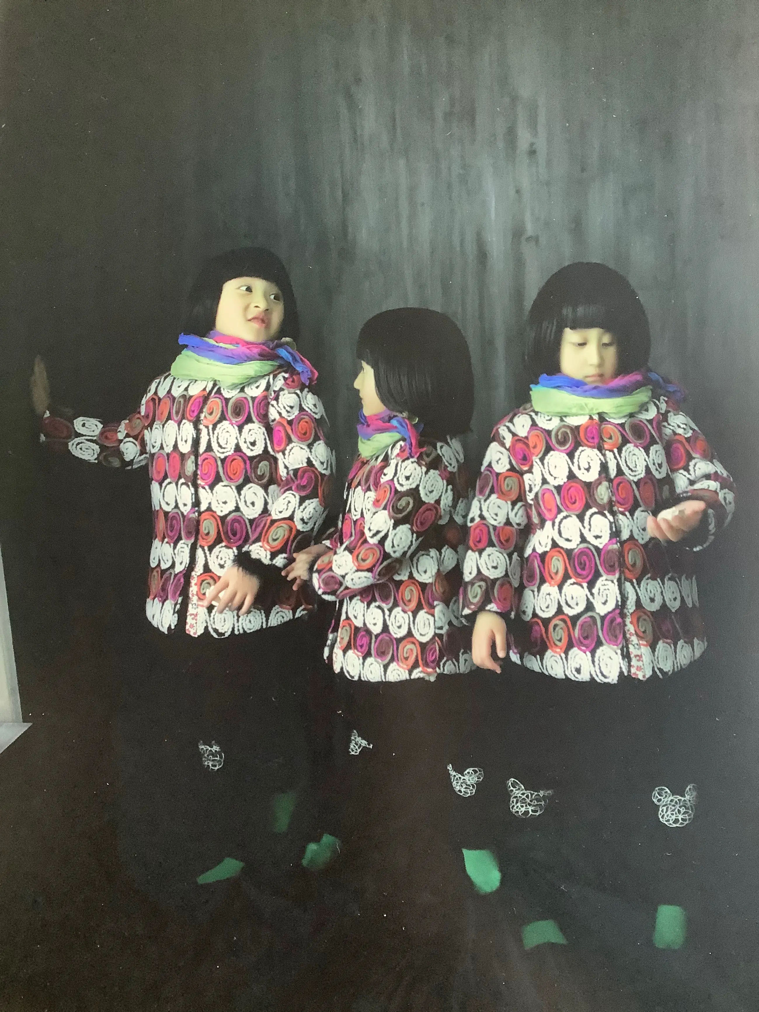 Het zelfde kind is 3 keer afgebeeld in deze foto. Een toespeling op de 1 kind politiek in China. We zien 3 kanten van haar persoonlijkheid afgebeeld Speels,onderzoekend, en eenzaam. Kan zo aan de muur