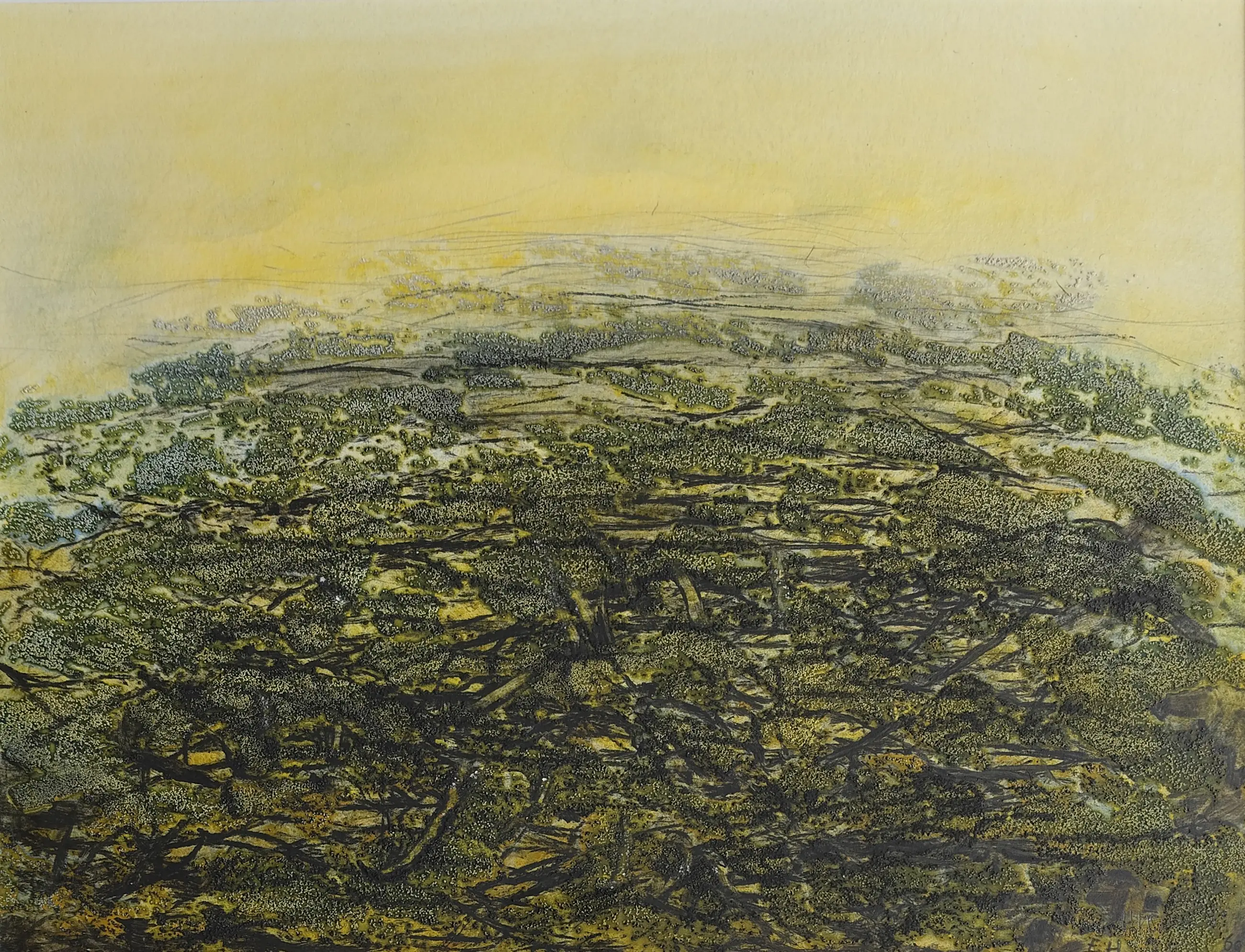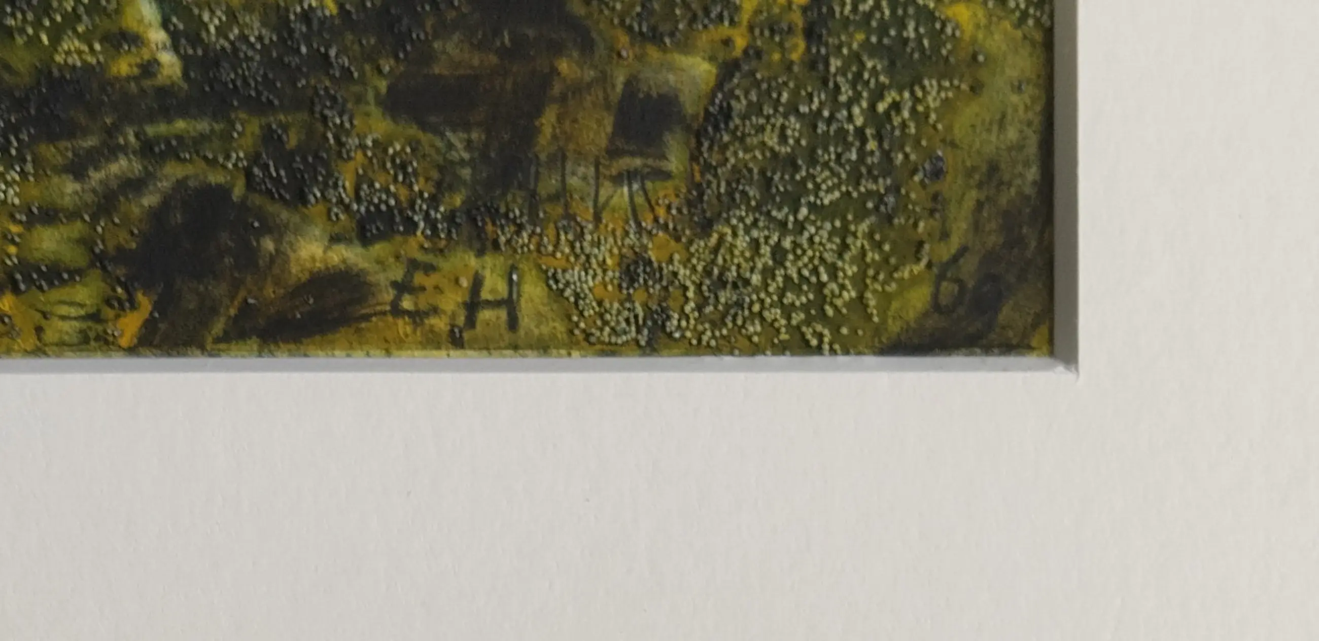 Eric Hirdes (1956) ingelijst gemengde techniek op papier. Rechts is het werk gesigneerd met EH. Afmeting werk ca. 31.5 x 40.5 cm (hxb) Afmeting witte houten lijst 53 x 63 cm. (hxb) Het werk is in prima staat. De lijst heeft een paar krasjes / verf verlies.