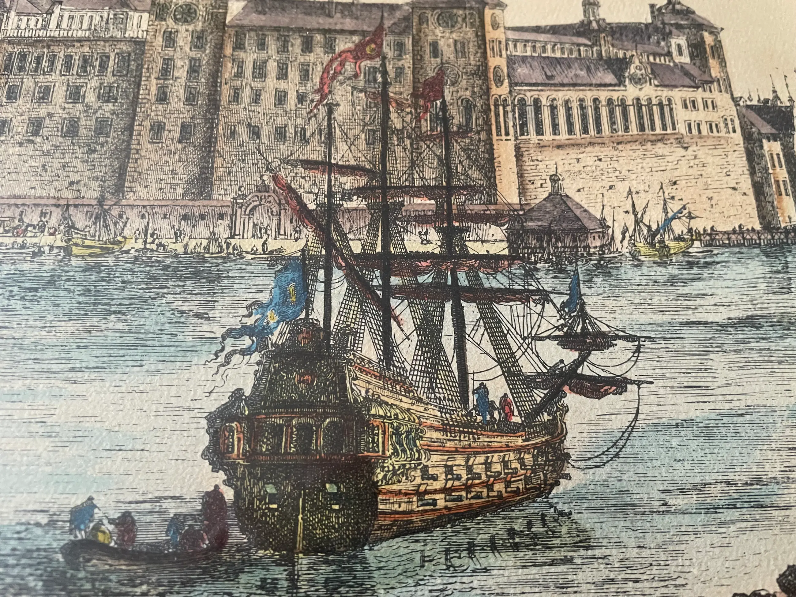 Voorstelling: Op de voorgrond zie je schepen in de haven van Stockholm en diverse figuren aan de waterkant. Het kasteel Tre Kronor domineert de linkerkant van de compositie.