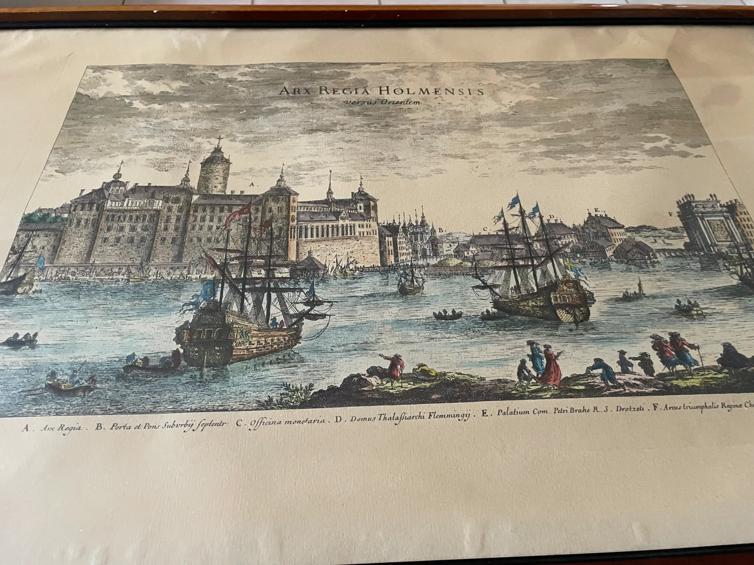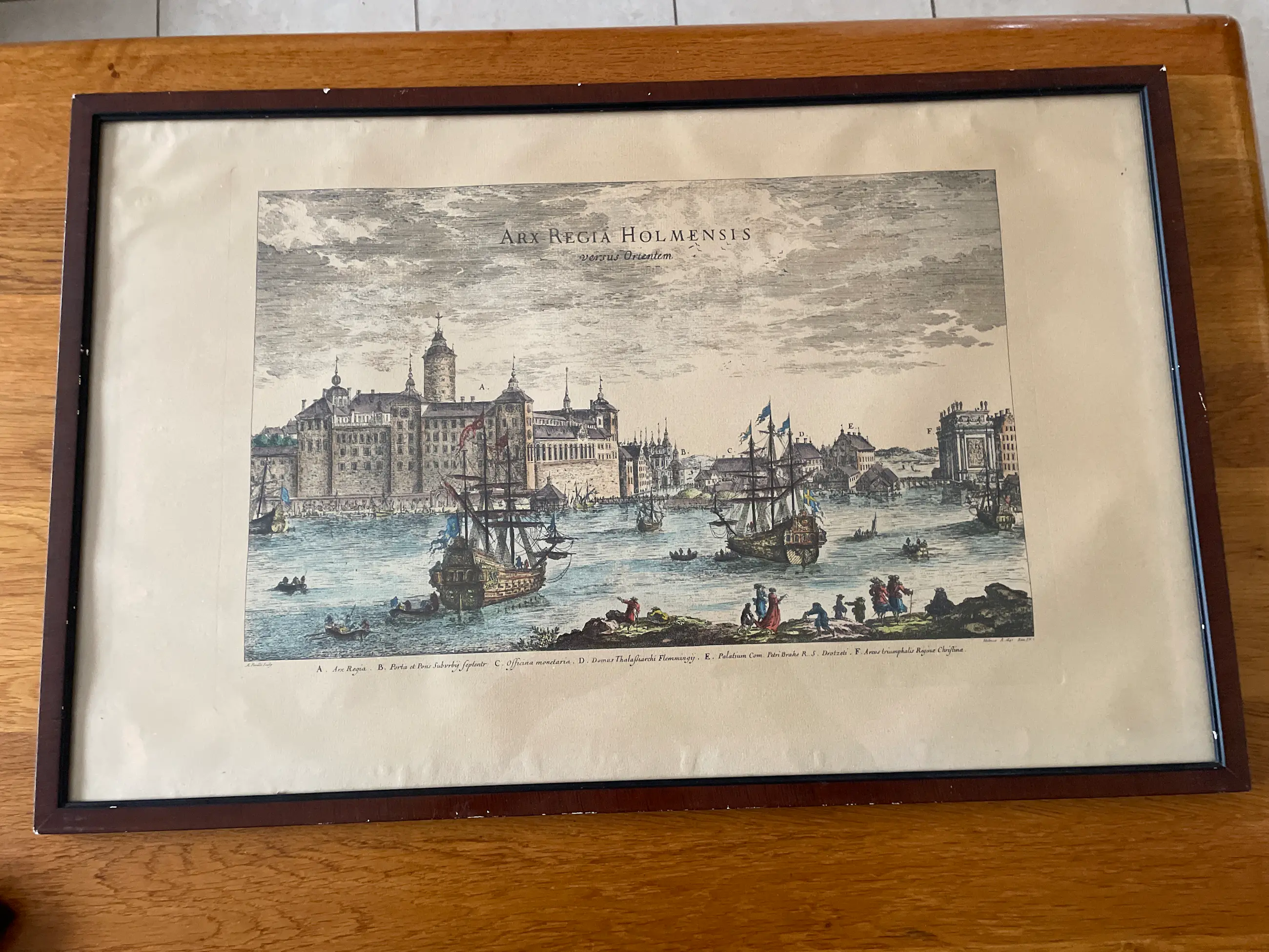 Dit is een antieke kopergravure met de titel "Arx Regia Holmensis versus Orientem", wat Latijn is voor "Het Koninklijk Paleis van Stockholm vanuit het oosten".