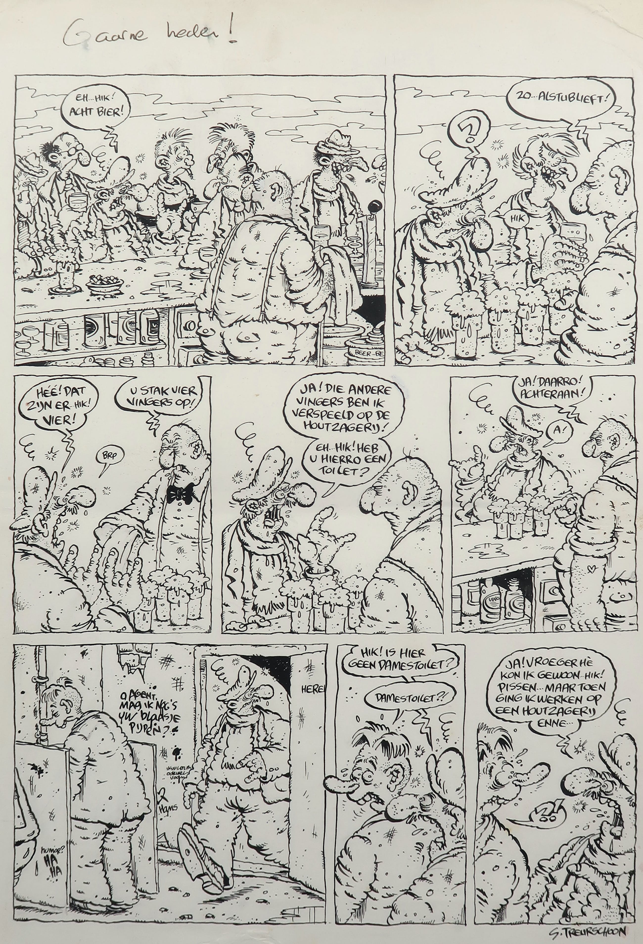Originele tekening van Joop Klepzeiker, getiteld ''Damestoilet''. Deze pagina is gepubliceerd geweest in weekblad Revu en in albumvorm.