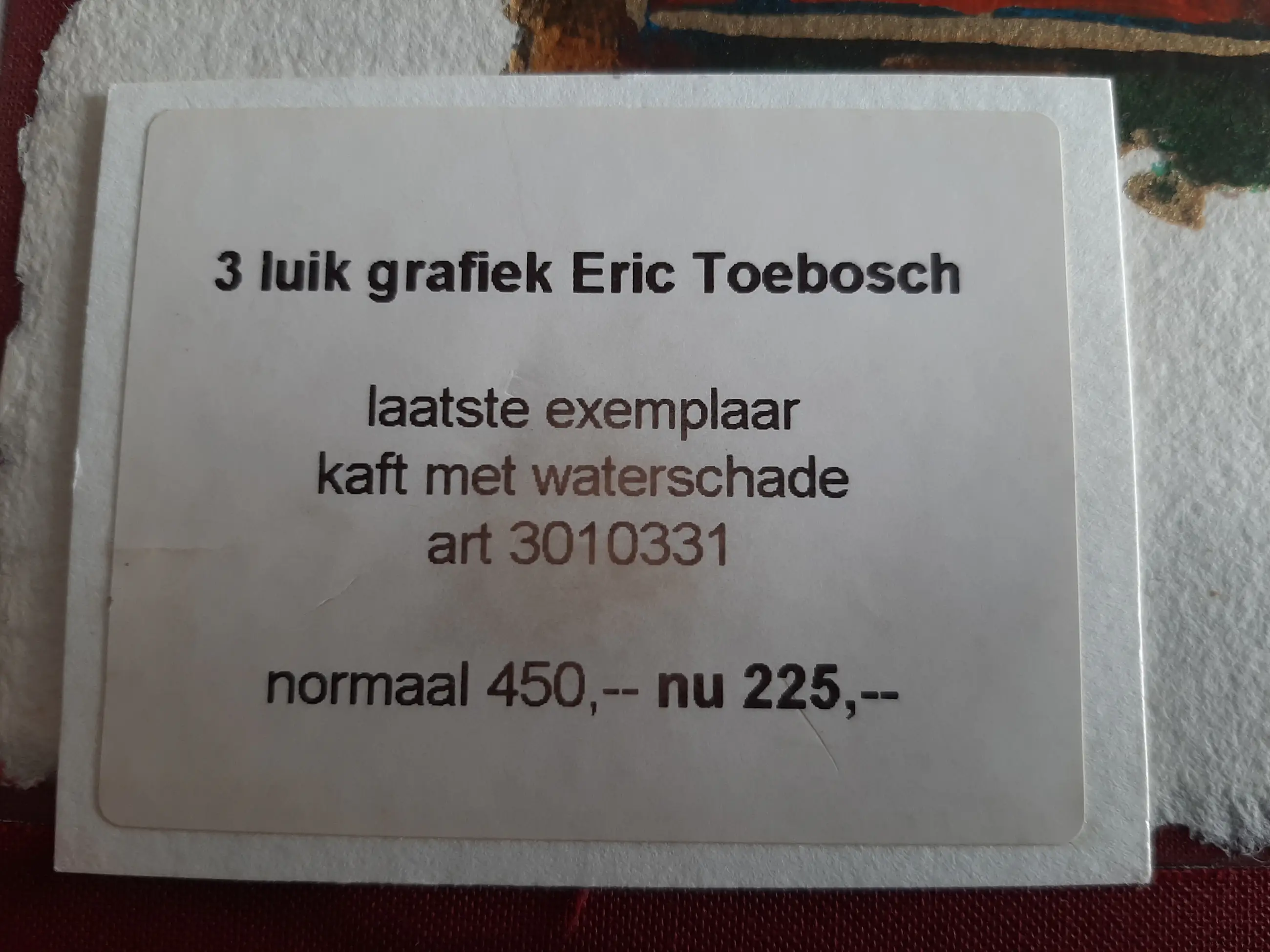 3 Luik van Eric Toebosch zeefdrukken in kleur, elk H. 32 x B. 22 cm.