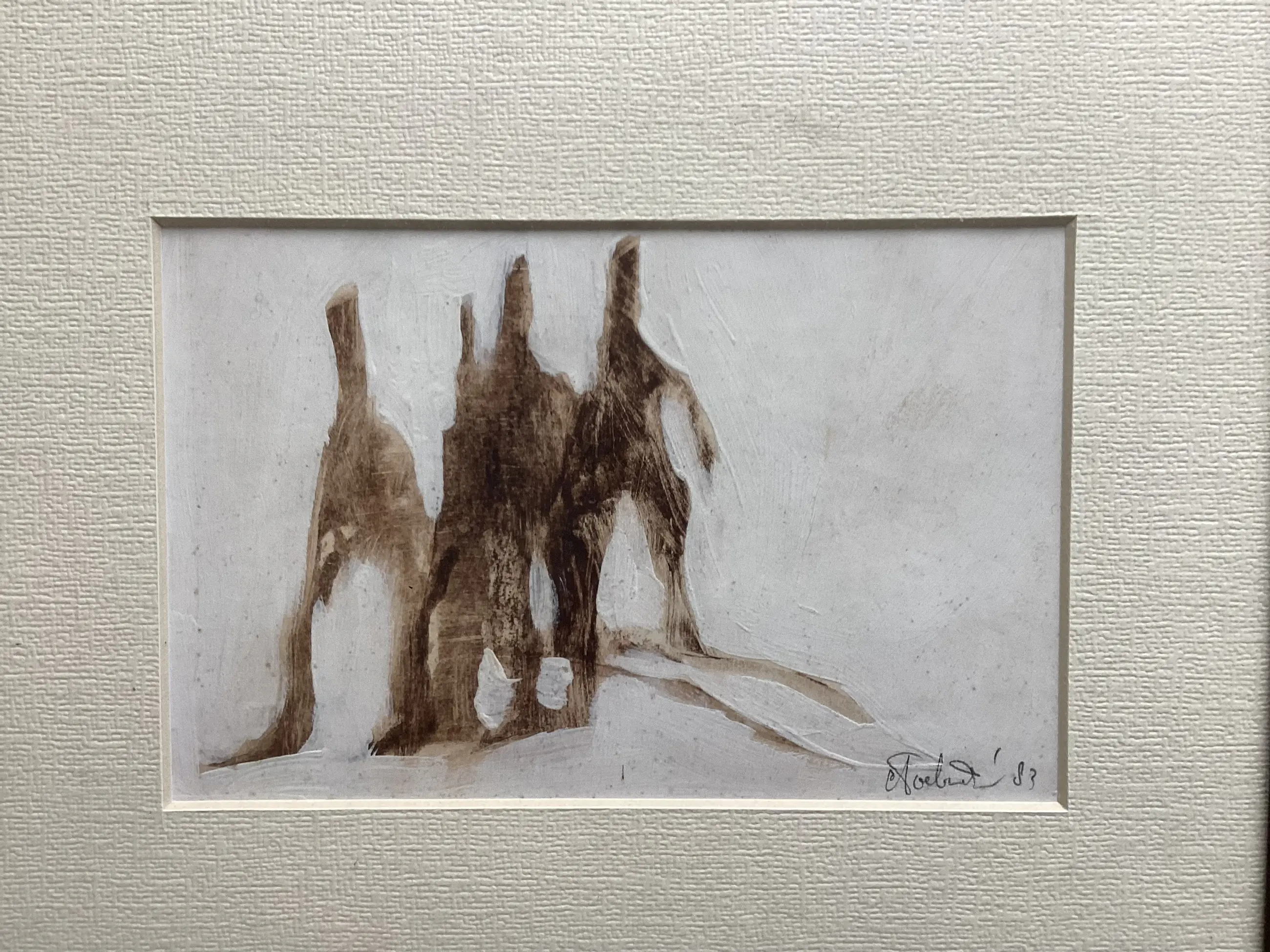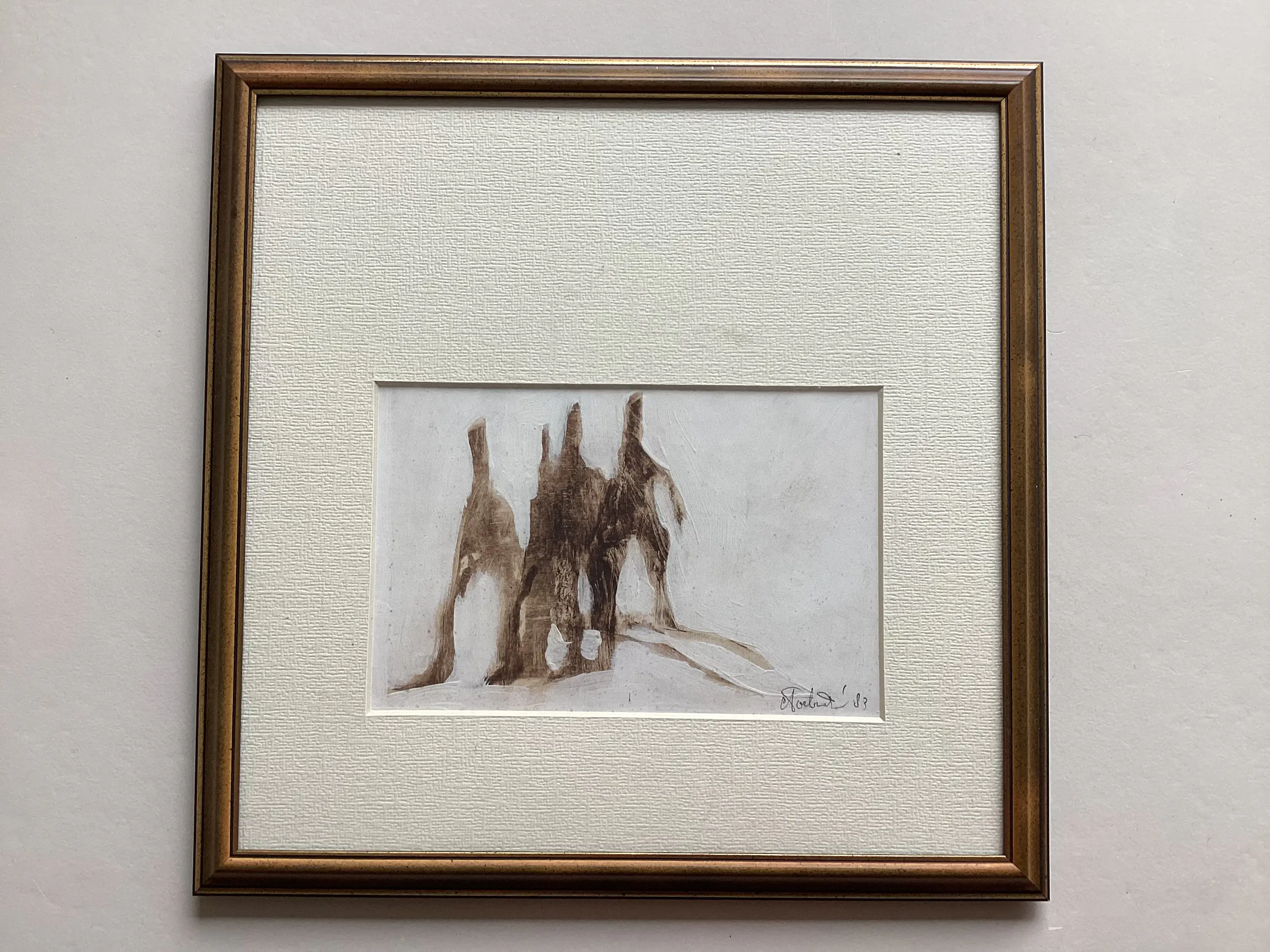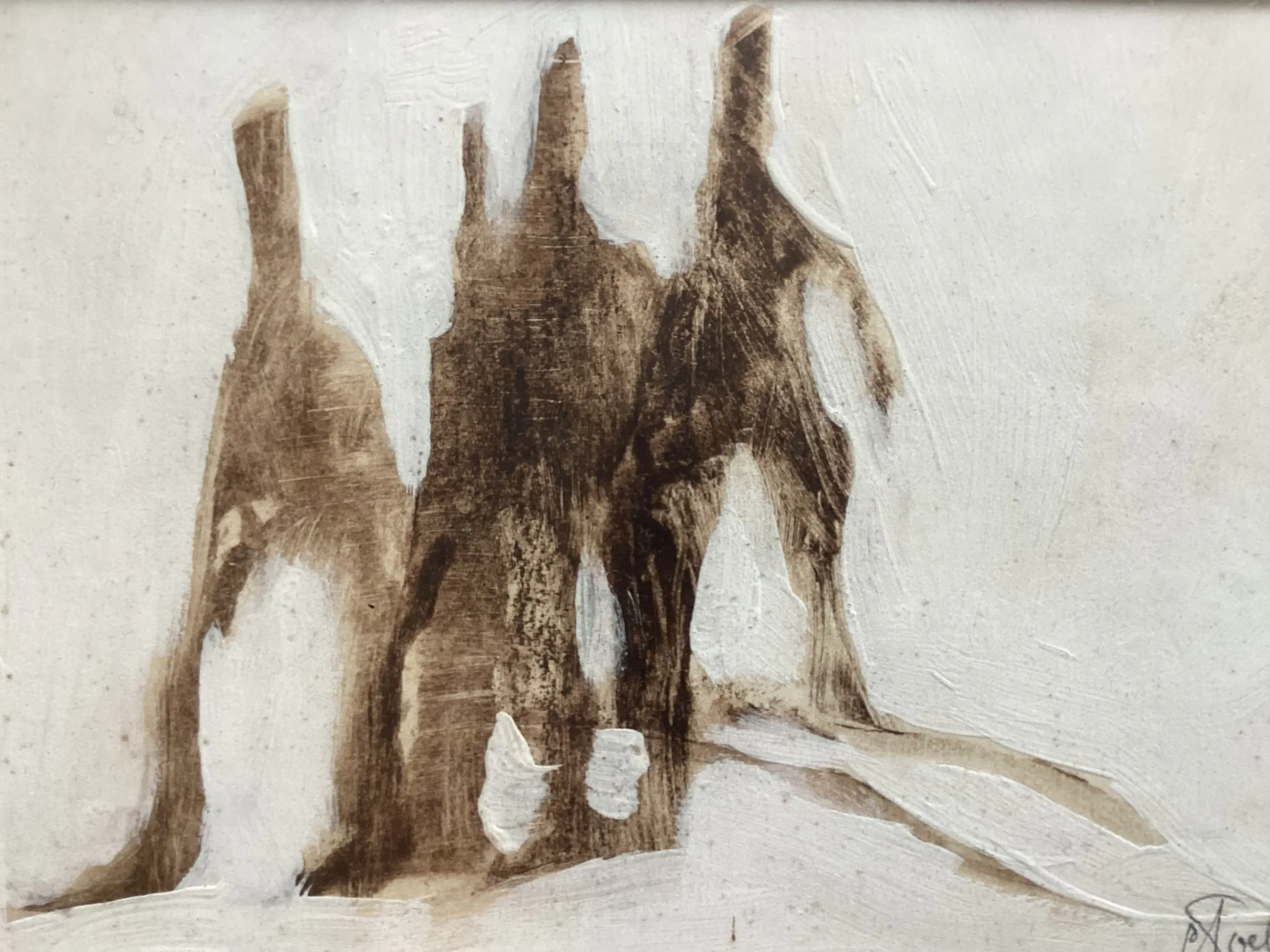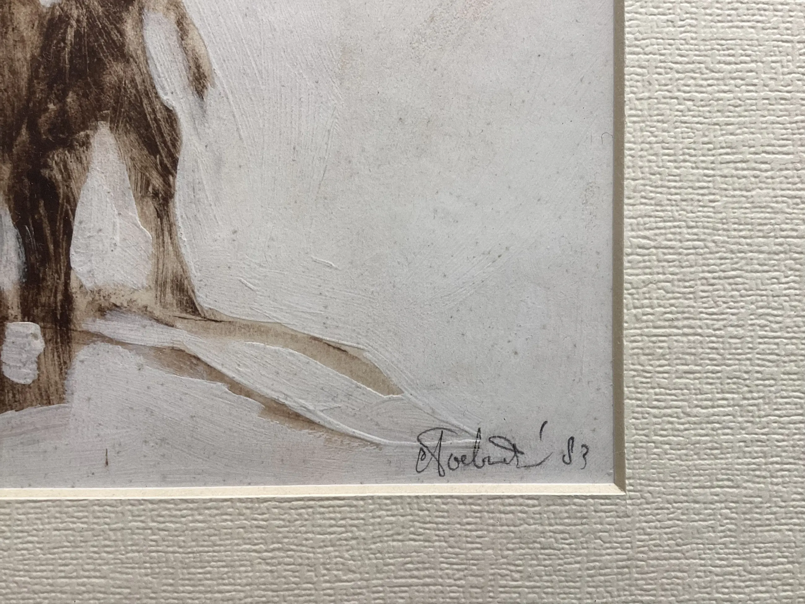 Gemengde techniek op karton van Eric Toebosch. Incl houten lijst met ontspiegeld glas. Formaat incl 32 x 32 cm, beeld 13 x 20 cm. R.o. Potlood gesigneerd, 1983.