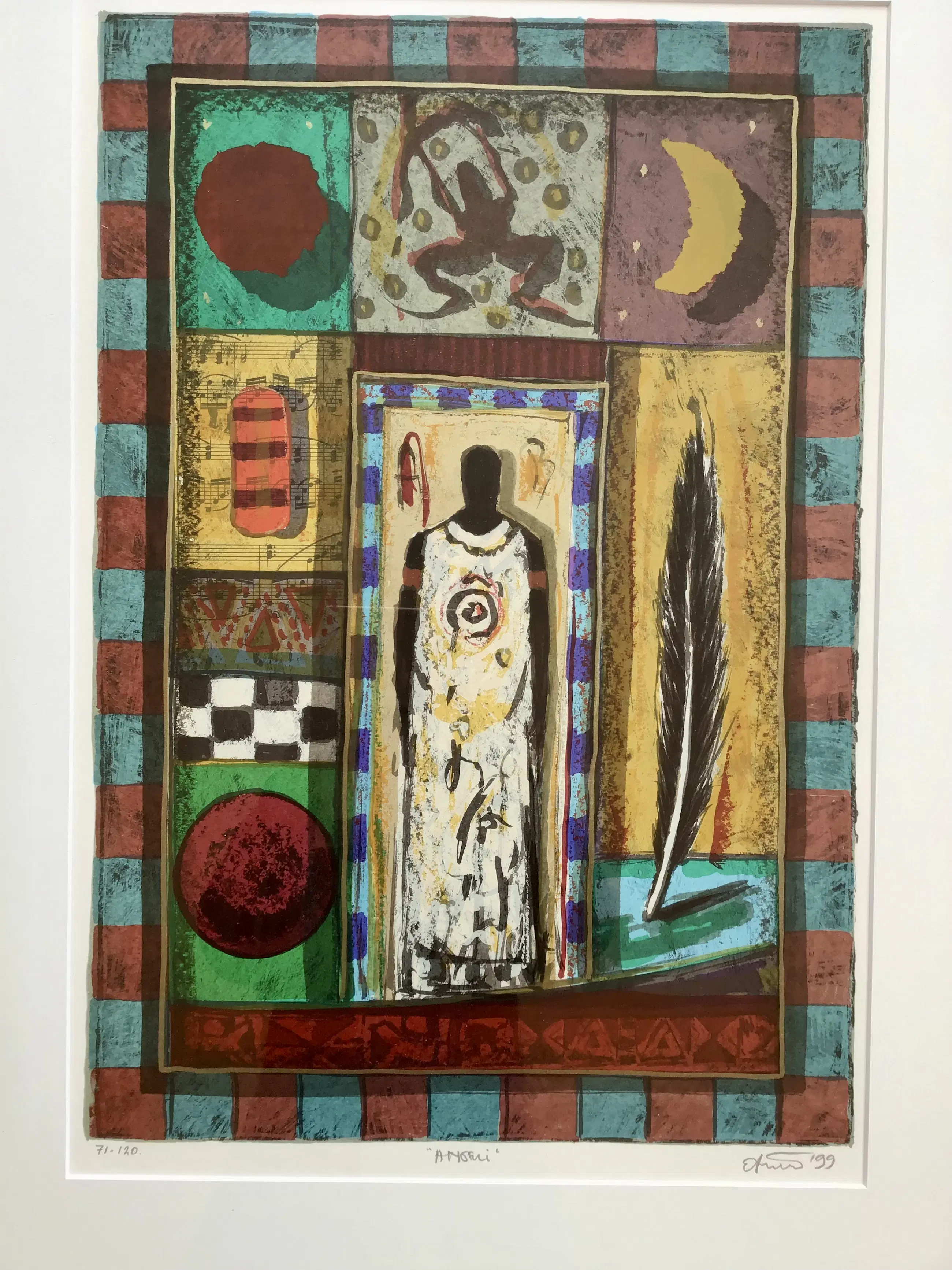 Eric Toebosch grote zeefdruk Titel Angeli Jaar 1999 Hand gesigneerd en betiteld Oplage 120, waarvan deze nummer 74 Afmetingen 96x65 cm incl lijst Conditie uitstekend Wordt aangetekend verzonden zonder lijst Indien afgehaald mooie lijst gratis en dus ophang gereed