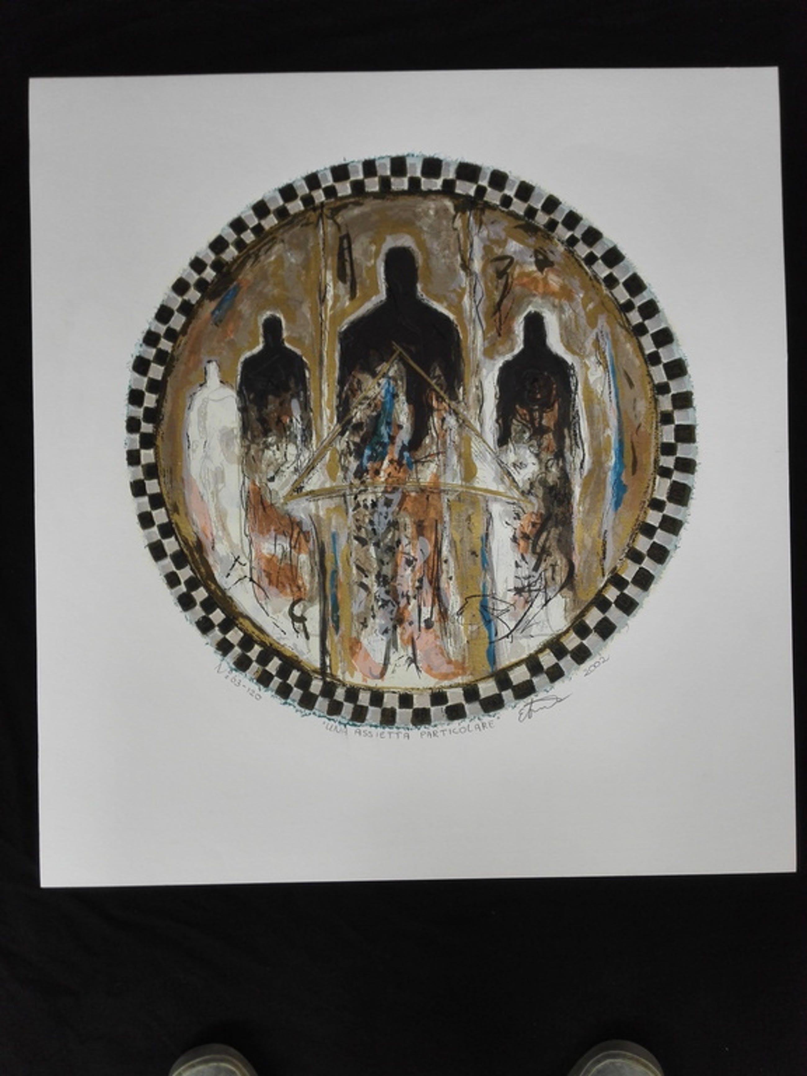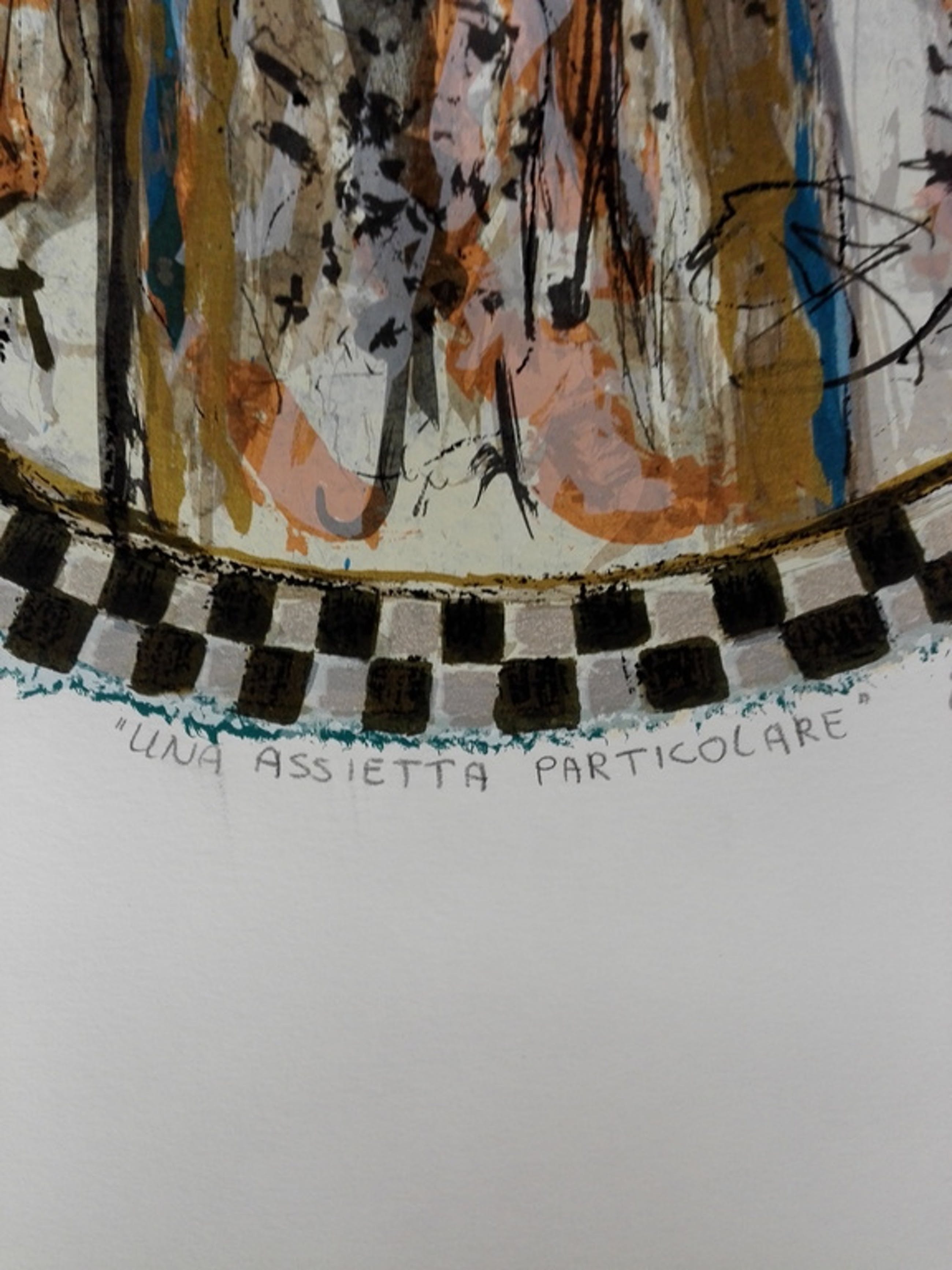Kunstenaar: Eric Toebosch Titel: una assietta particolare Oplage: 63/120 Gesigneerd: Ja Techniek: zeefdruk op papier Maten: 75,5cm x 70,5cm