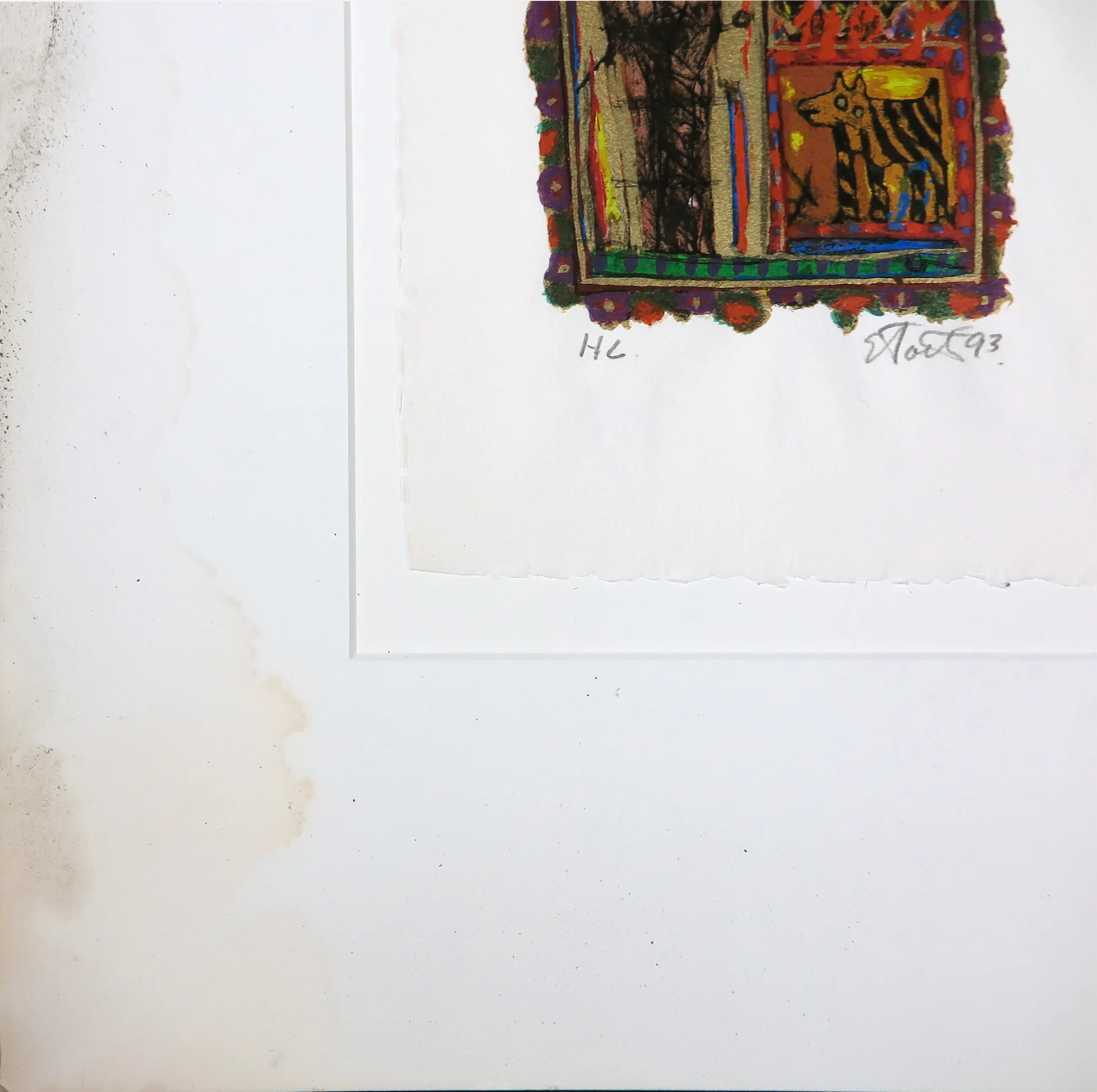 | Hoewel het werk zelf in goede staat is, is het passe-partout beschadigd. Op de voorkant zit vochtschade (zie foto's). Ook zit er vuil en wat lijkt geknoeide grafiek te zijn op het passe-partout. | |||||||||||