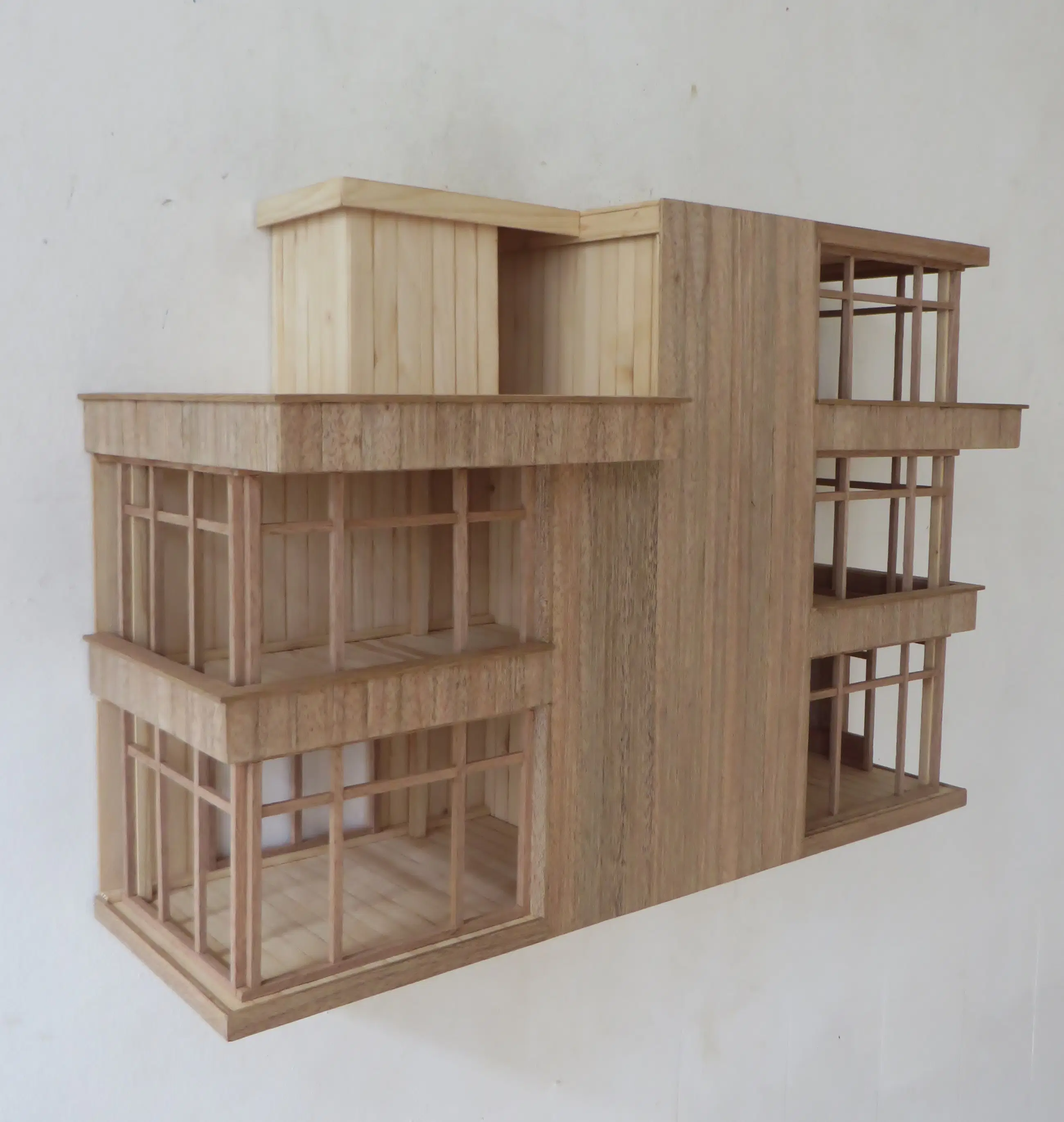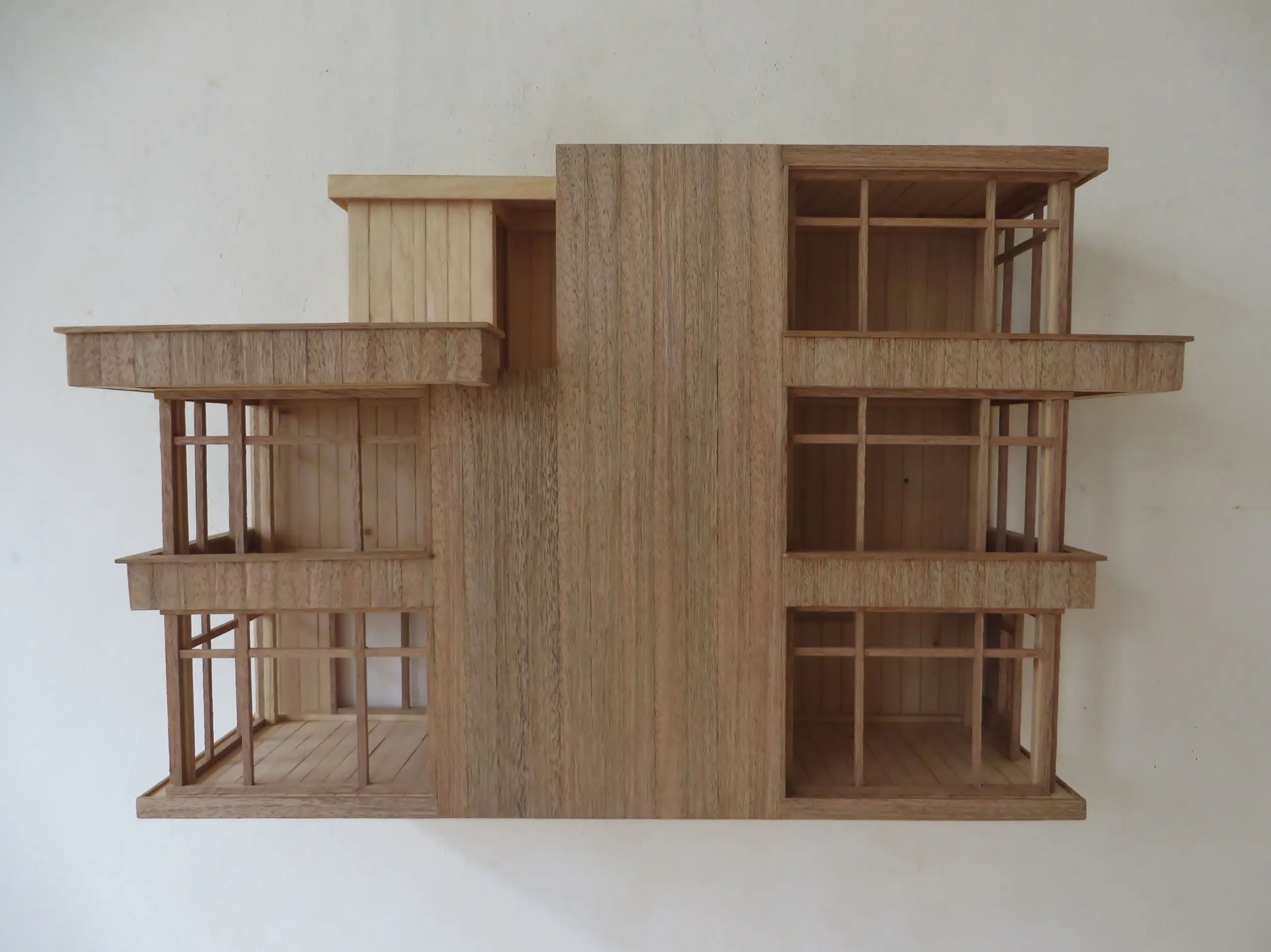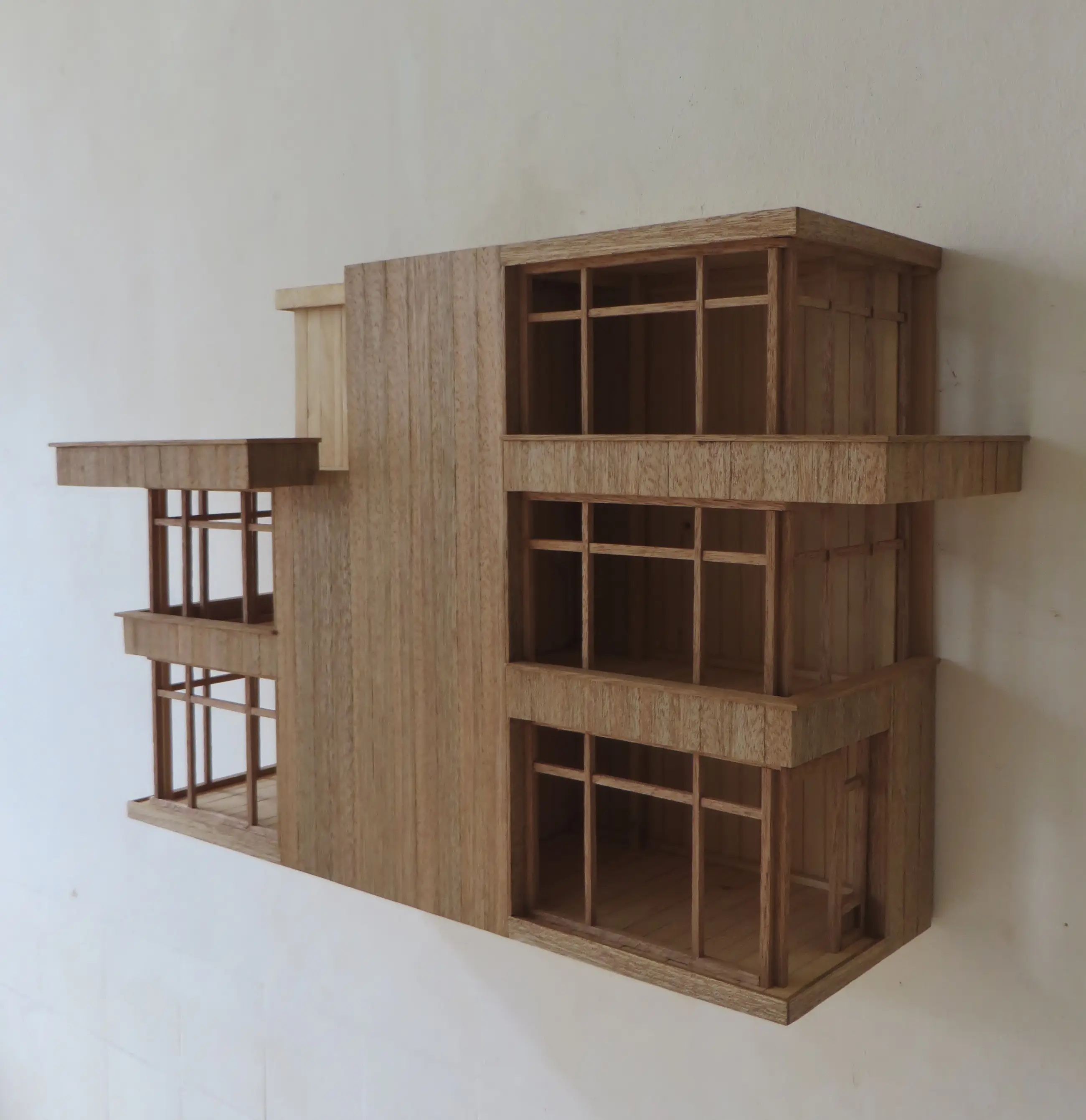 Prachtig architectonisch wandobject van meranti - en vurenhout.
