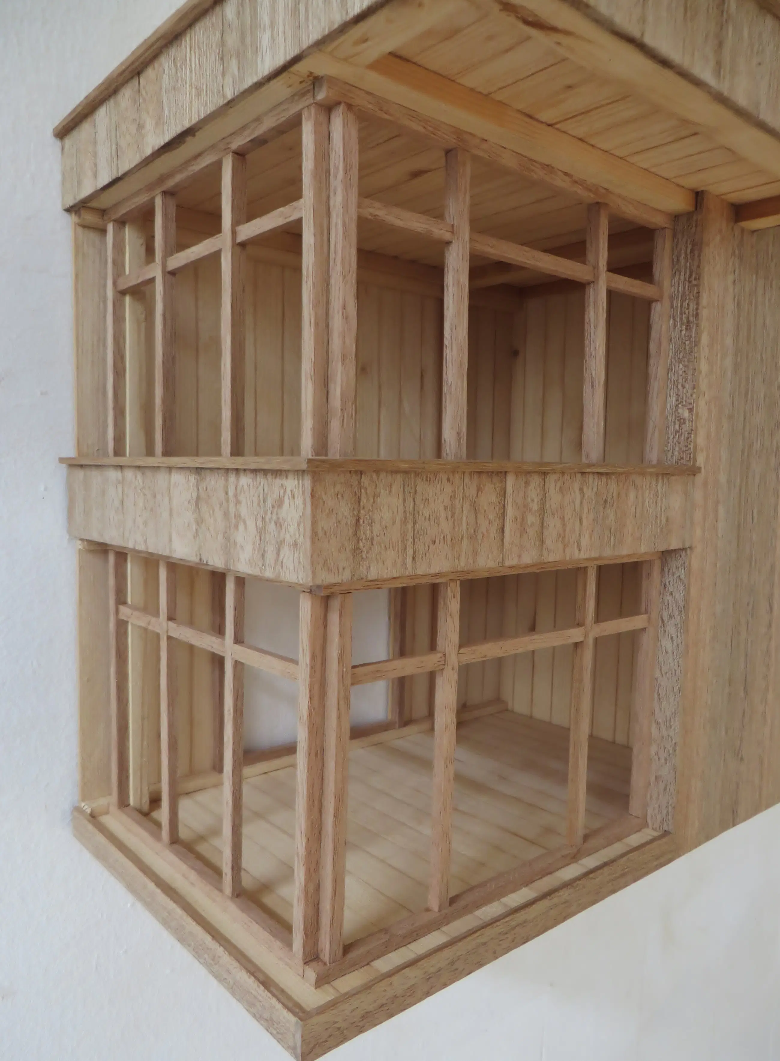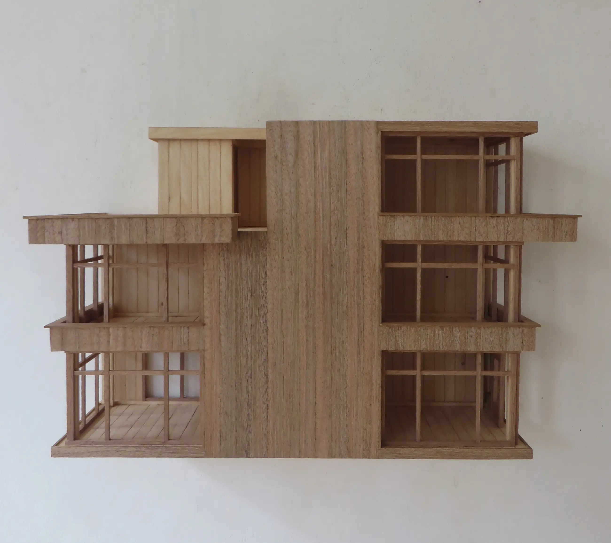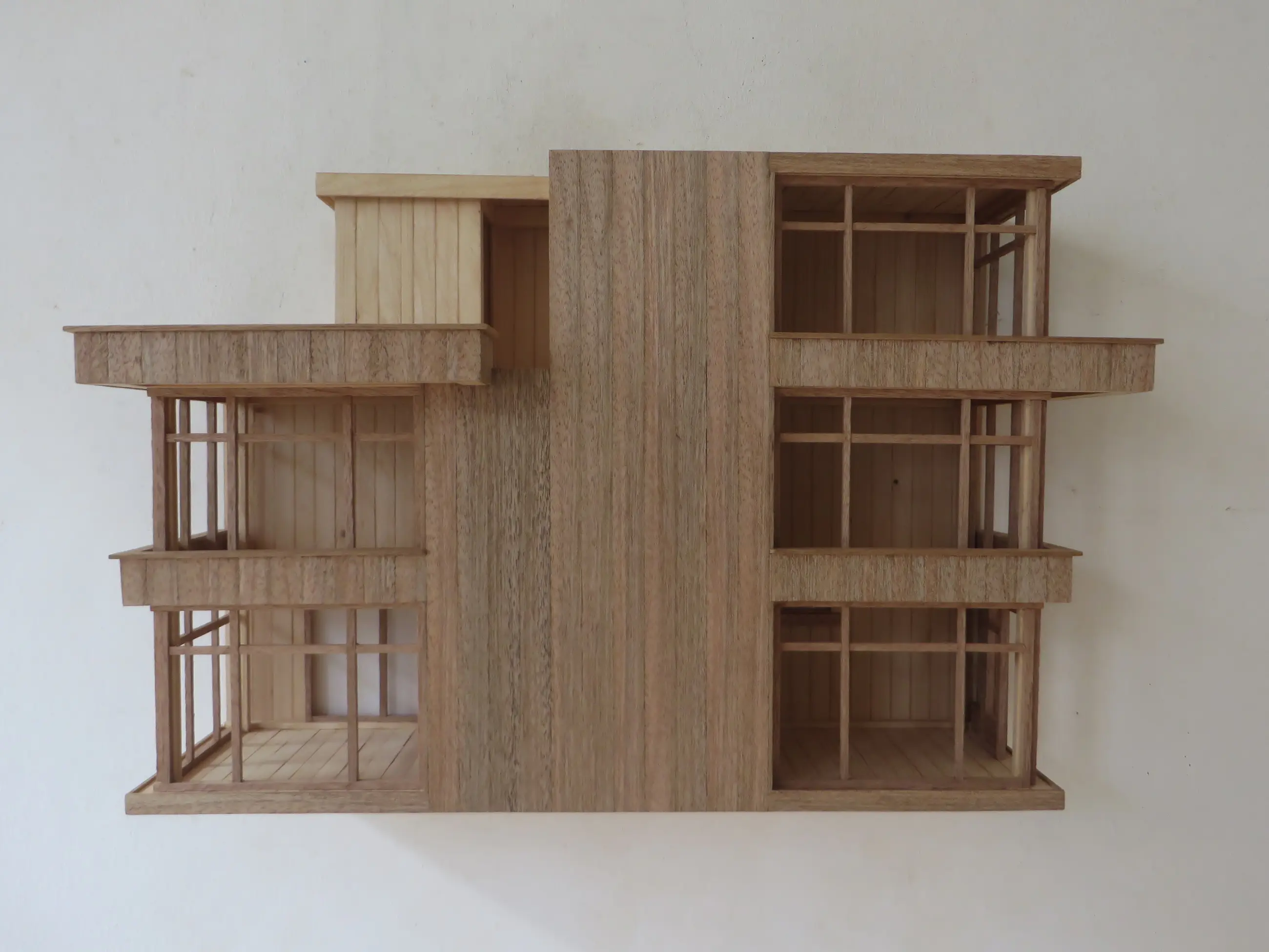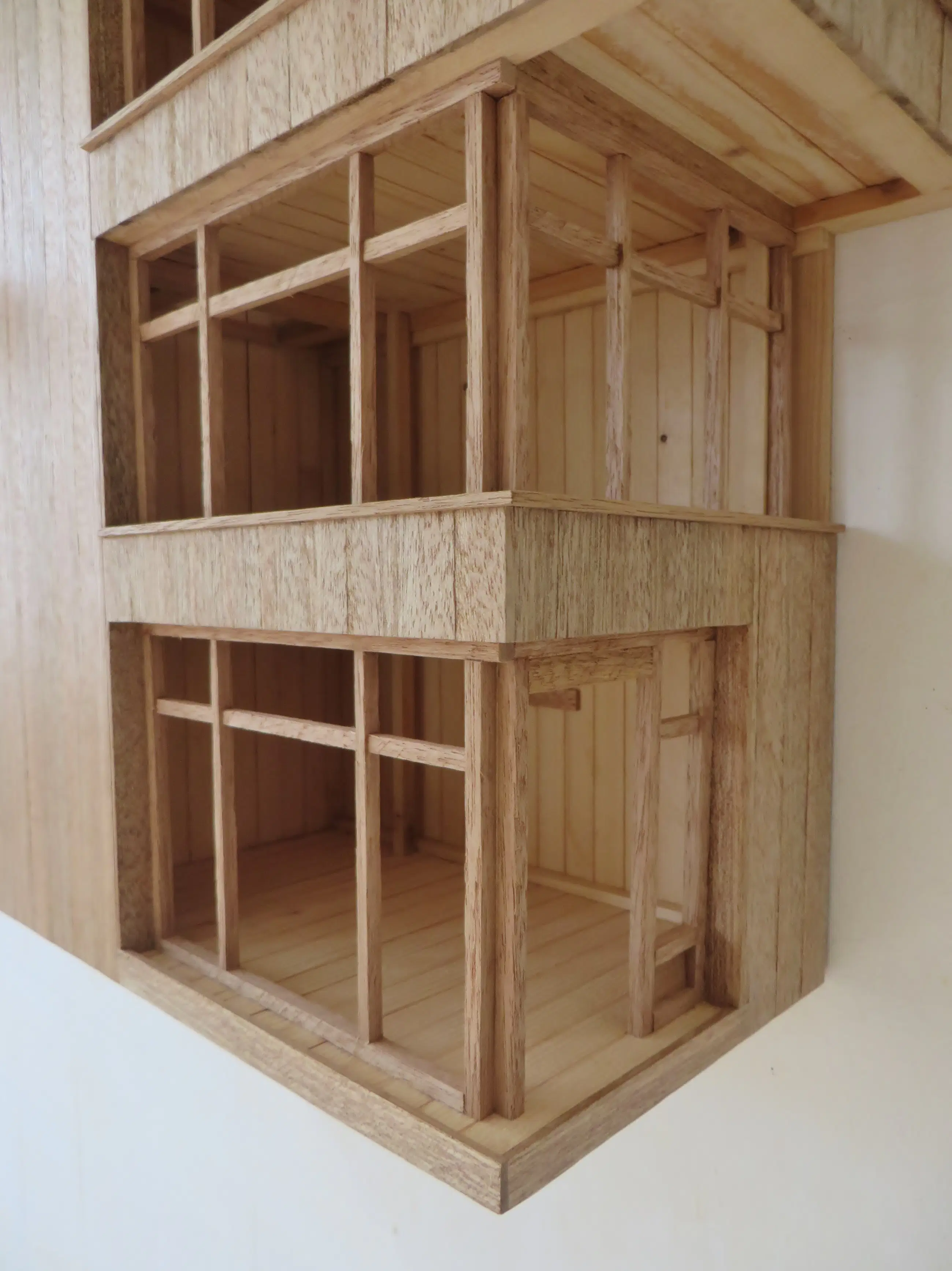Prachtig architectonisch wandobject van meranti - en vurenhout.