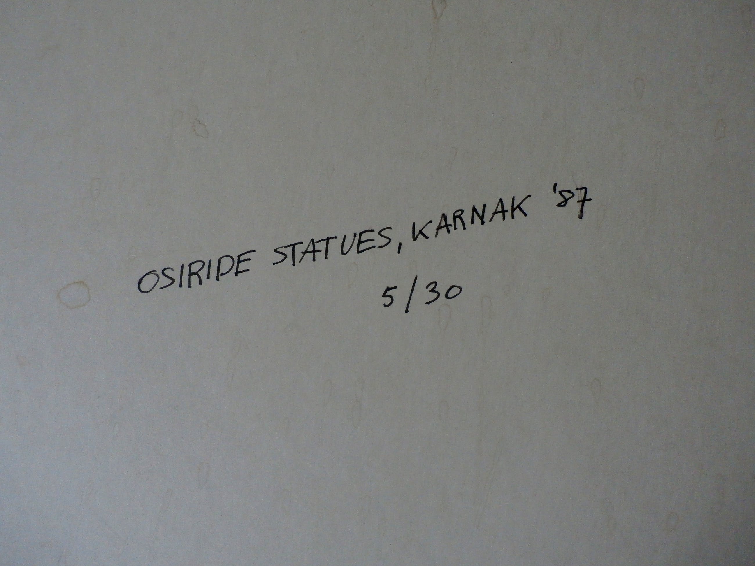 Ingelijste foto van Eric van Straaten uit 1987. Titel: Osiride statues, Karnak. Nummer: 5/30. Afmetingen incl. lijst: H61 x b50,5 cm. Afmetingen voorstelling: H27 x b27 cm. Het werk is op de achterzijde genummerd . Daar is ook de titel vermeld en een sticker van de kunstenaar geplakt.. De authenticiteit van het, aangeboden, werk wordt voor 100% gegarandeerd. Een certificaat van echtheid kan, op aanvraag, worden meegestuurd.