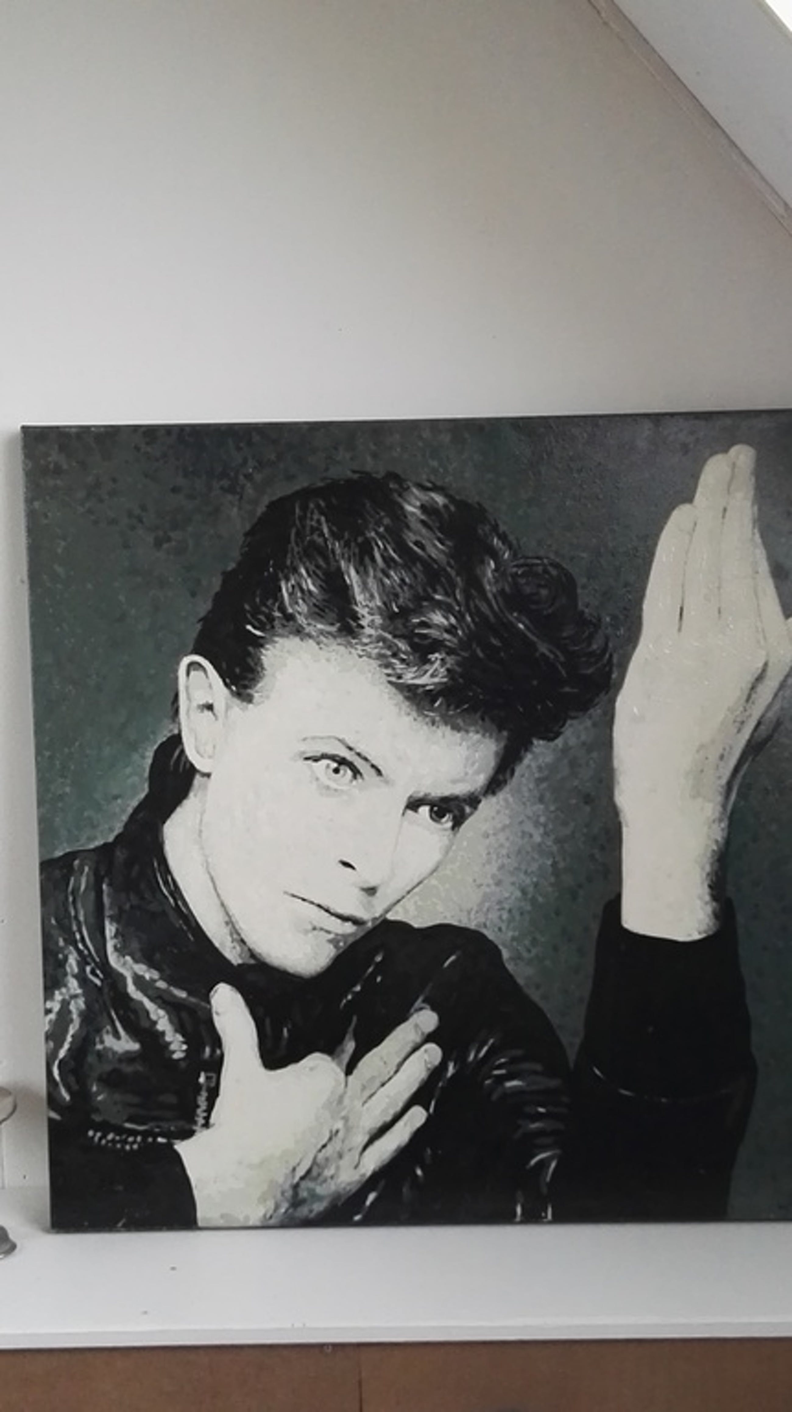 Dit schilderij van Eric Winder is geschilderd met als voorbeeld de platenhoes.