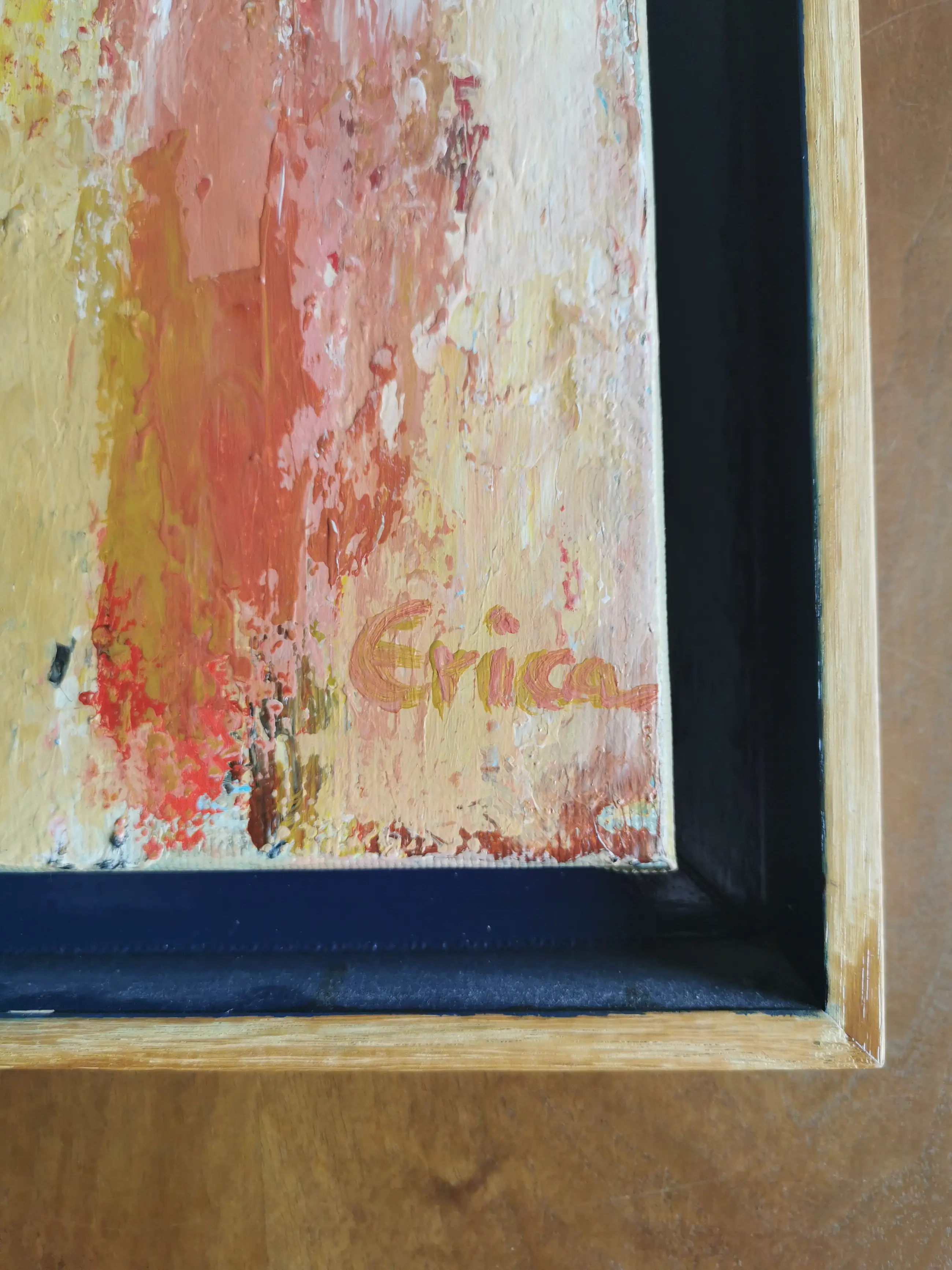 Abstract schilderij met aardse tinten. Diepe omlijsting in blauw.