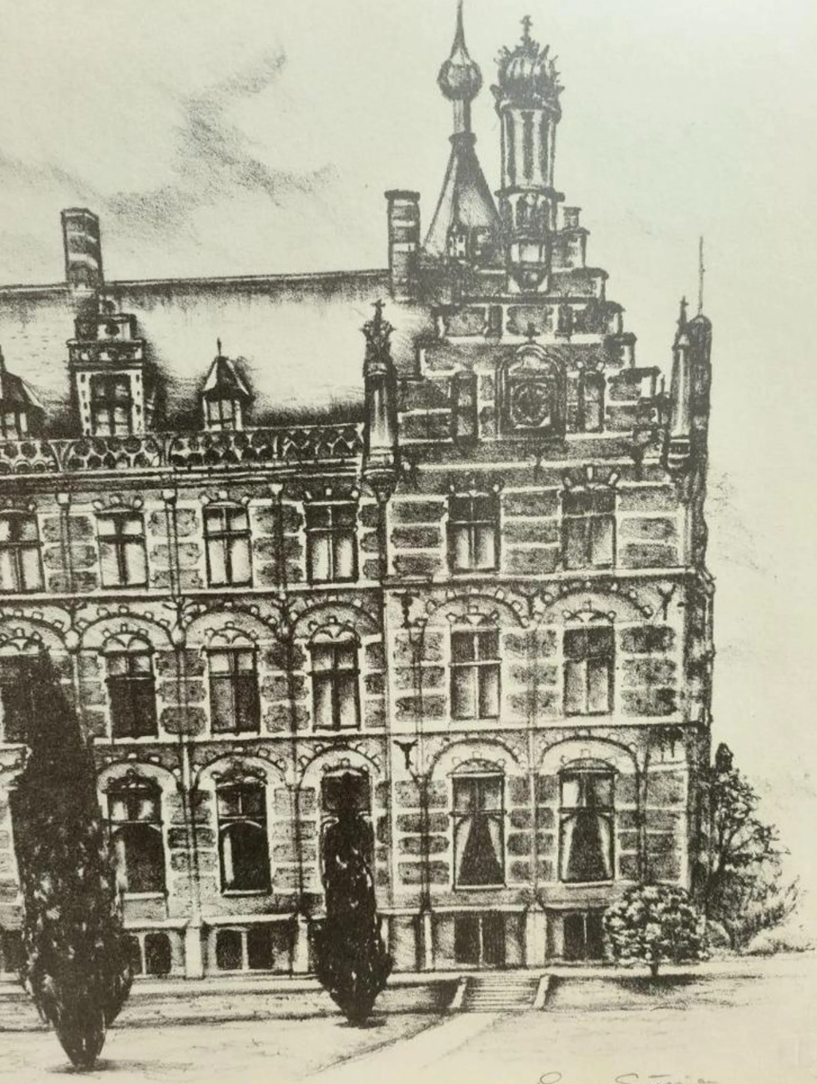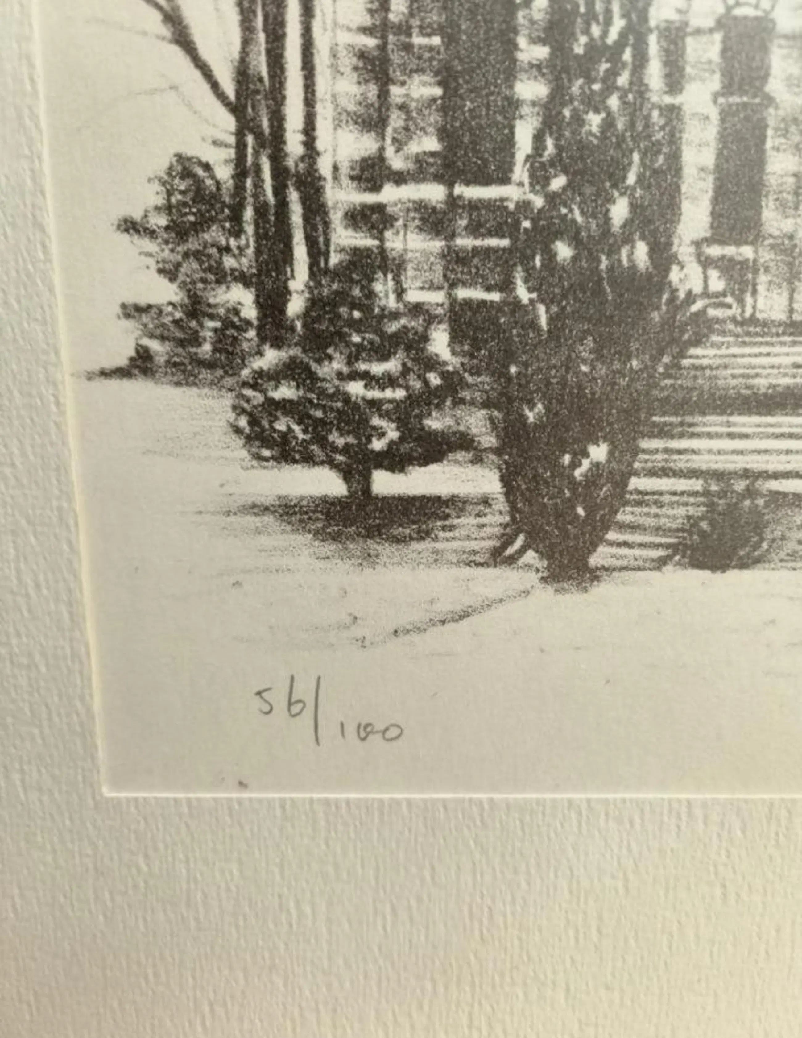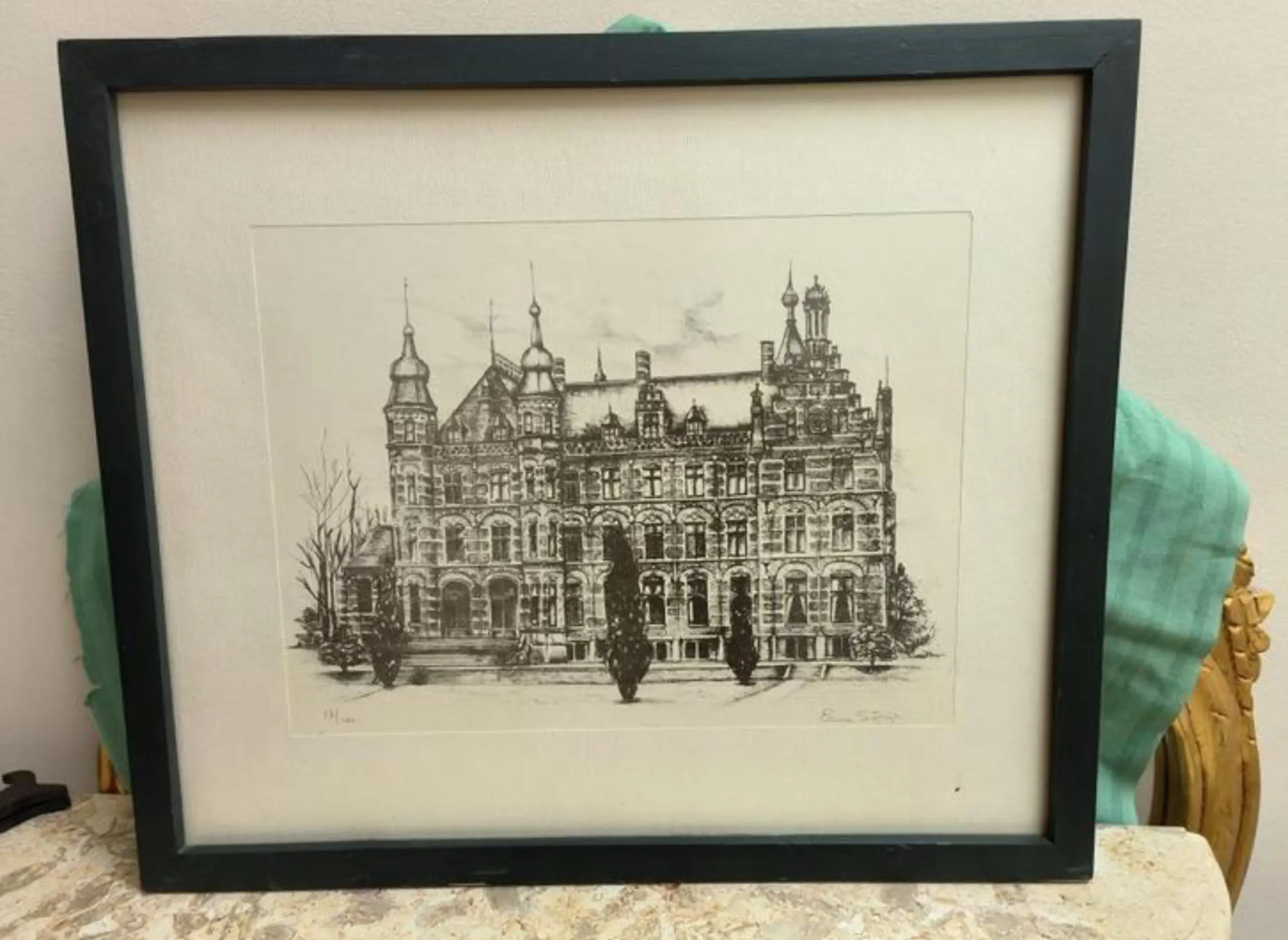 Een zeer mooie pentekening van de Nederlandse Kunstschilderes Erica Sijnja. Het is een pentekening achter glas van een gebouw, genummerd met 56/100.
