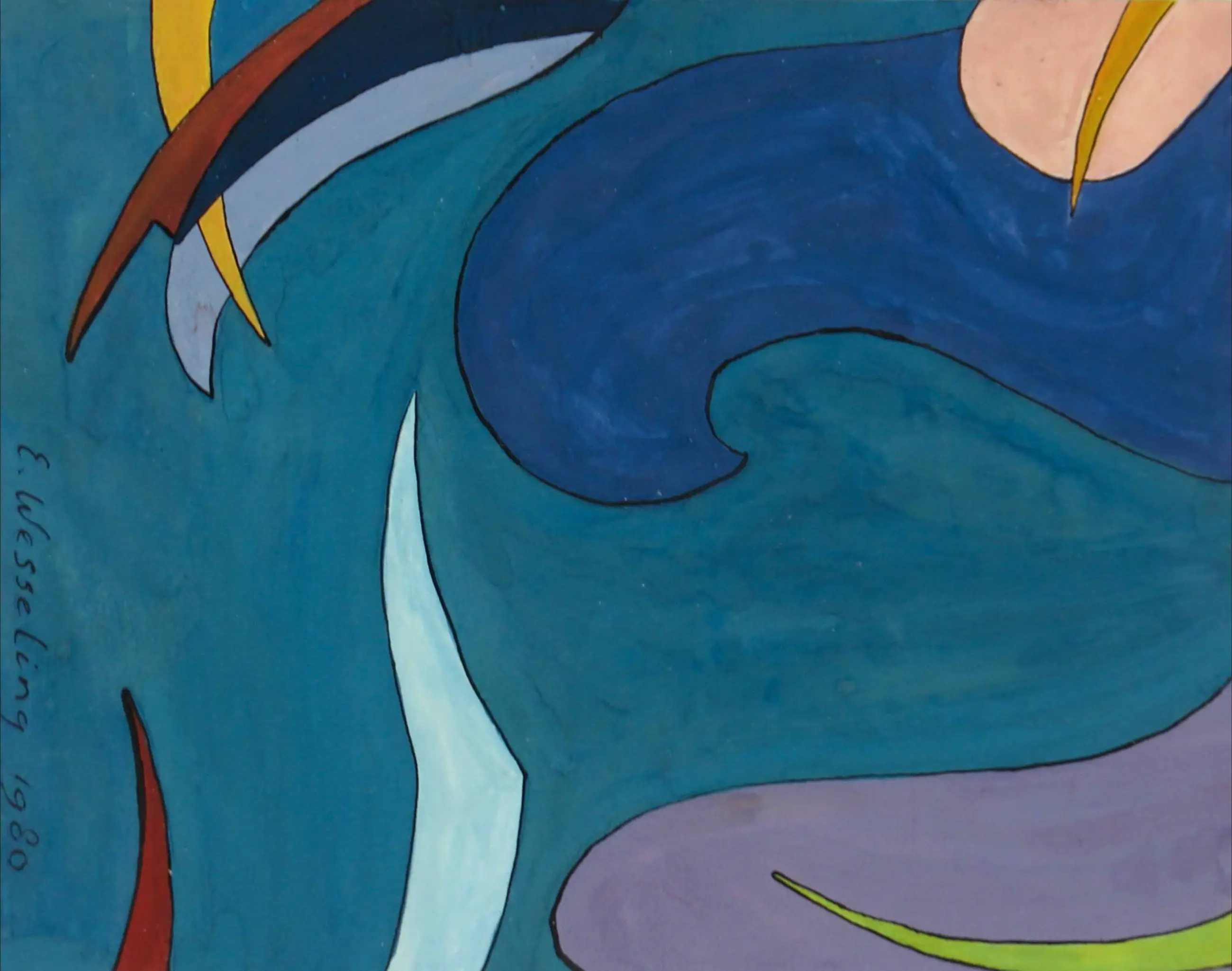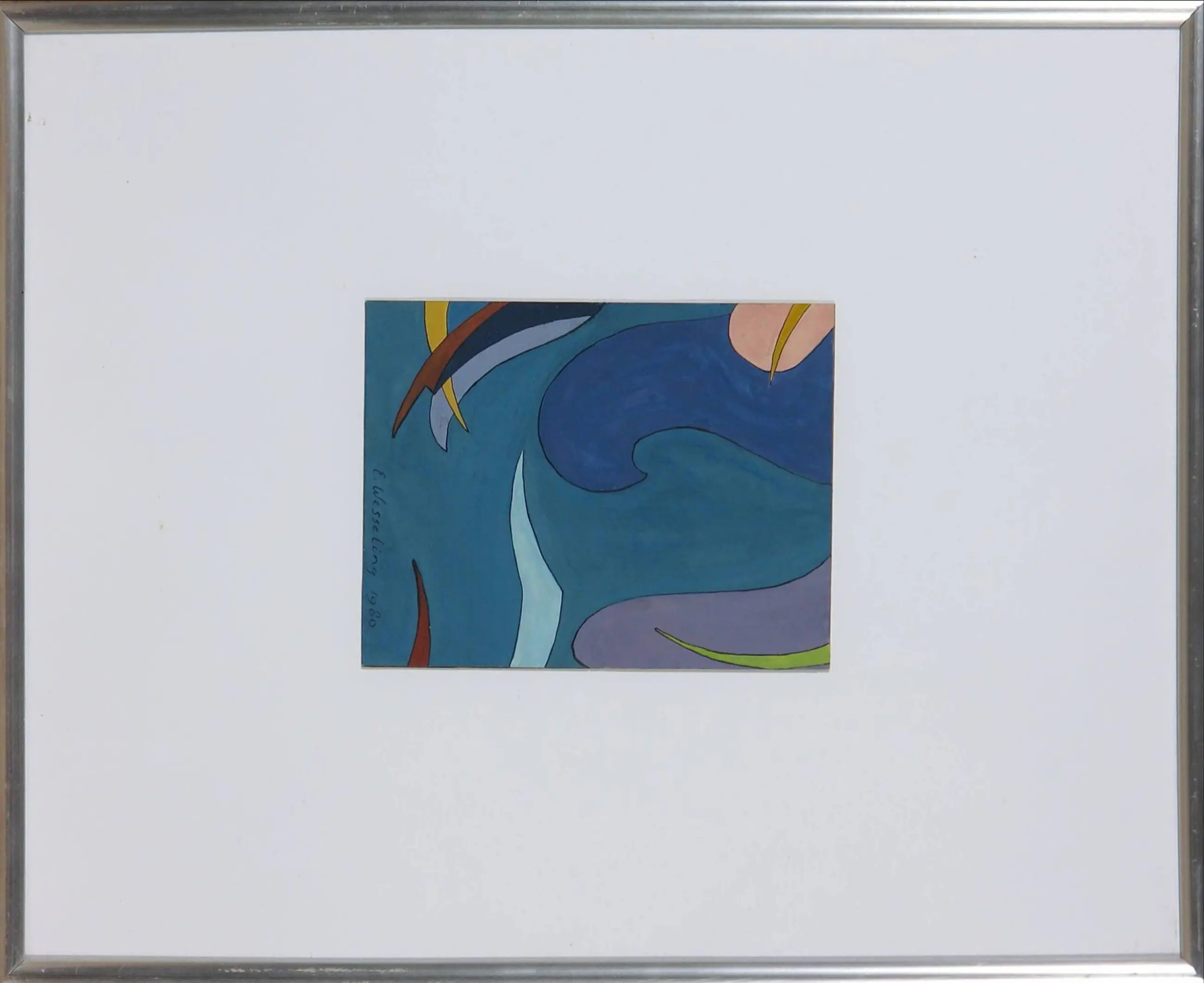 Ingelijste gouache van Erica Wesseling getiteld 'A Faber Birren Colour Study: Templates, A Composition in Blue!'.