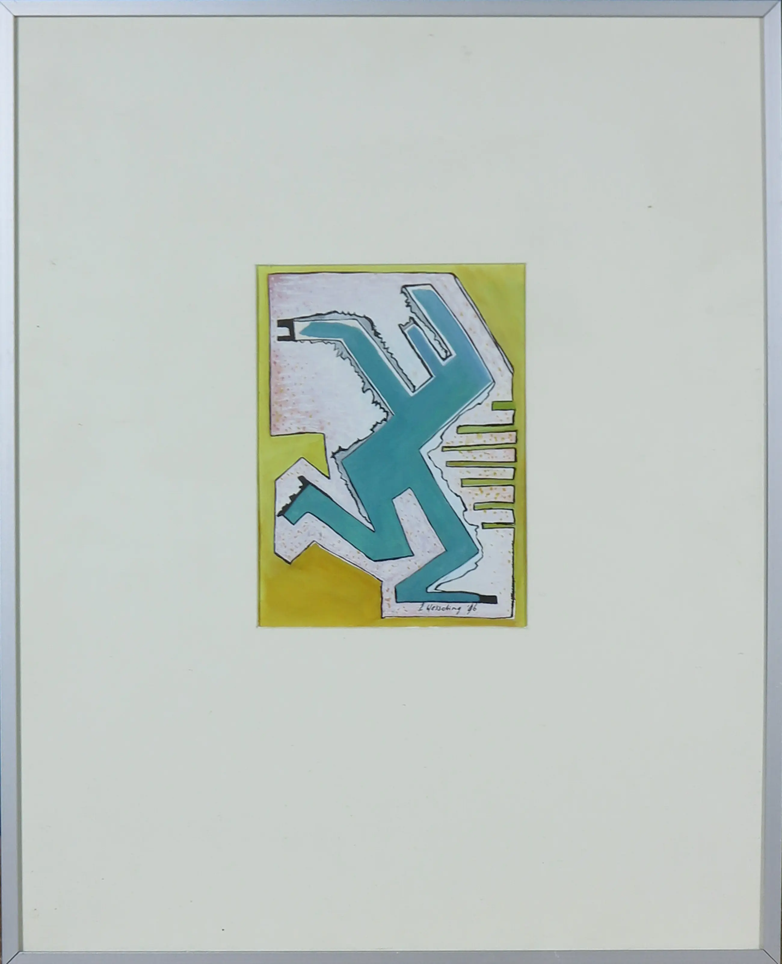 Ingelijste gouache van Erica Wesseling getiteld 'The City Boys: Run Man, Run!'.