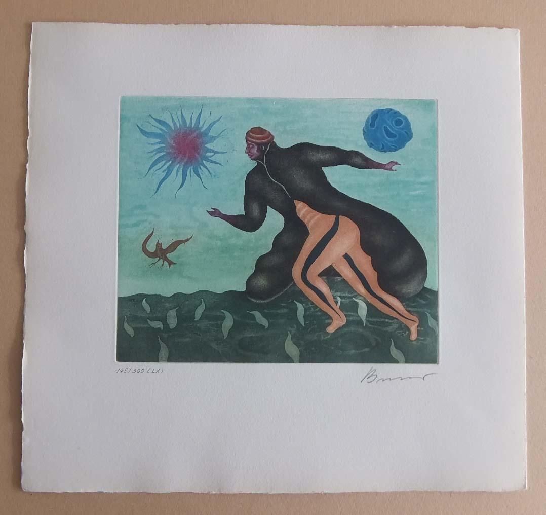 Arik BRAUER, Radierung, "Der Eilige", HANDSIGNIERT, nummeriert. Lt. Brauer Werkverzeichnis wurden 300 Stk. hergestellt. In der Zeit von 1968-1970, Werkverzeichnis Nr. G37/XII. Im Blatt mit Brauer WASSERZEICHEN unten mittig. Blattgröße ca. 40 x 36,5 cm, Darstellung ca. 25,5 x 21,5 cm.