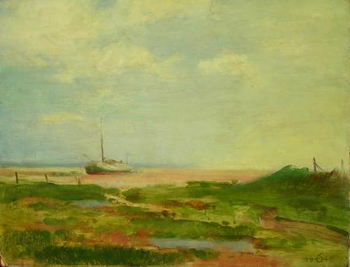 Vorland, Ölgemälde auf Hartfaser von 1948; Größe 50 x 65 cm; rechts unten monogrammiert und datiert; rückseitig signiert, datiert und betitelt; das Bild ist ungerahmt, guter Zustand, Versandkosten als versichertes Postpaket innerhalb von Deutschland 7,- Euro.