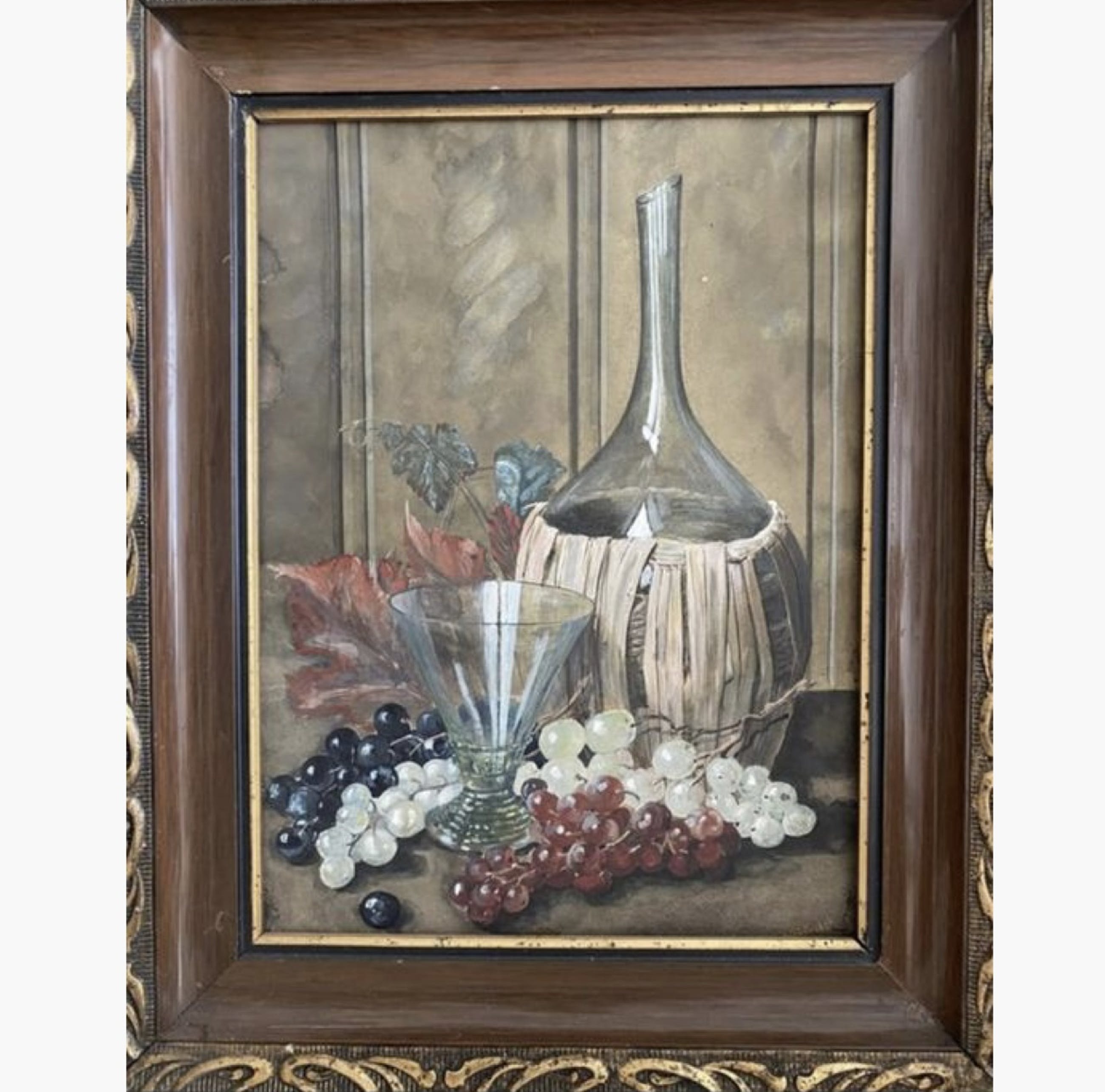 Origineel krijtpastel kunstwerk van Erich Probst. Dit geweldige schilderij van Erich Probst uit het jaar 1906 is ingelijst in een Art Nouveau schitterende lijst zonder glas en gesigneerd door de kunstenaar rechtsonder. Het stillevenkunstwerk is geschilderd op karton en toont een wijnkaraf, een wijnglas en druiven.