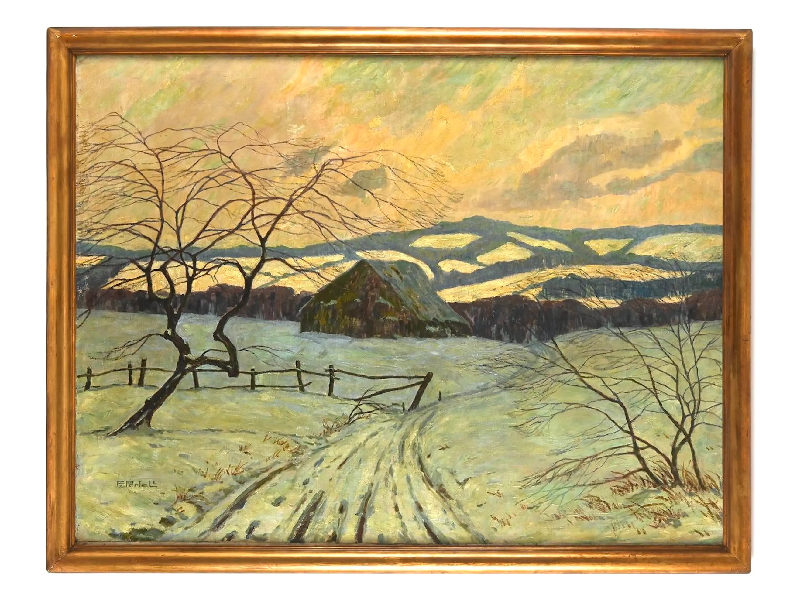 Schilderij getiteld "Winterlandschap" van de Duitse kunstenaar Erich von Perfall. Het kunstwerk toont een besneeuwd heuvellandschap met een rustieke boerderij of schuur in het midden. Het schilderij is uitgevoerd in een impressionistische stijl, met aandacht voor het lichtspel op de sneeuw. Het werk is gesigneerd door de kunstenaar linksonder in het beeld. Het schilderij wordt gepresenteerd in een massieve lijst.