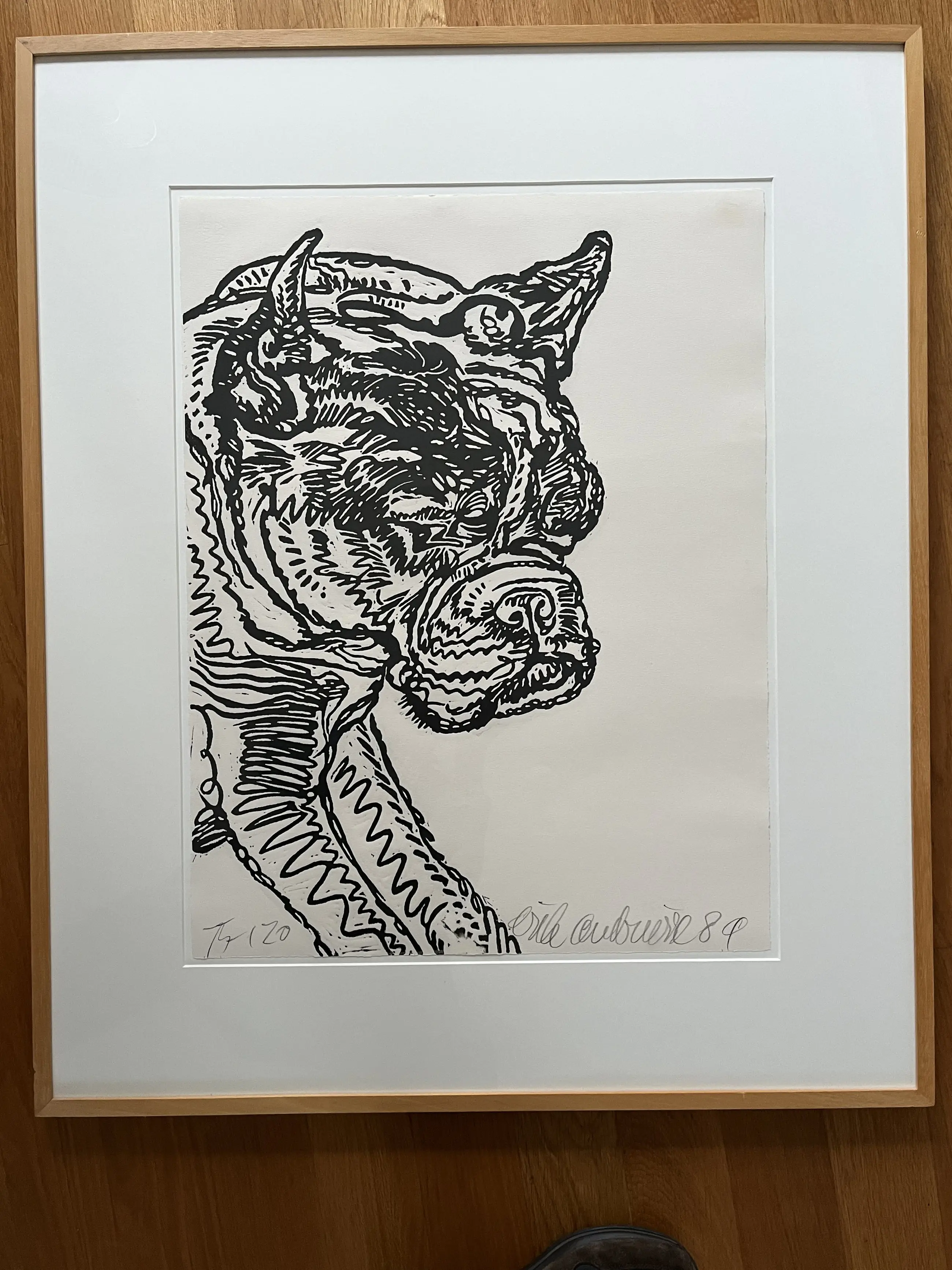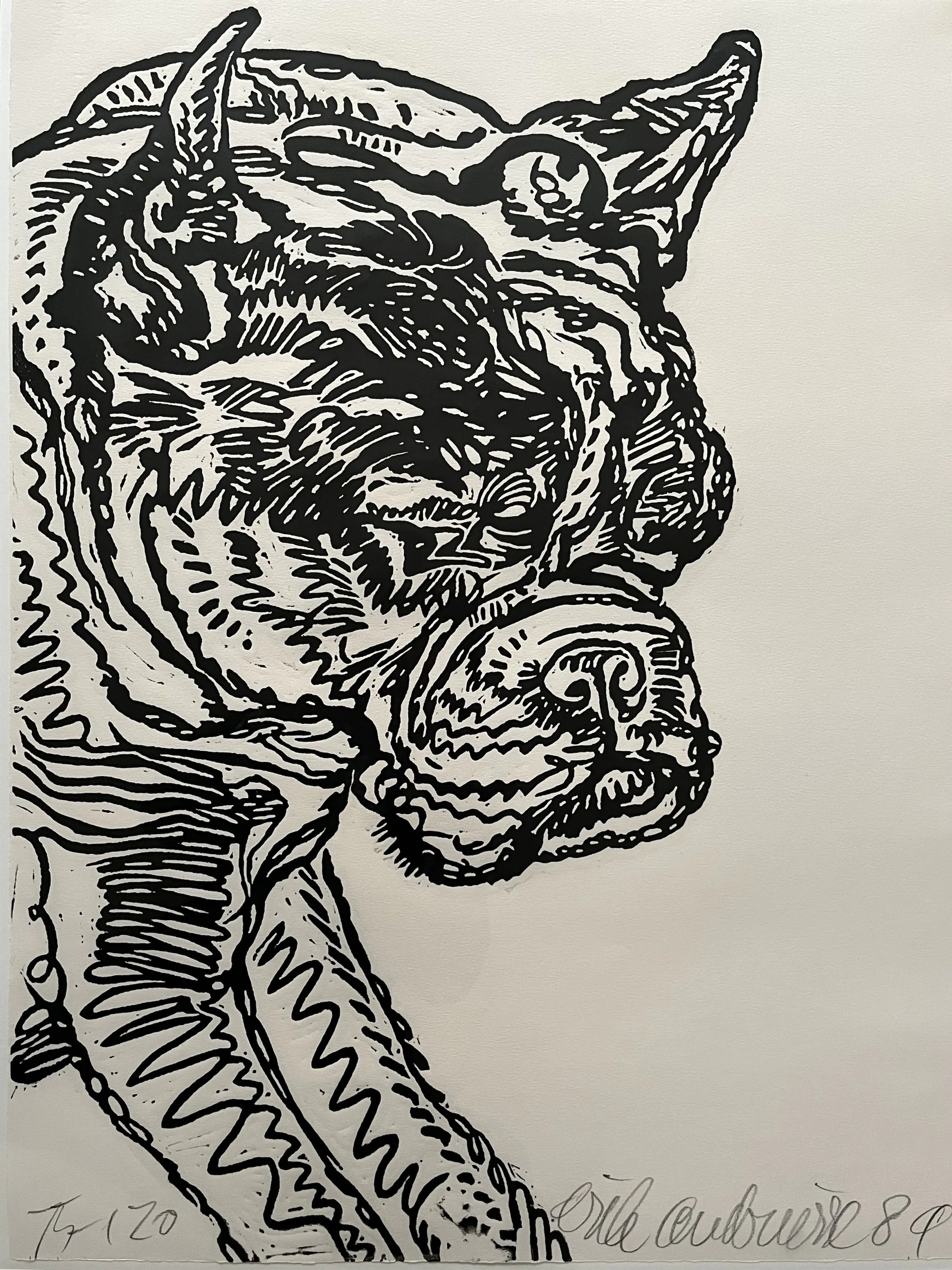Fraaie houtsnede van de hond van de kunstenaar. Had de hond vernoemd naar de componist Igor Stravinsky. Oplage 75/120 Afgebeeld in het grafiekoverzicht 'Erik Andriesse - Fast Forward' (Nijmegen, 2007) , pagina 89 en 103.