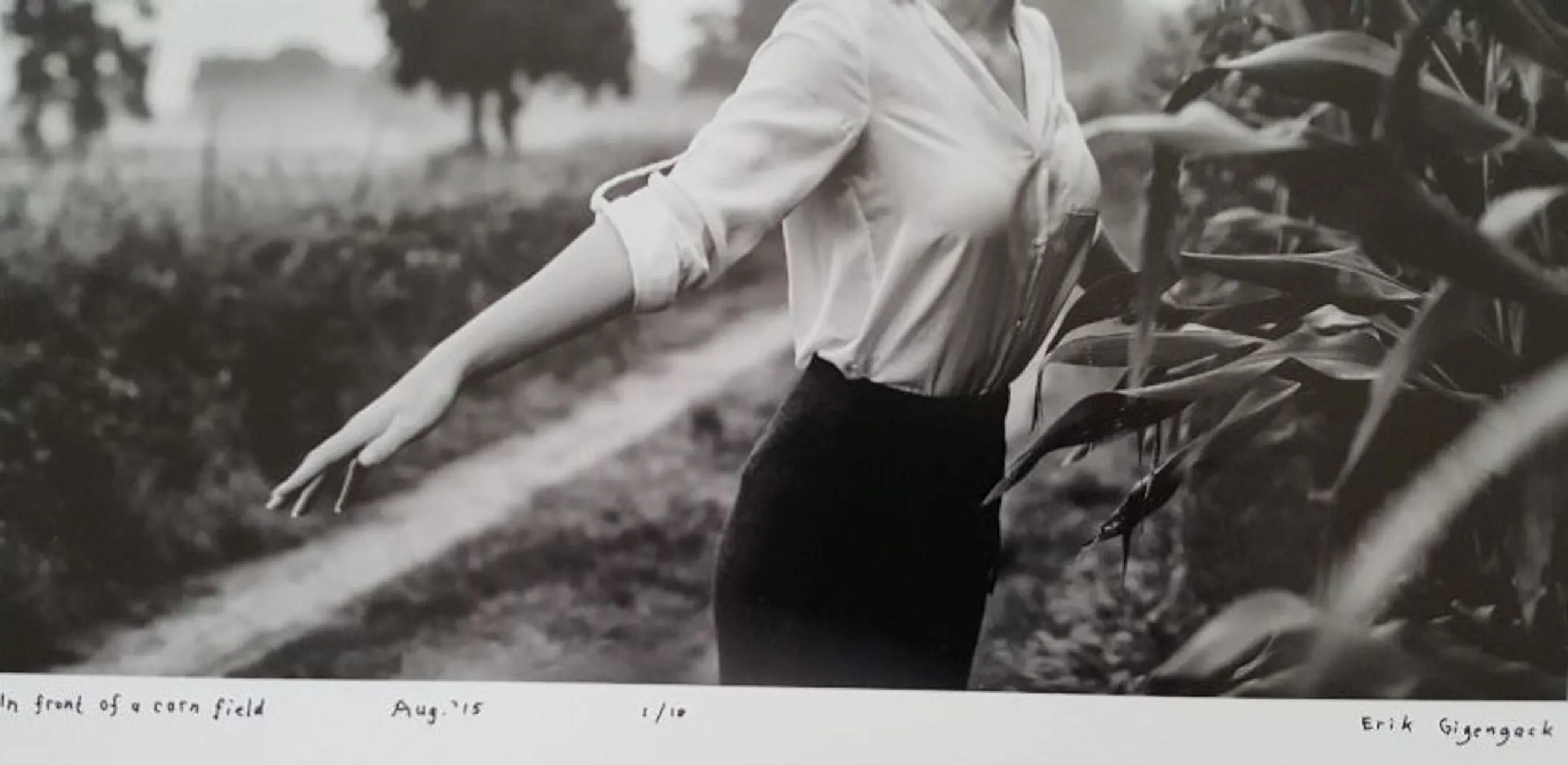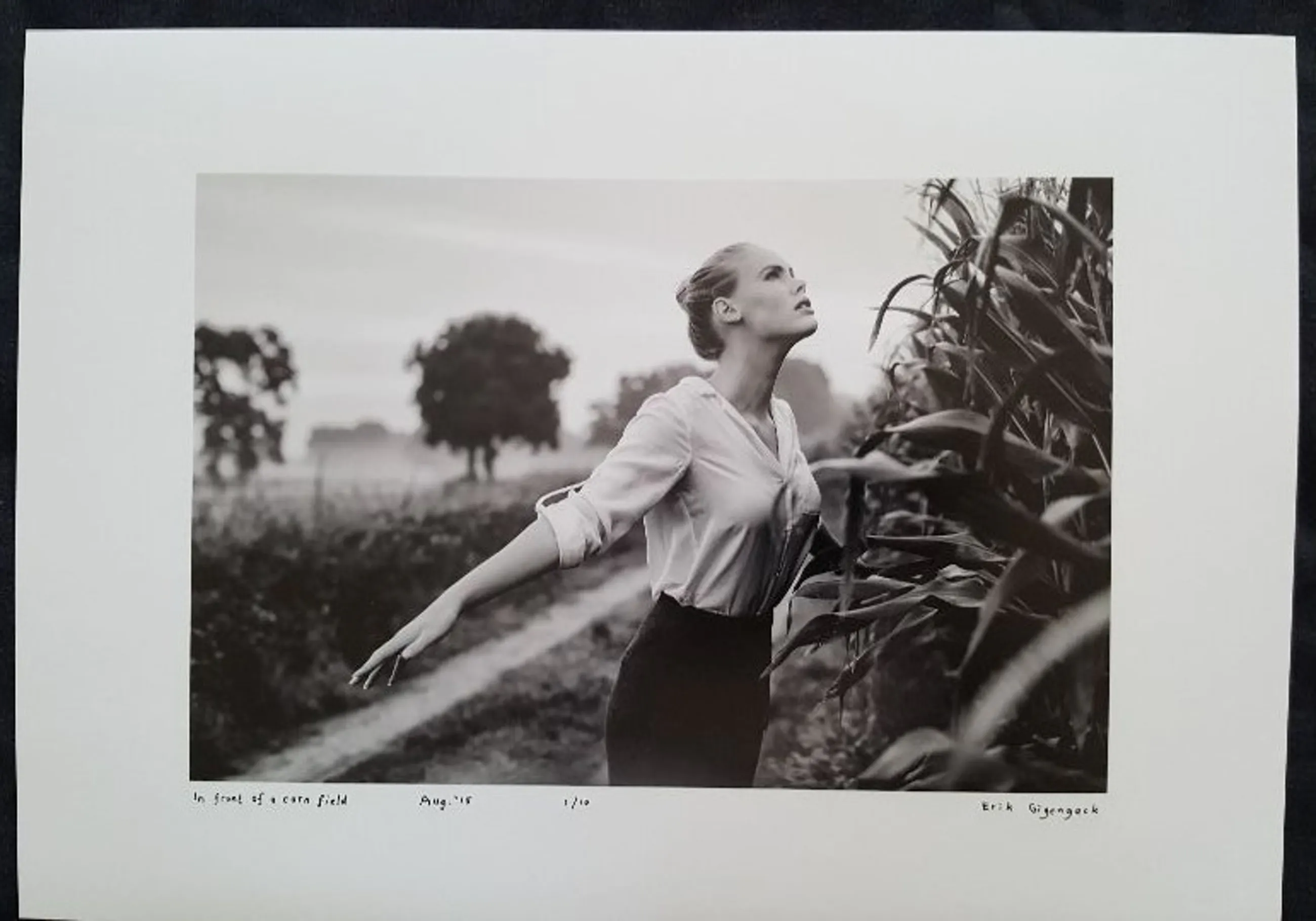 De foto met de titel 'in front of a cornfield' is afgedrukt met uv-licht bestendige inkt op papier van galeriekwaliteit (Epson Premium Semigloss Photo 255 gram). De foto heeft de afmetingen 42 cm. x 30 cm. (b x h). De beeldmaat is 30 cm. x 20 cm. (b x h). De foto met beperkte oplage komt uit 2015 en rechtstreeks van de fotograaf. De foto is handgesigneerd en -genummerd, het is nummer 1 uit een serie met een gelimiteerde oplage.