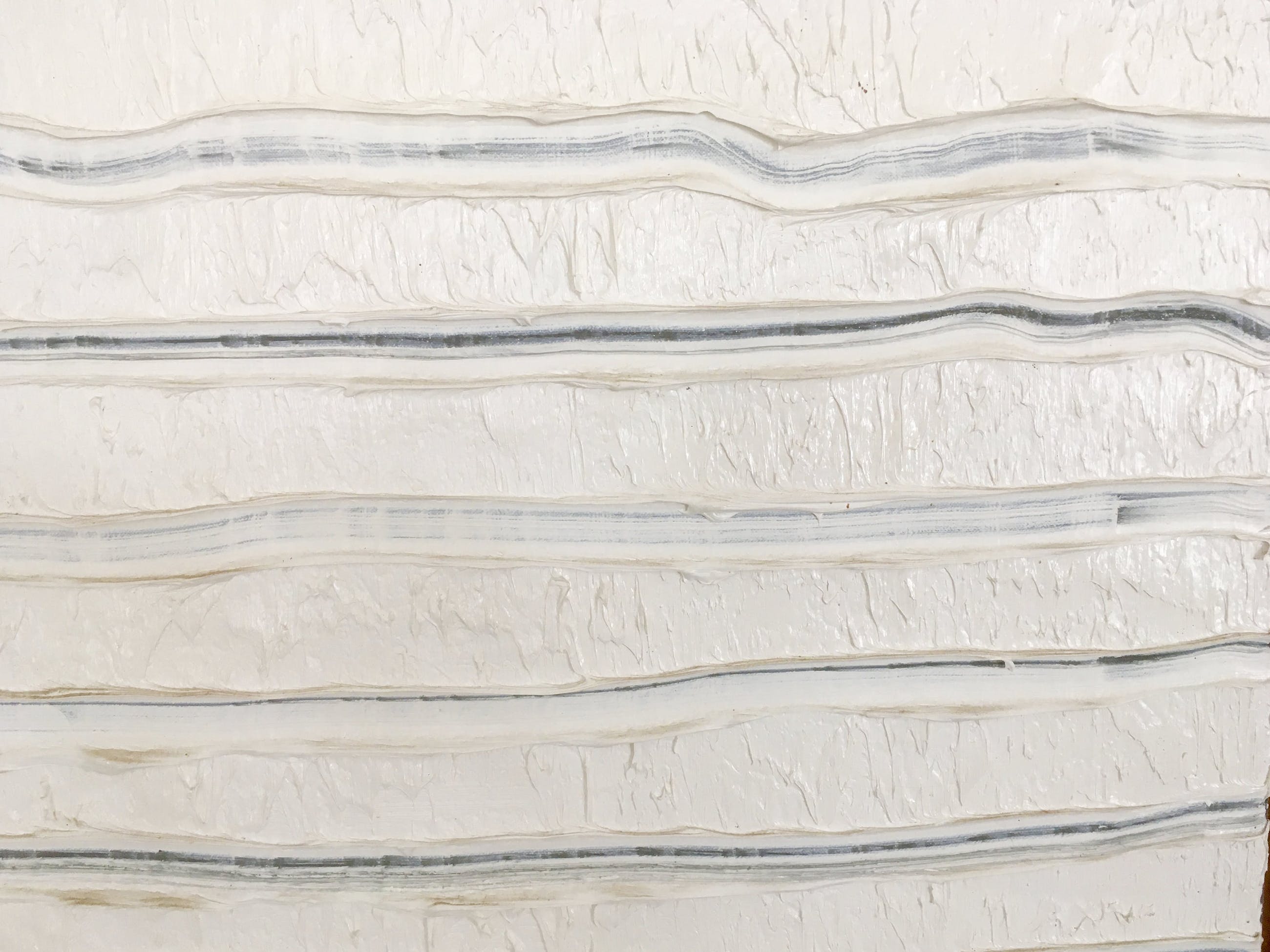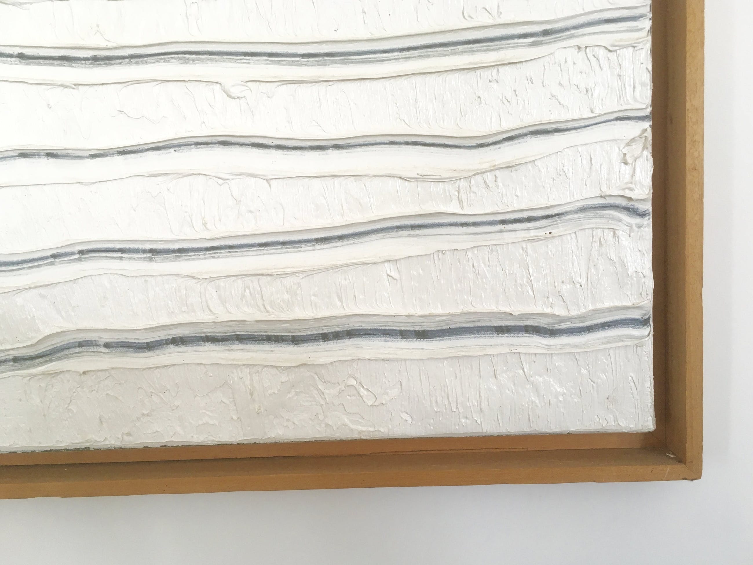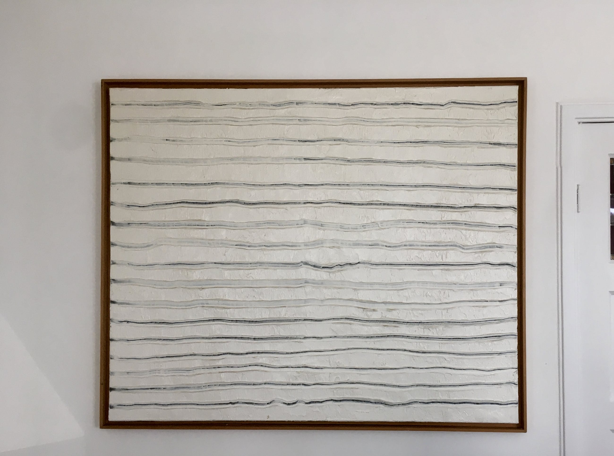 “Erik OIdenhof, (Nijmegen 1951) is a painter who applies the power of constraint in his way of painting. Simplicity is the signature of the truth. He focuses on attaining the maximum artistic capacity with a minimal use of imagery. Iconic for his work is the pasteus painted linework that veils the canvas. The result is architecturally and spacious. His paintings are about the process of painting and repainting, adding and subtracting, surfaces and depth, lights and shadows, creating narrative and derailing it, creating order and changing it to chaos. Initially most of his paintings look monochrome, but who takes a more indepth look sees the many shades of white hidden in his work. With pasteus paint usages, he moddels his work with paint, which gives it a strong characteristics of an object. Inconsistencies and ragged edges dampen the harshness of the linework. The radical abstract paintings of Erik Oldenhof force you to contemplate. Even though the central idea of spirituality is strong in his work, for Erik Oldenhof the material appearance is also important. It is allowed to be beautiful, it is allowed to be bright of colour. In summary the paintings give ample way to beauty.”