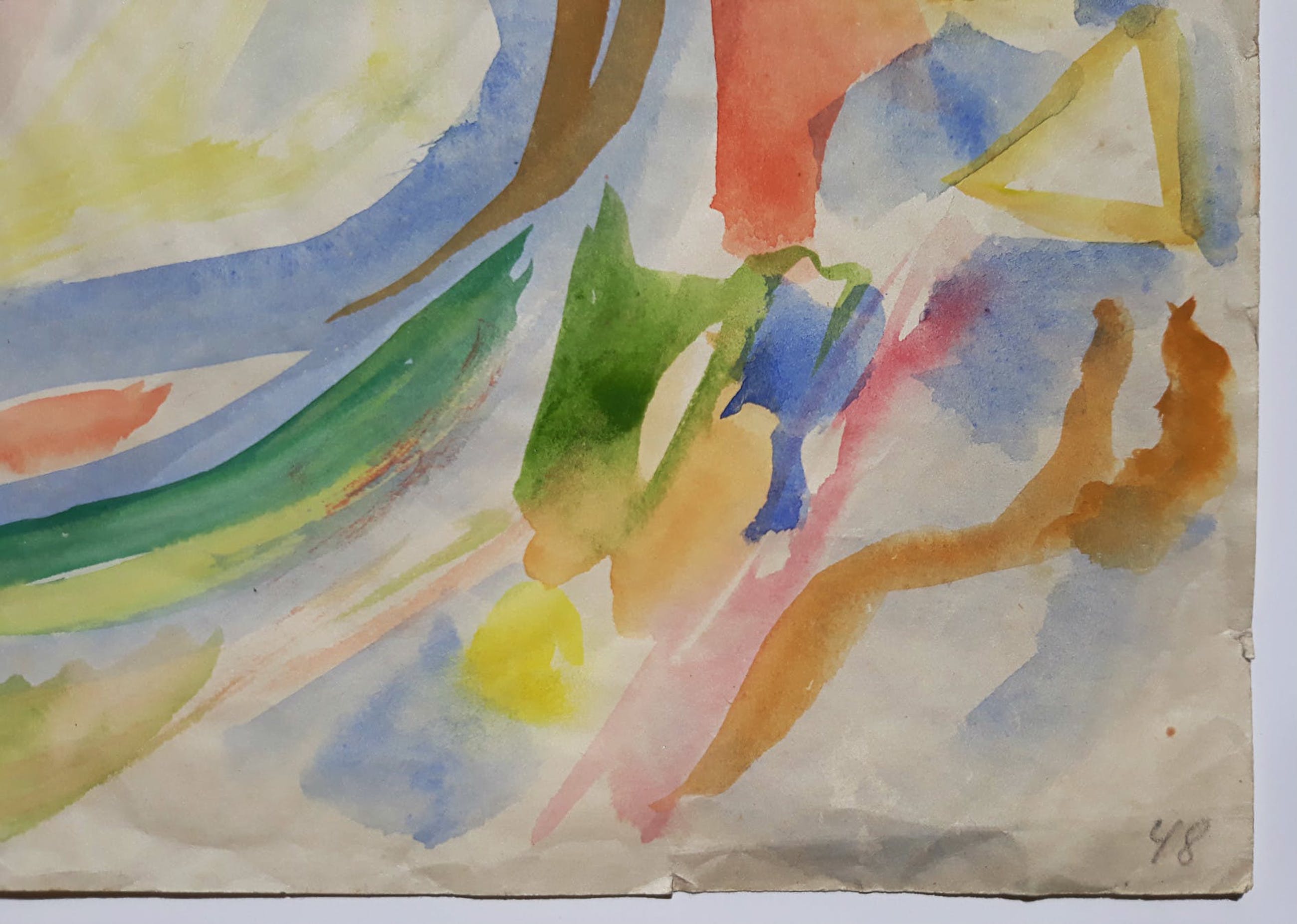 Zeer bijzonder werk van de Deense CoBrA kunstenaar Erik Ortvad. Bijzonder omdat er hier bijna nooit origineel werk van deze kunstenaar wordt aangeboden en bijzonder omdat het ook nog eens precies uit de CoBrA periode is. Aquarel op papier, gesigneerd en gedateerd (1948) linksonder, nog eens 48 rechtsonder, in verso “300 Kr” (hoogstwaarschijnlijk de verkoopprijs in Deense Kronen).
