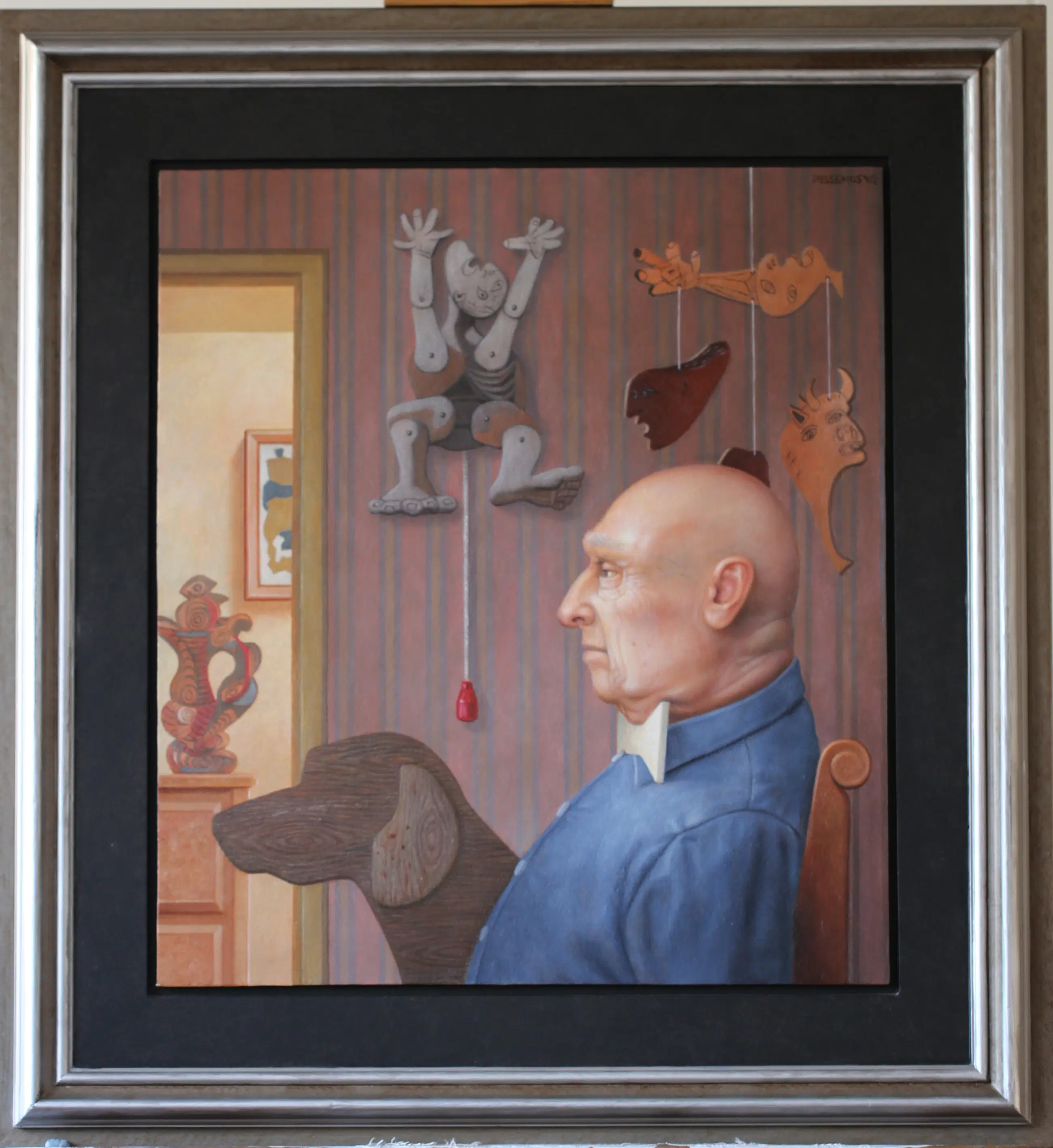 Olieverf/Tempera op papier op paneel. Rijssemus speelt met contrasten: lichtheid en ernst, humor en melancholie, herkenning en vervreemding. Zo ontstaan schilderijen die niet alleen het oog, maar ook de verbeelding prikkelen — kunst die blijft resoneren. De figuurzager nodigt uit om verder te kijken. De houten hond versterkt de peinzende blik waarmee de vlezige figuurzager in de verte tuurt. De trekpop en het mobile verwijzen naar Guernica van Picasso en nopen tot een glimlach. Is de hoofdfiguur een portret van Picasso? De verlichte doorkijk en het sterk geschilderde perspectivische vlinderdasje geven diepte.