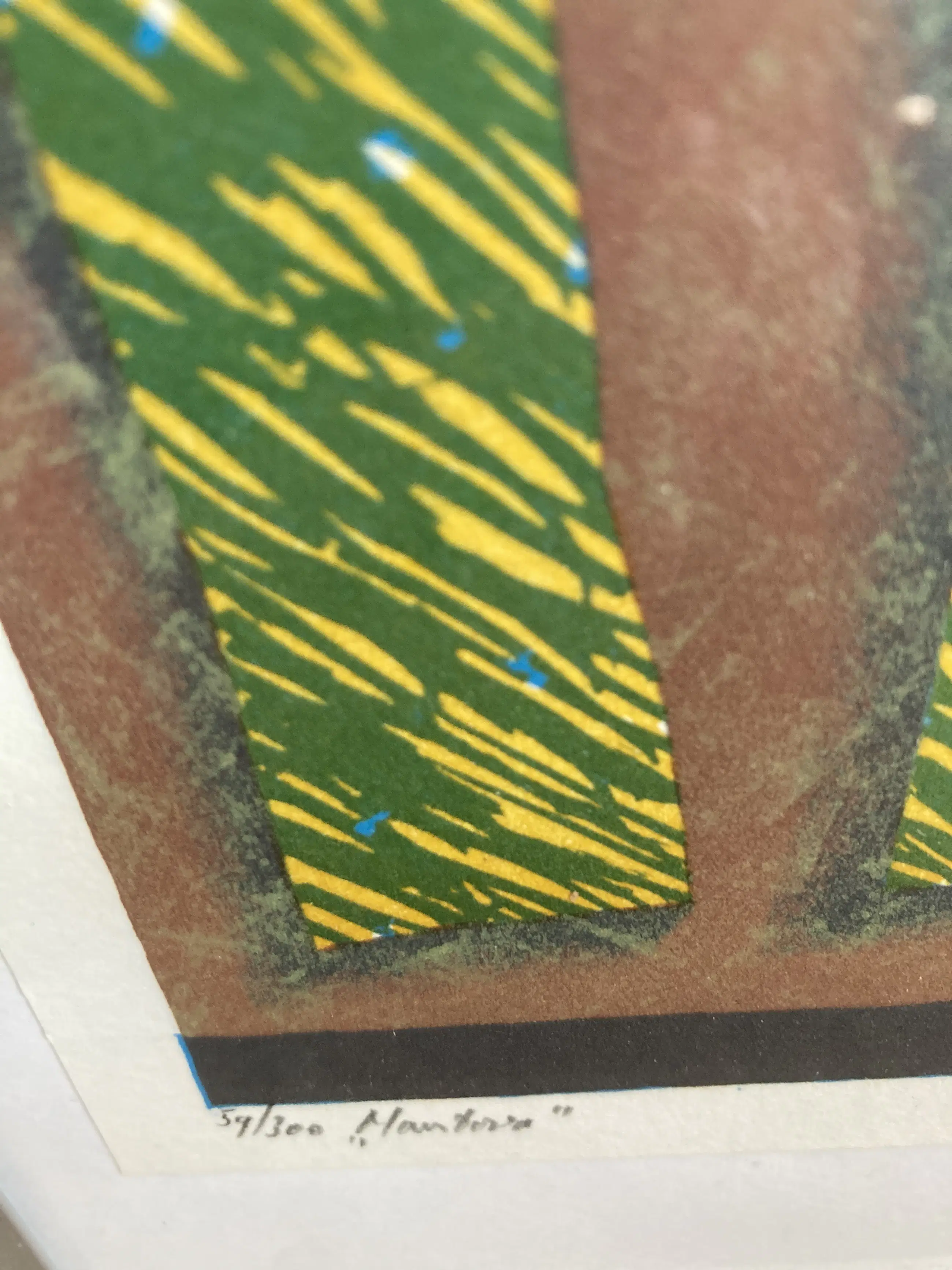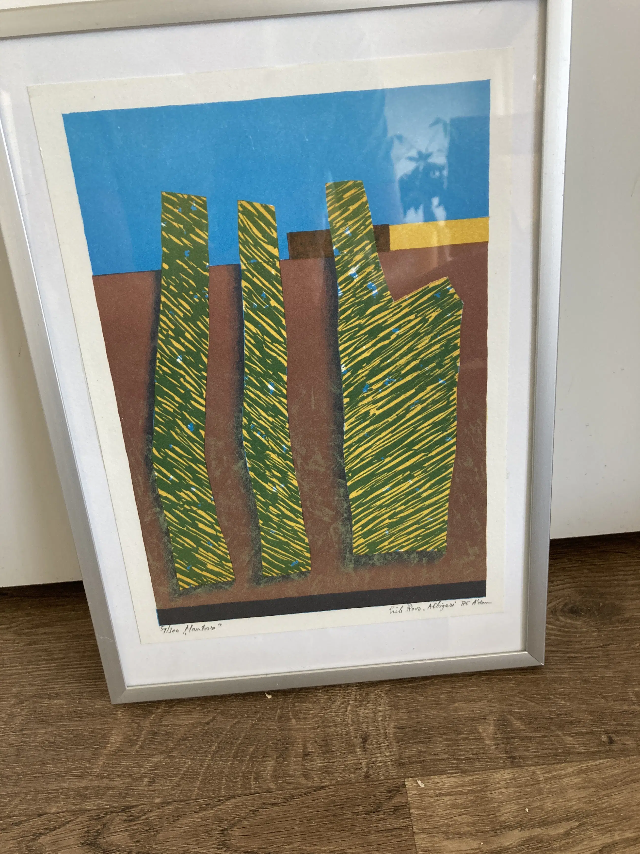 Kleurenlitho in een grijs metalen lijstje. Met l.o. 59/300 , Mantova’ met potlood en r.o.Erik Roos ‘Albigesi’ ‘ 85 A’dam met potlood.