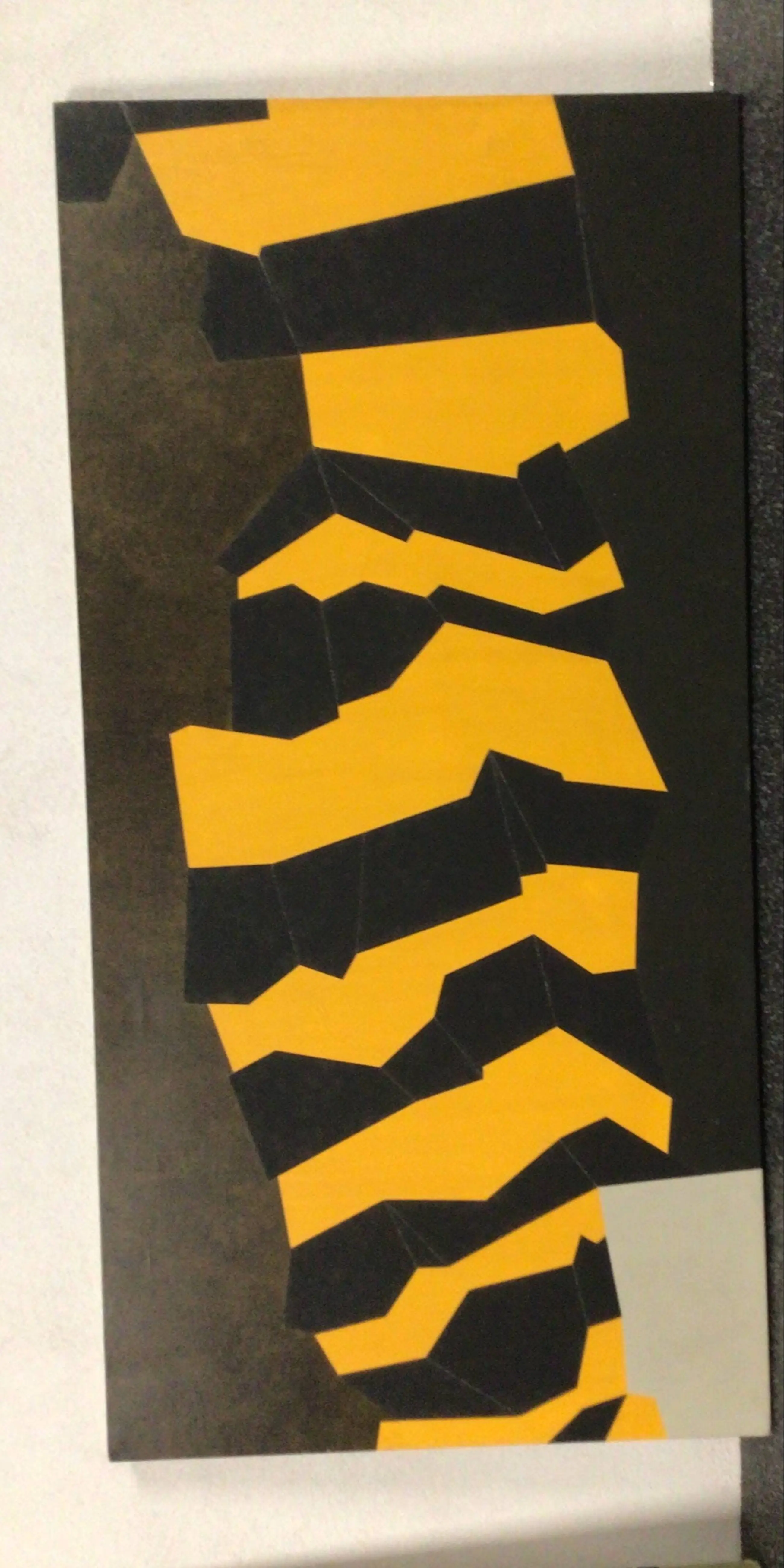 Het werk is getiteld ‘Clifden 3’ No 4 en gesigneerd met potlood. Het jaartal is ‘76. Wezenlijke kleuren in dit werk zijn donkerbruin, zwart en geel op houten raamwerk gespannen.